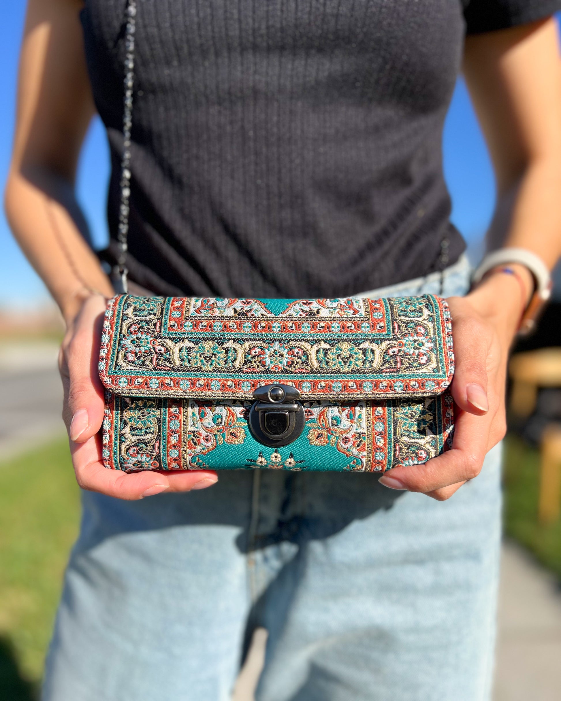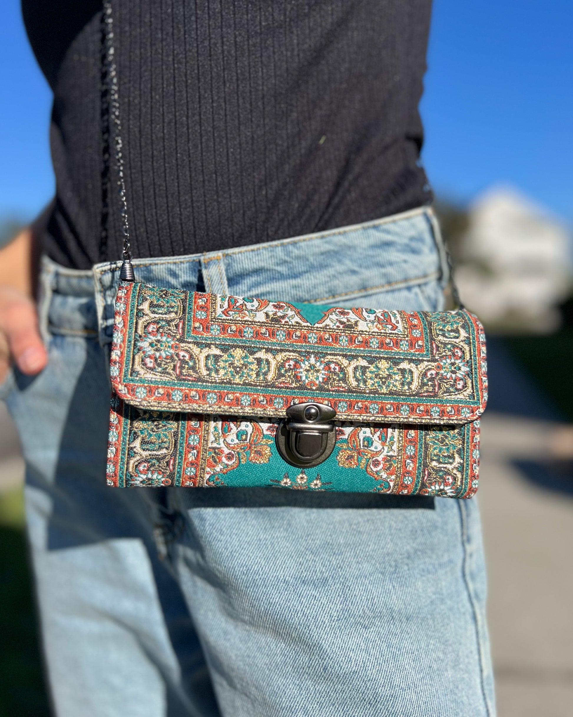 This Boho crossbody bag is made of Turkish carpet patterned brocade fabric and vegan leather. It has a metal clasp and metal chain. It can be used as a trifold wallet when you take the chain out.