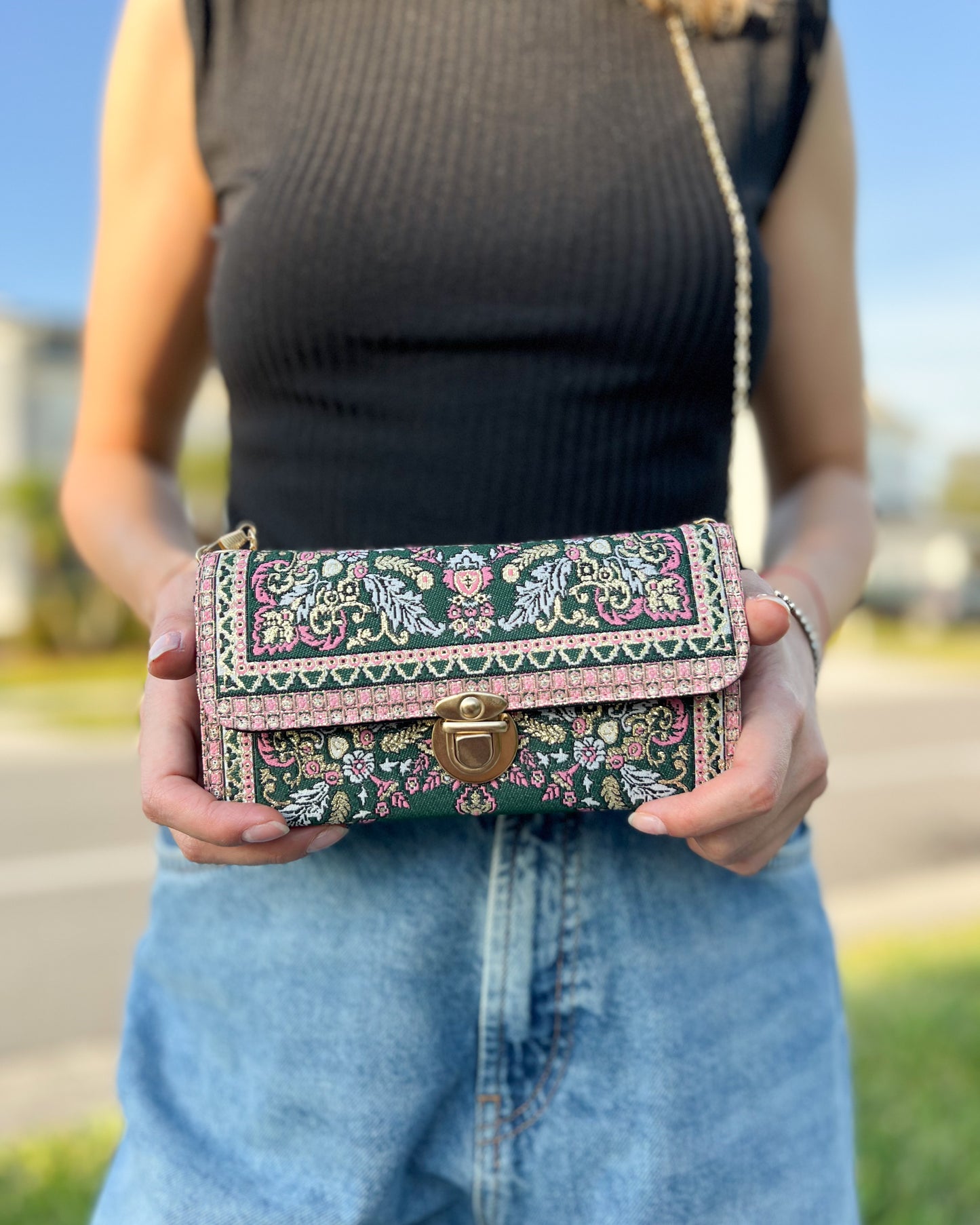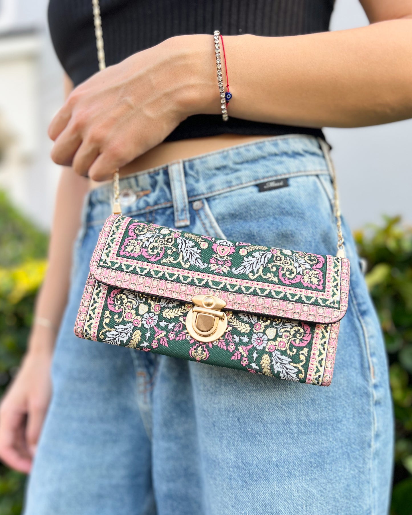 This Boho crossbody bag is made of Turkish carpet patterned brocade fabric and vegan leather. It has a metal clasp and metal chain. It can be used as a trifold wallet when you take the chain out.