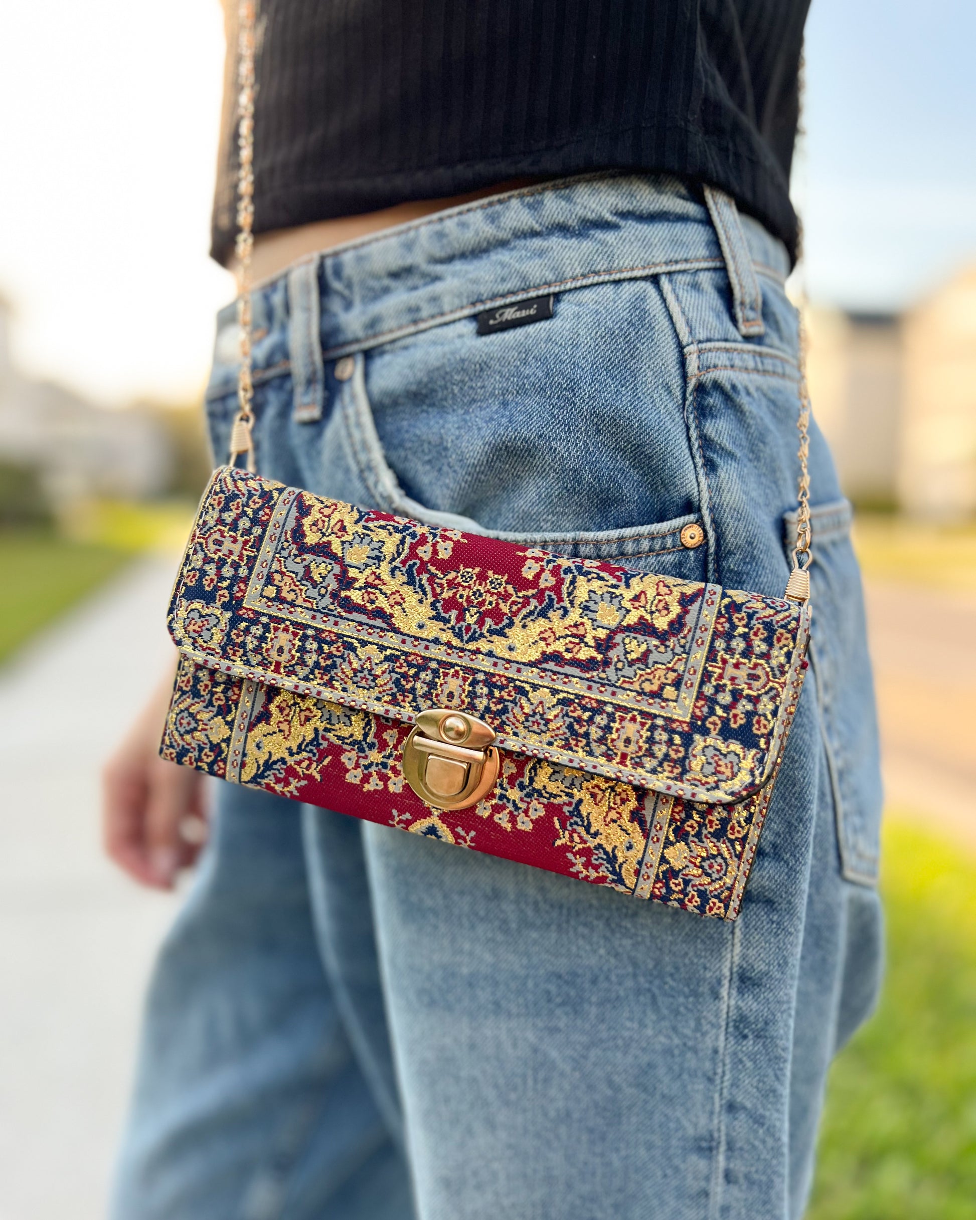 This Boho crossbody bag is made of Turkish carpet patterned brocade fabric and vegan leather. It has a metal clasp and metal chain. It can be used as a trifold wallet when you take the chain out.