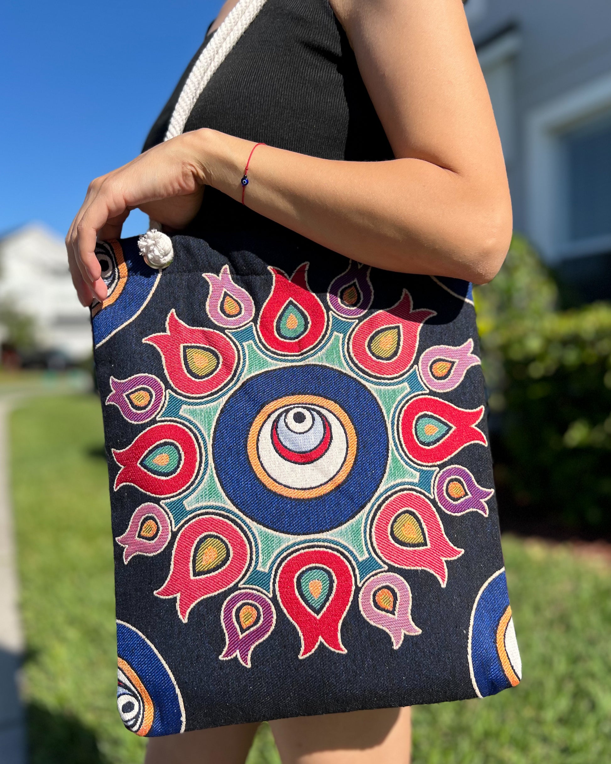 Crafted from premium woven fabric, our tote bag showcases a unique threaded design not printed. Our woven tote bag effortlessly transitions from day to night, complementing any outfit or any occasion.