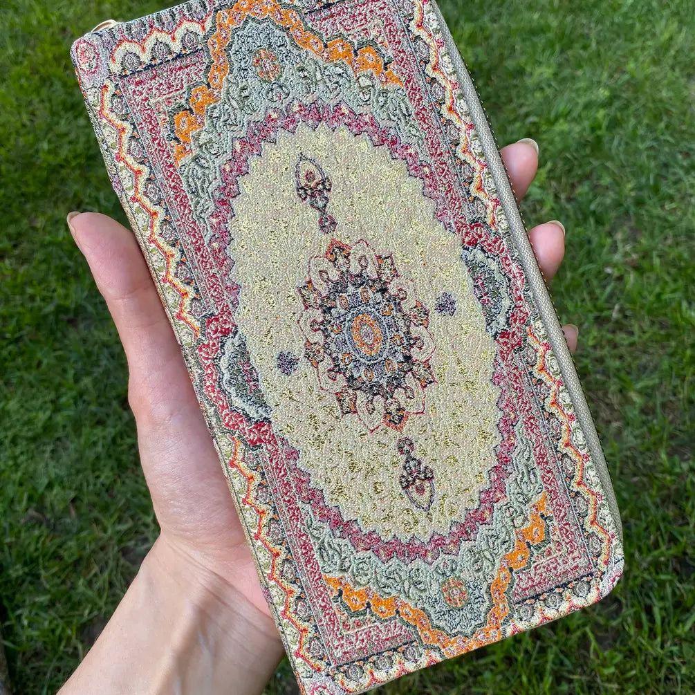 This slim wallet is made of Turkish carpet patterned brocade fabric and vegan leather. This cute wallet can keep 12 cards. It has a zipper pocket for coins and It can also fit a cell phone.