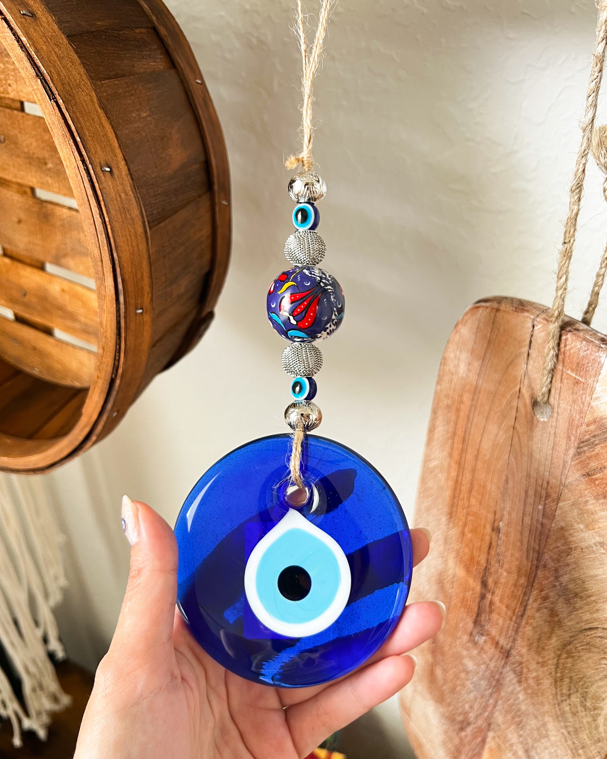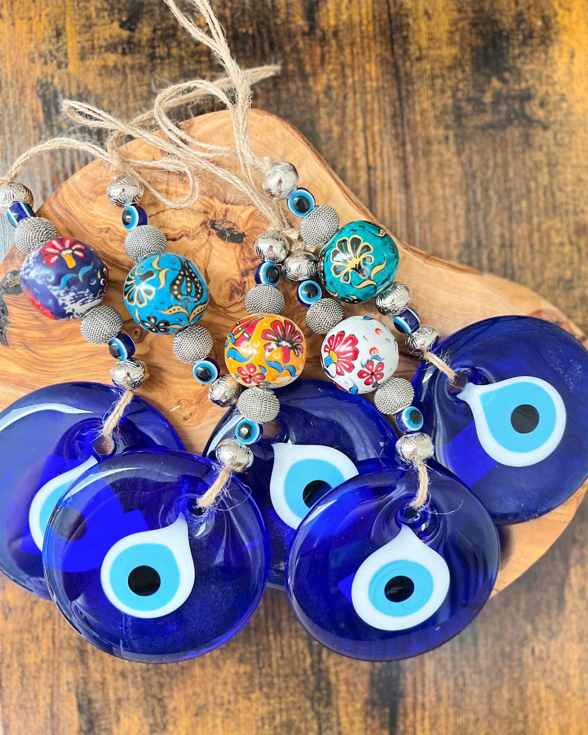 This evil eye wall hanging is made of glass evil eye and ceramic hand painted globe. Sold as pack of 3 with different varieties.