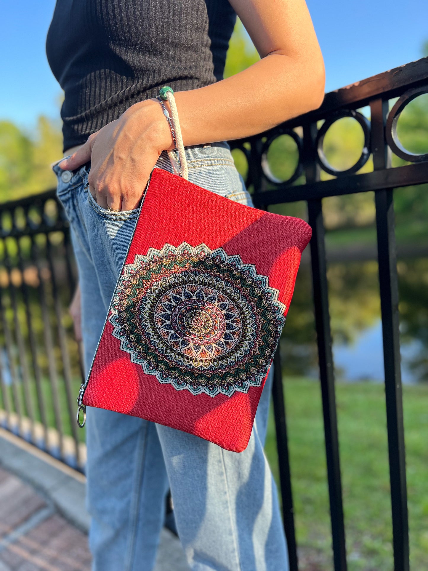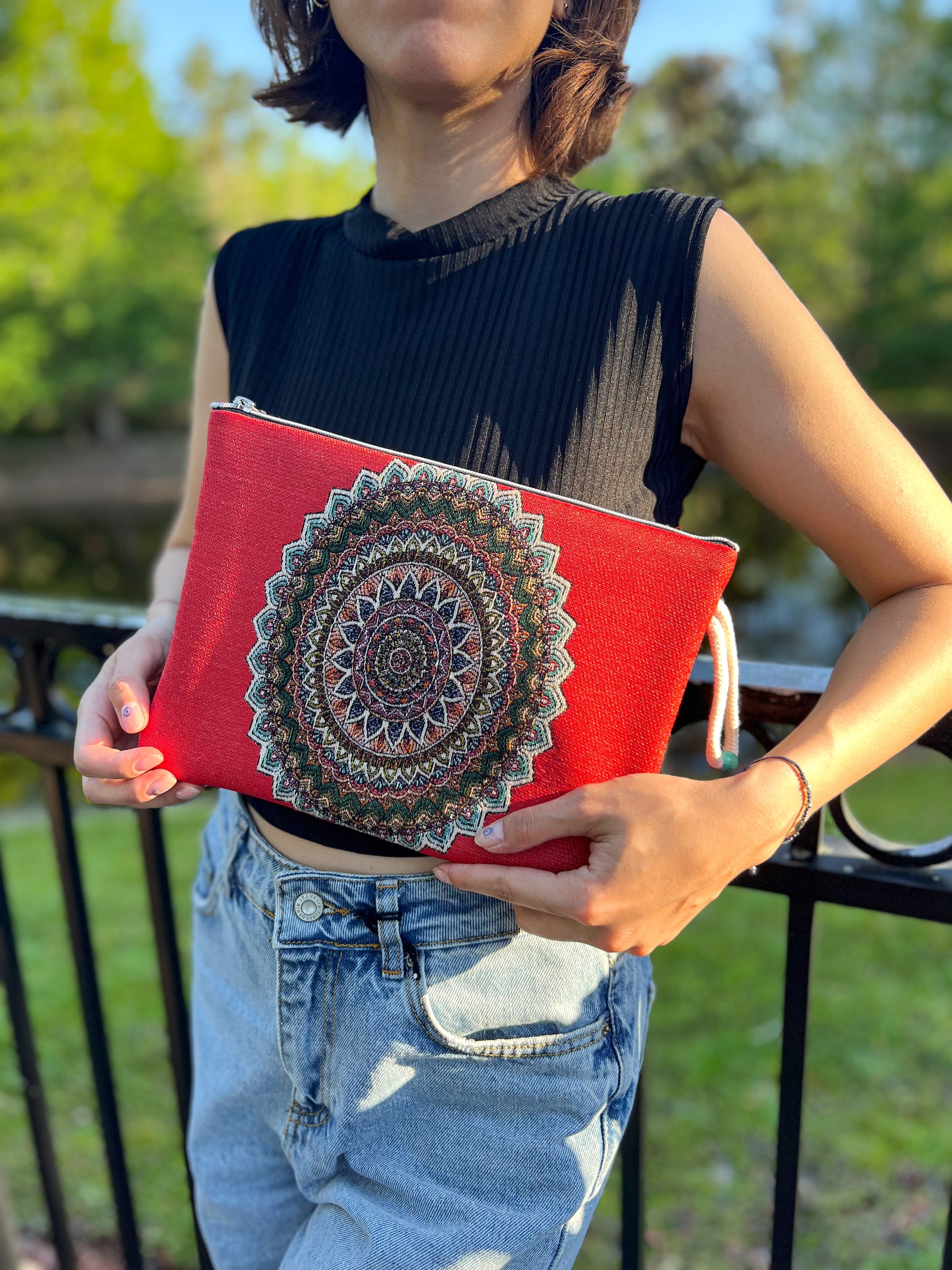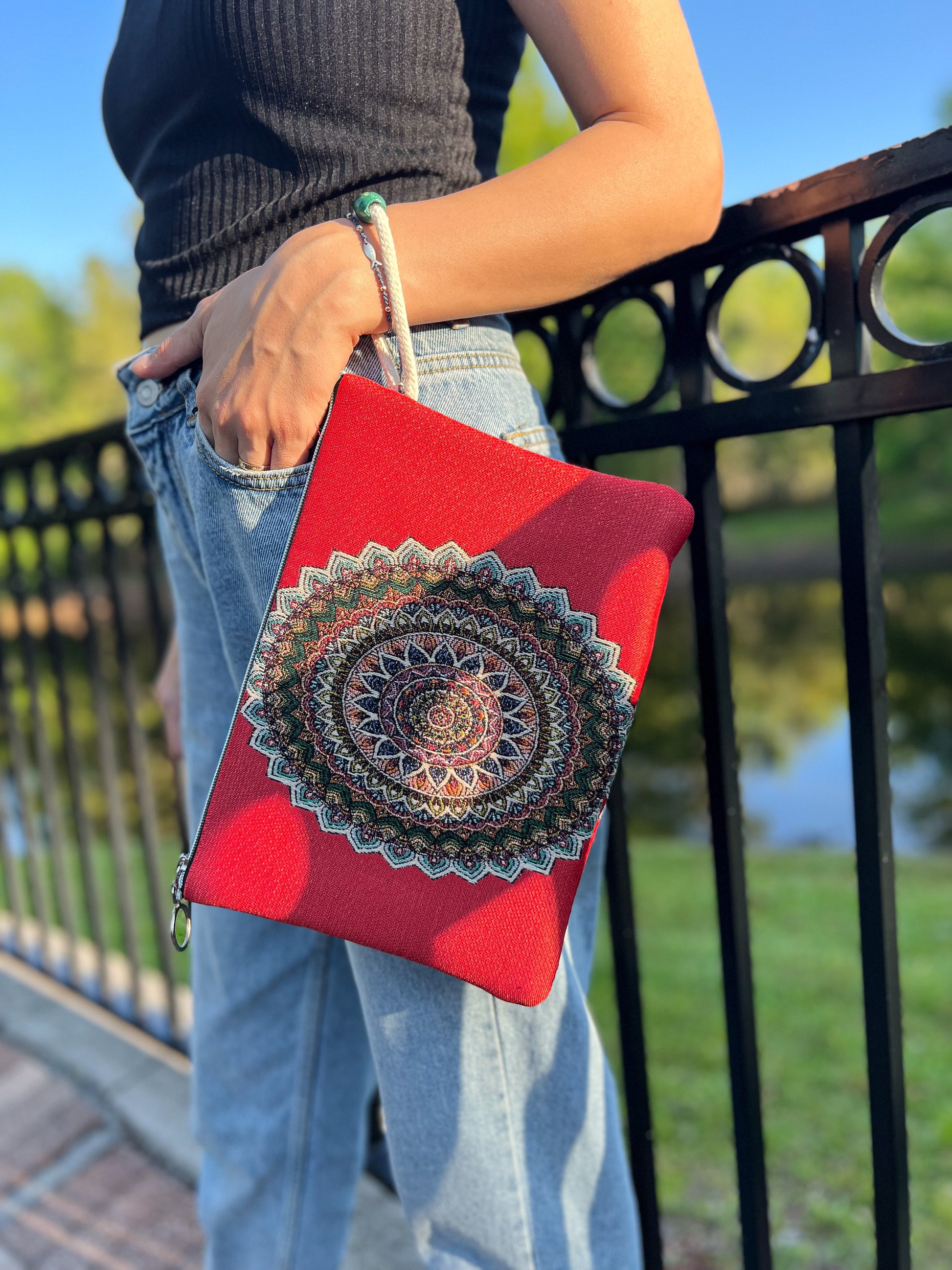 Mandala Design Handmade Clutch Bag, Boho Wallet with Wristlet