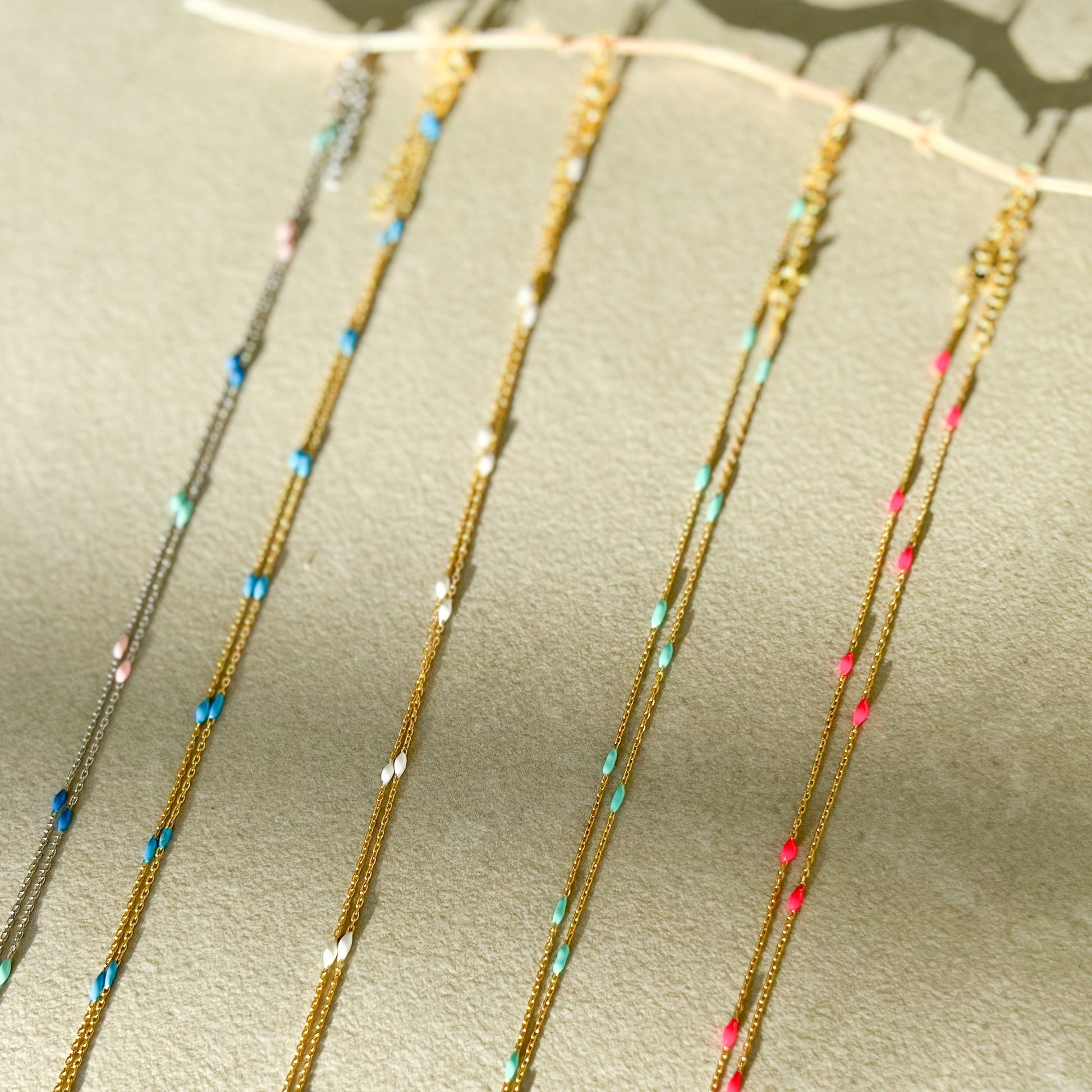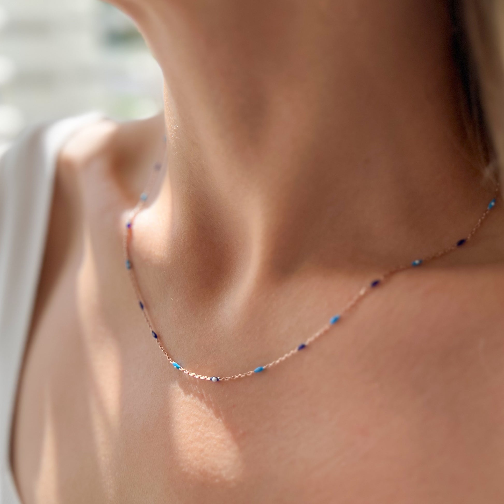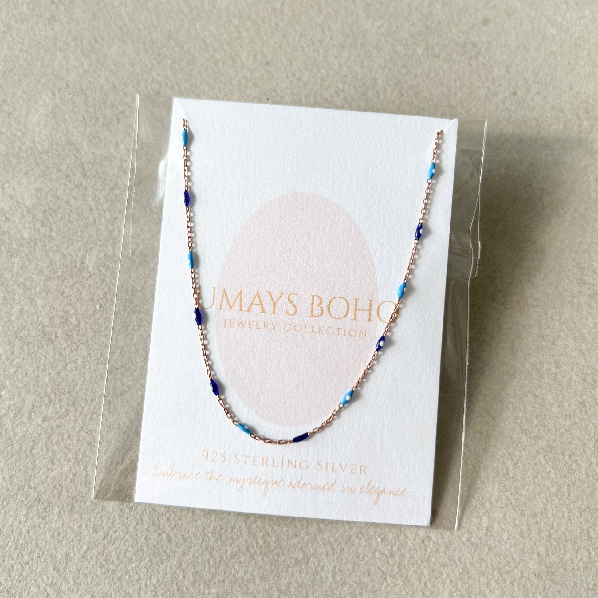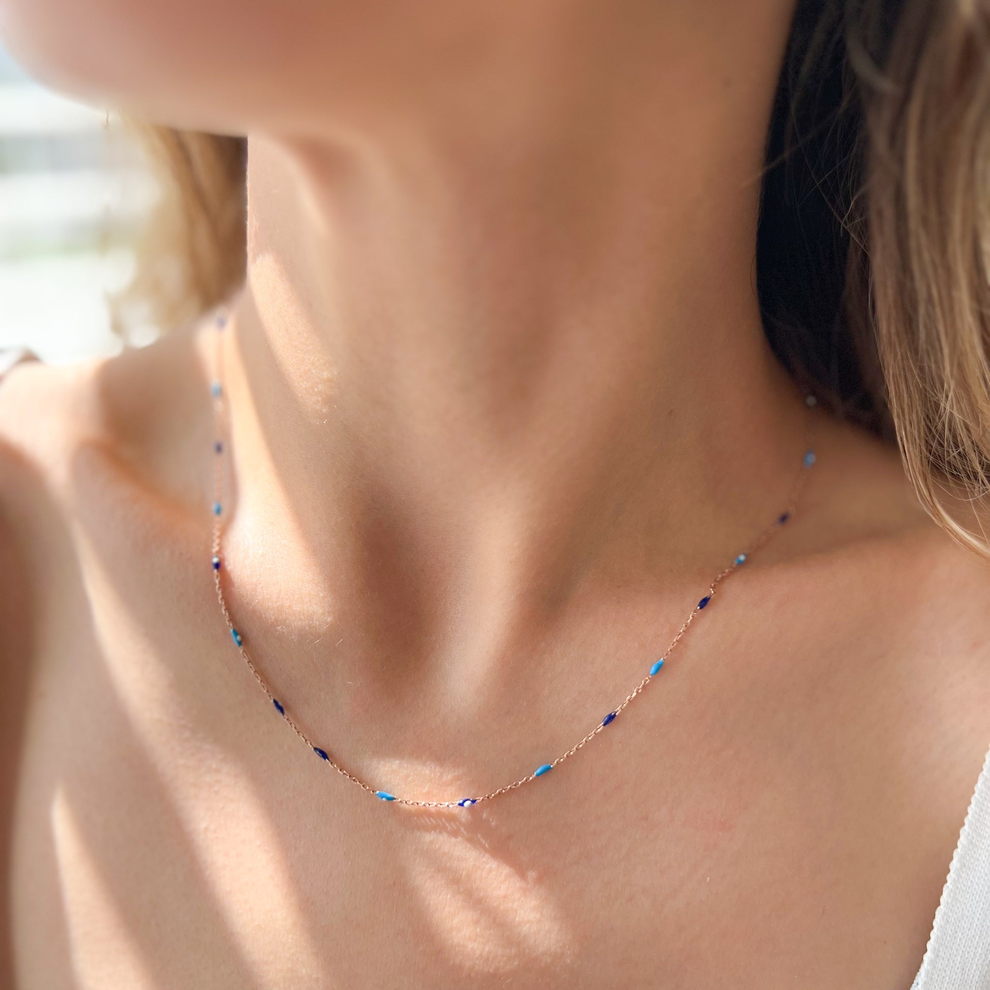 ♥️This 925-sterling silver necklace, gold plated for a touch of shine, is perfect for those who love a minimalist style. With the colorful bead details these chain chokers are just very fun, elegant and unique piece that's sure to stand out. The chain size is adjustable, so it fits just right for anyone. Their minimalist nature complements nearly any outfit.