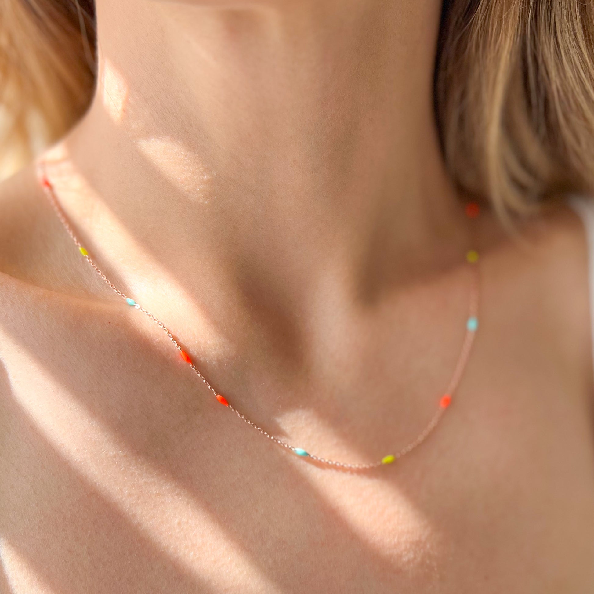 ♥️This 925-sterling silver necklace, gold plated for a touch of shine, is perfect for those who love a minimalist style. With the colorful bead details these chain chokers are just very fun, elegant and unique piece that's sure to stand out. The chain size is adjustable, so it fits just right for anyone. Their minimalist nature complements nearly any outfit.