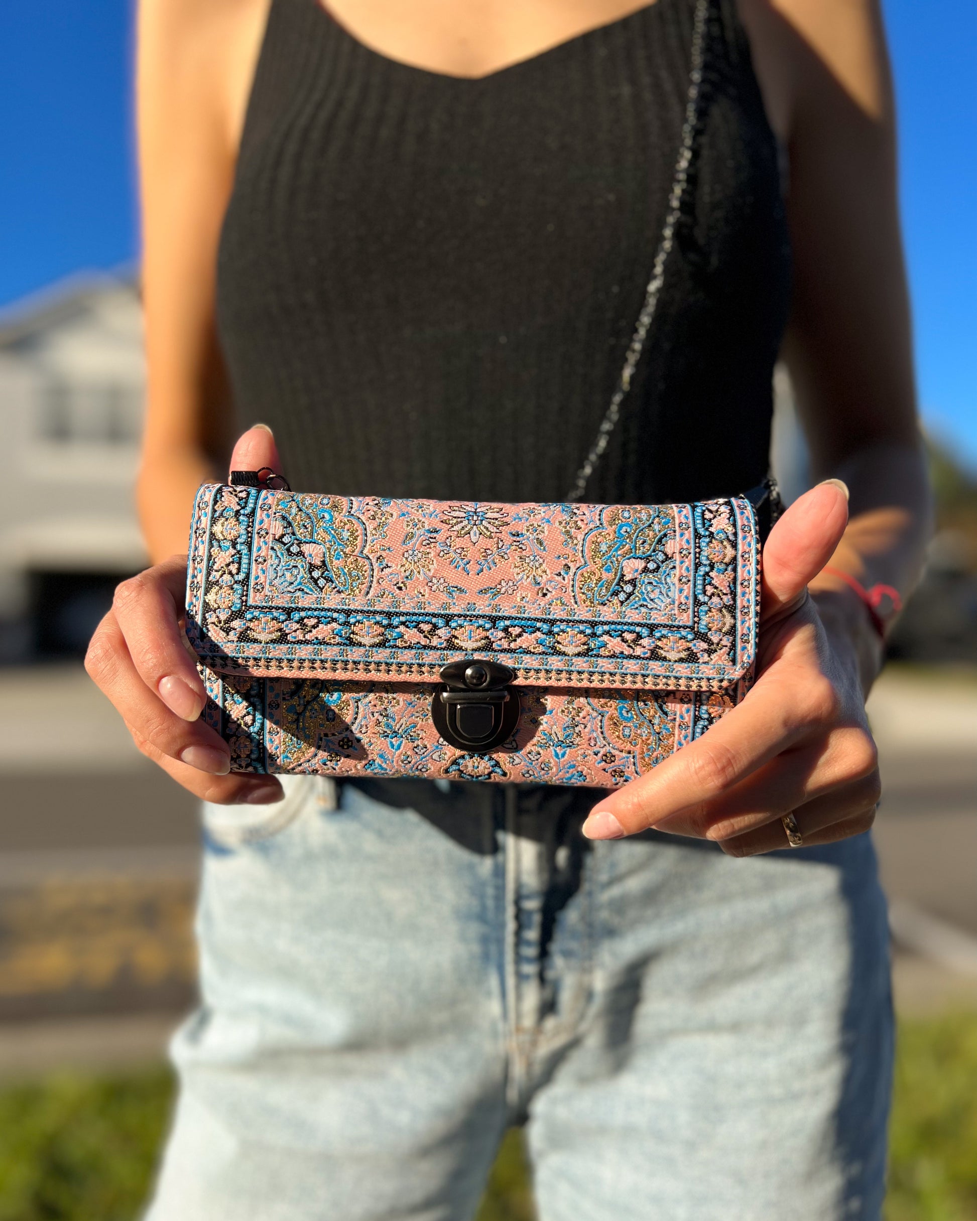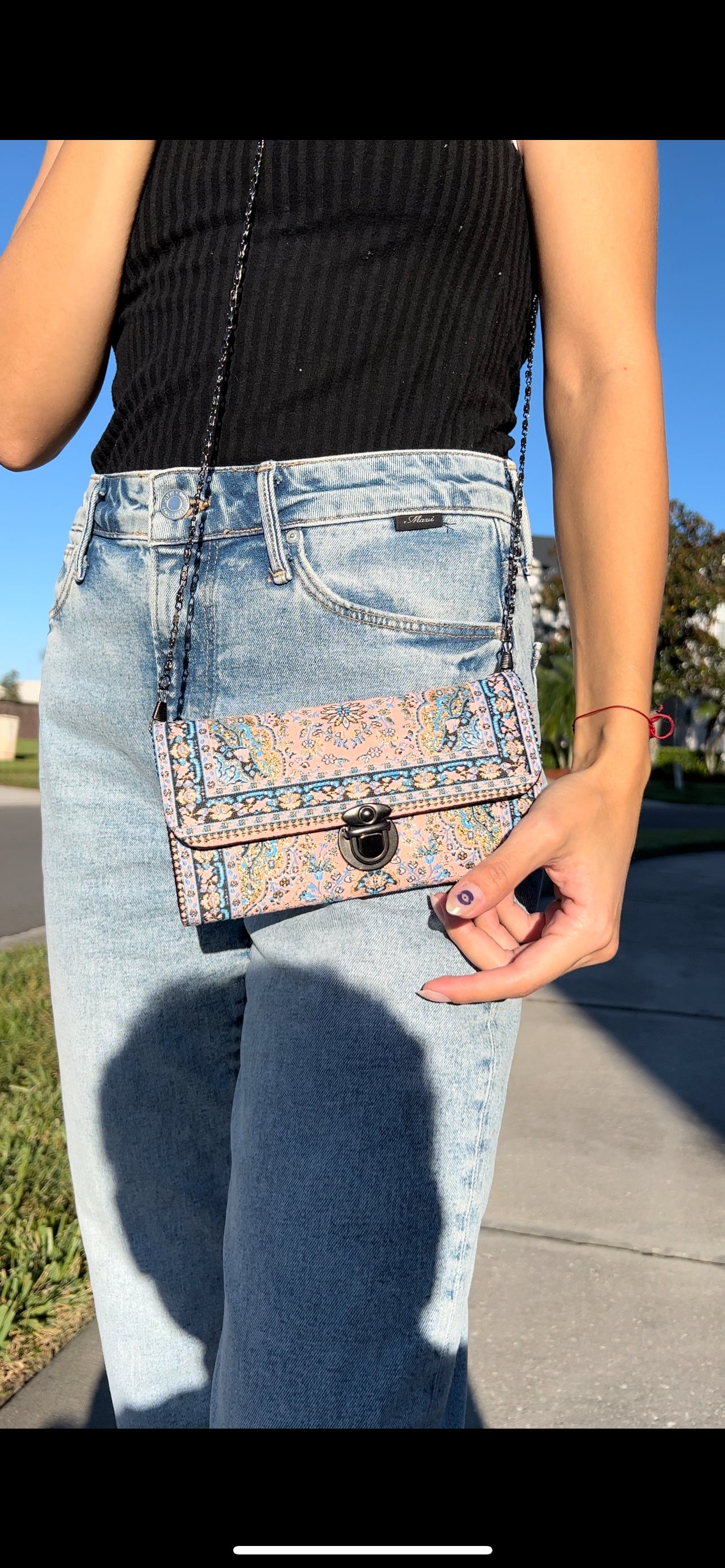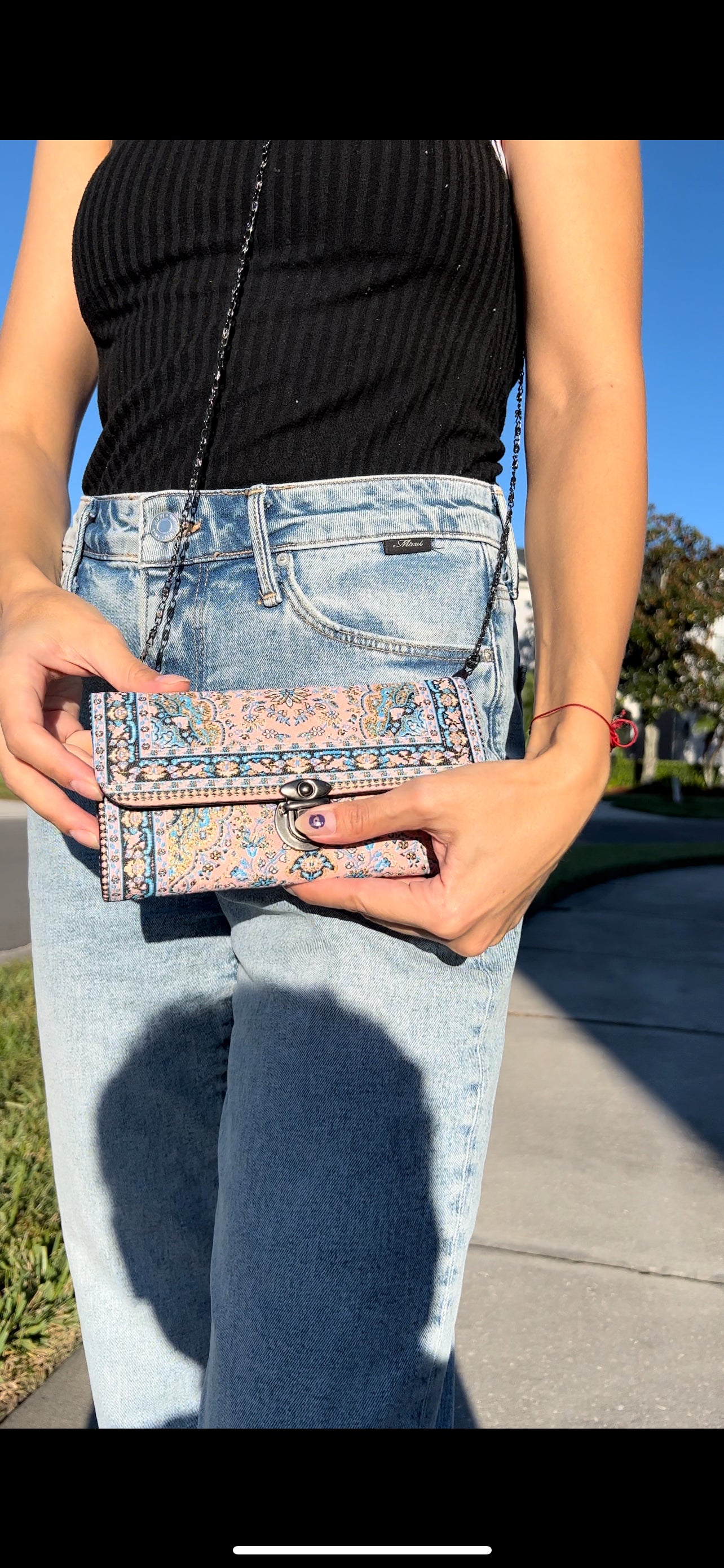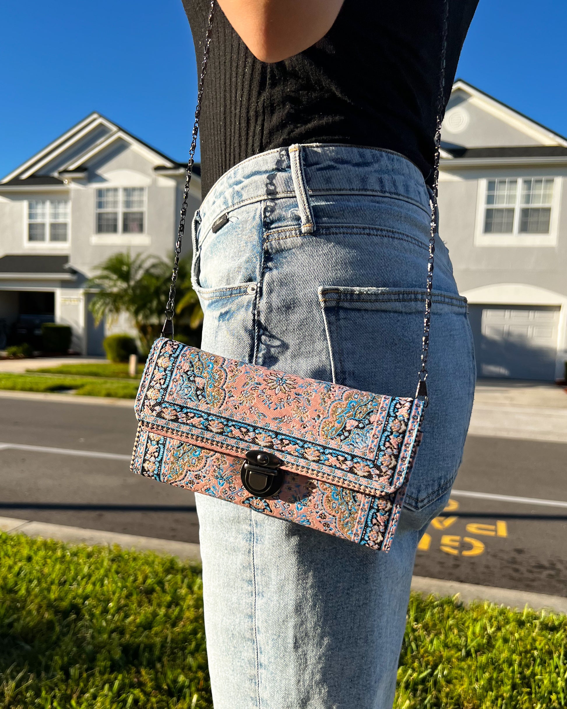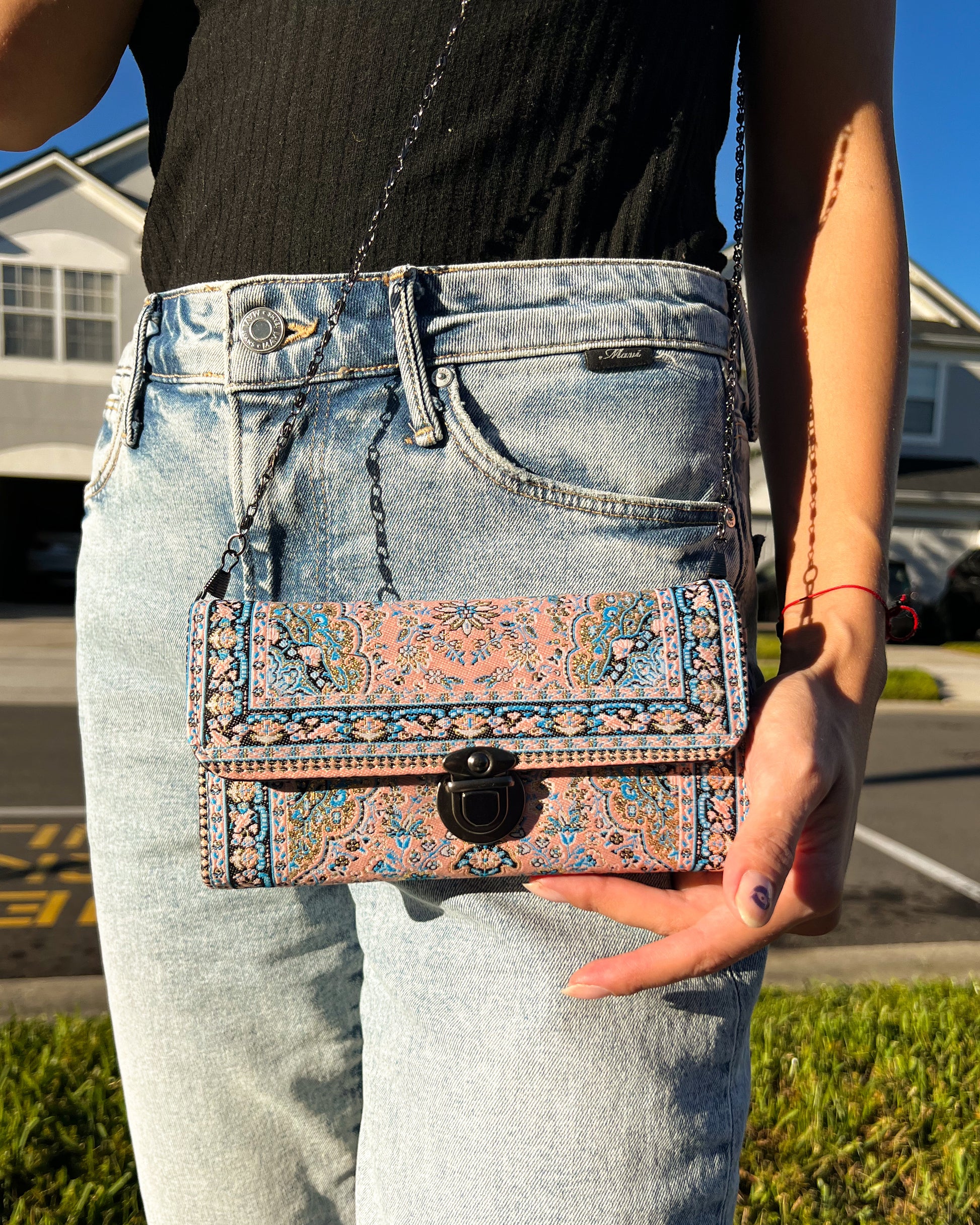 This Boho crossbody bag is made of Turkish carpet patterned brocade fabric and vegan leather. It has a metal clasp and metal chain. It can be used as a trifold wallet when you take the chain out.