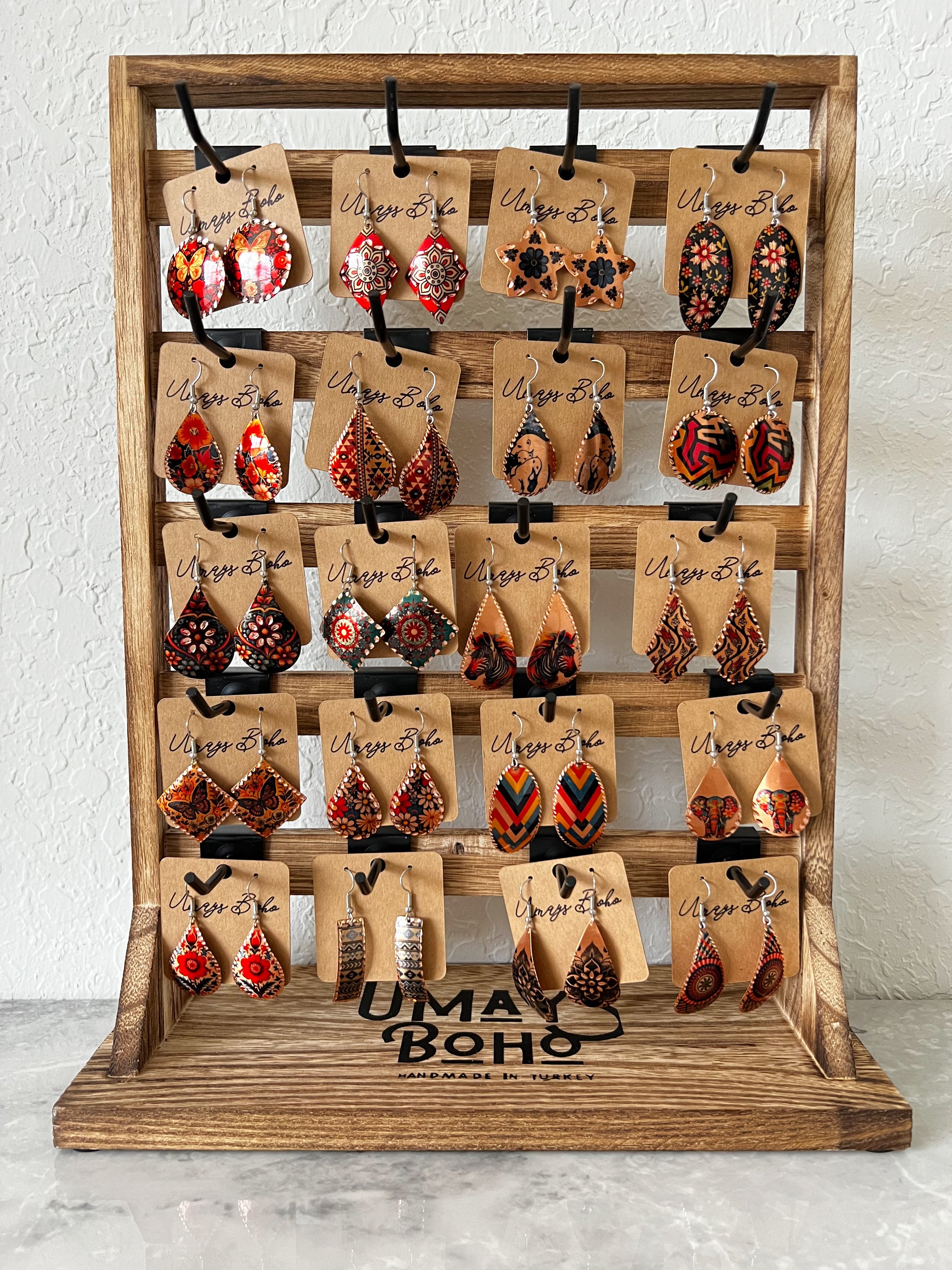 These cute handmade earrings are made from copper. Our earrings are handcrafted by artisans in Turkey. There are over 100 different designs and over 10 different shapes. We will be sending them assorted with earring cards.