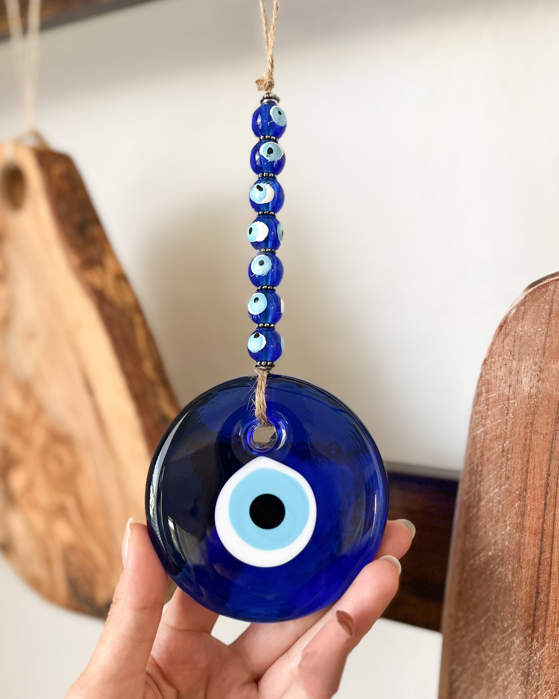 Our glass evil eye wall hanging is made from solid blue glass, it’s got that classic, deep cobalt color that really stands out. In Turkey, you’ll find these protective symbols in almost every home, shop, and workplace, believed to ward off negative energy.