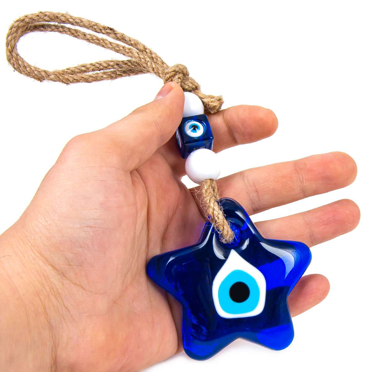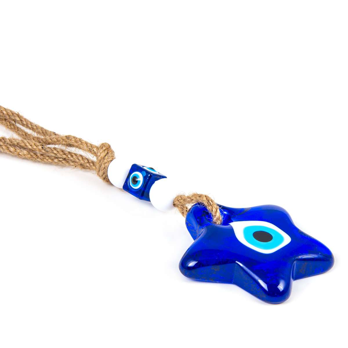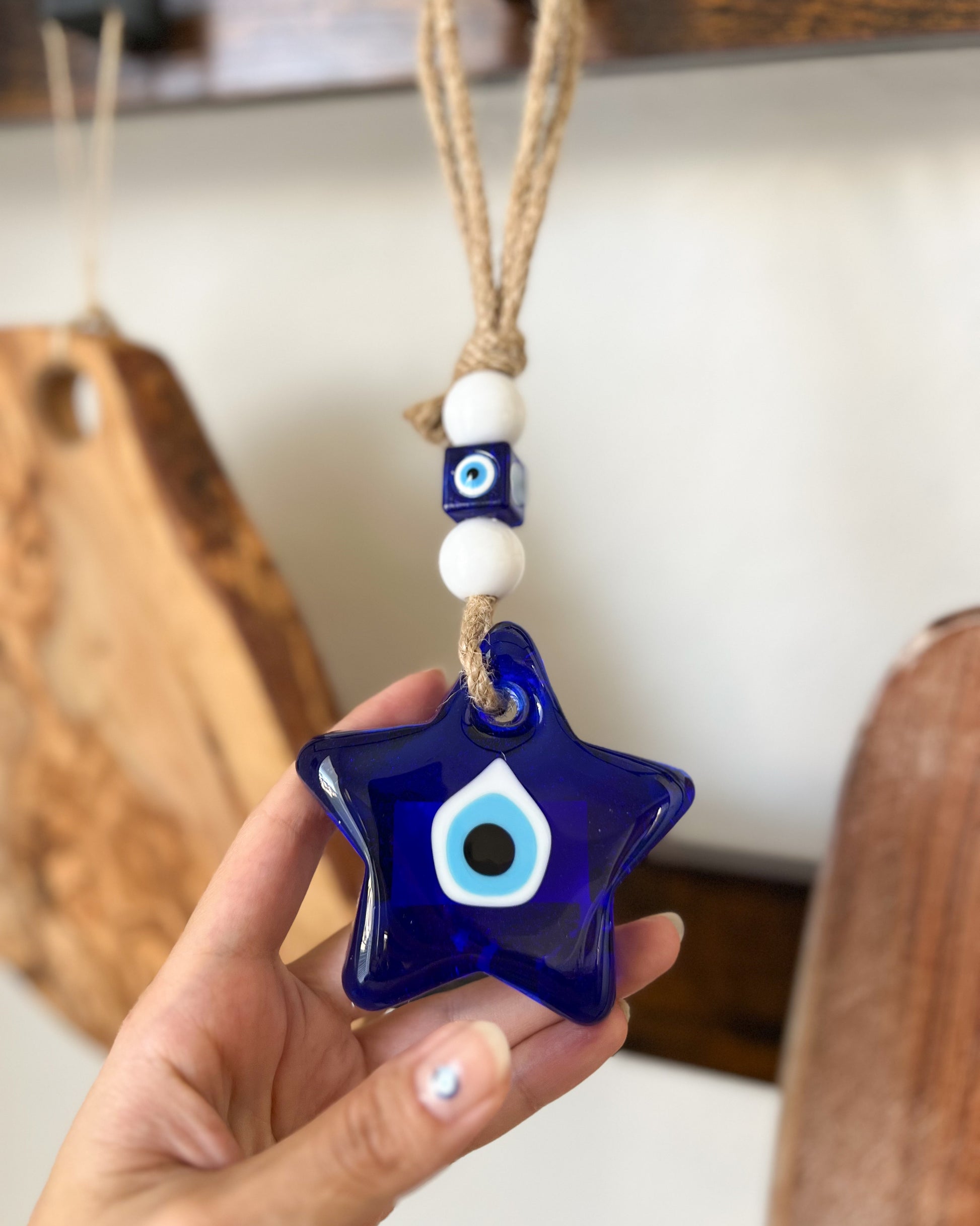 Our glass evil eye wall hanging is made from solid blue glass, it’s got that classic, deep cobalt color that really stands out. In Turkey, you’ll find these protective symbols in almost every home, shop, and workplace, believed to ward off negative energy.