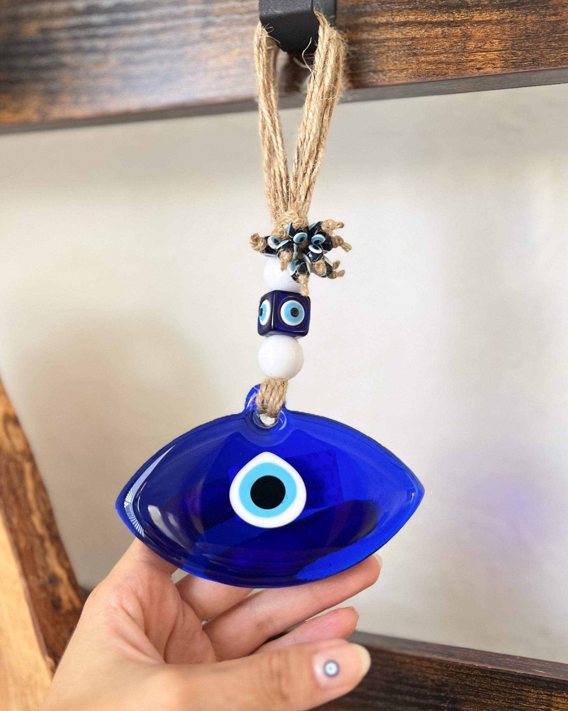 Our glass evil eye wall hanging is made from solid blue glass, it’s got that classic, deep cobalt color that really stands out. In Turkey, you’ll find these protective symbols in almost every home, shop, and workplace, believed to ward off negative energy.