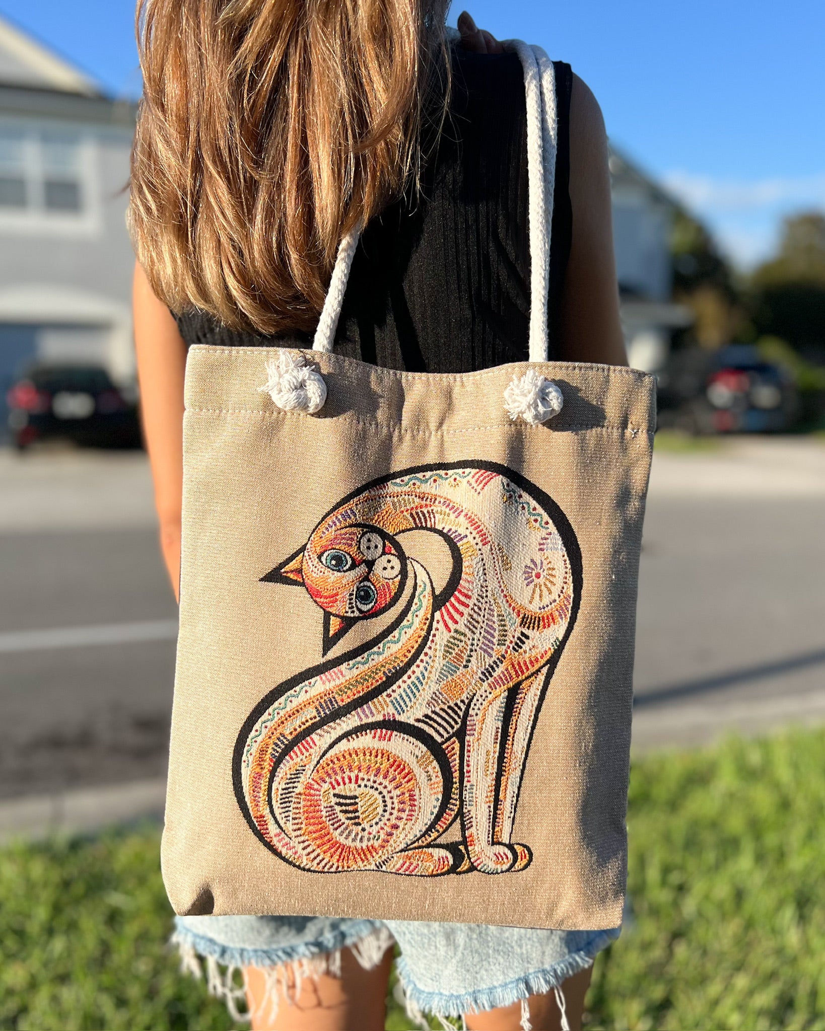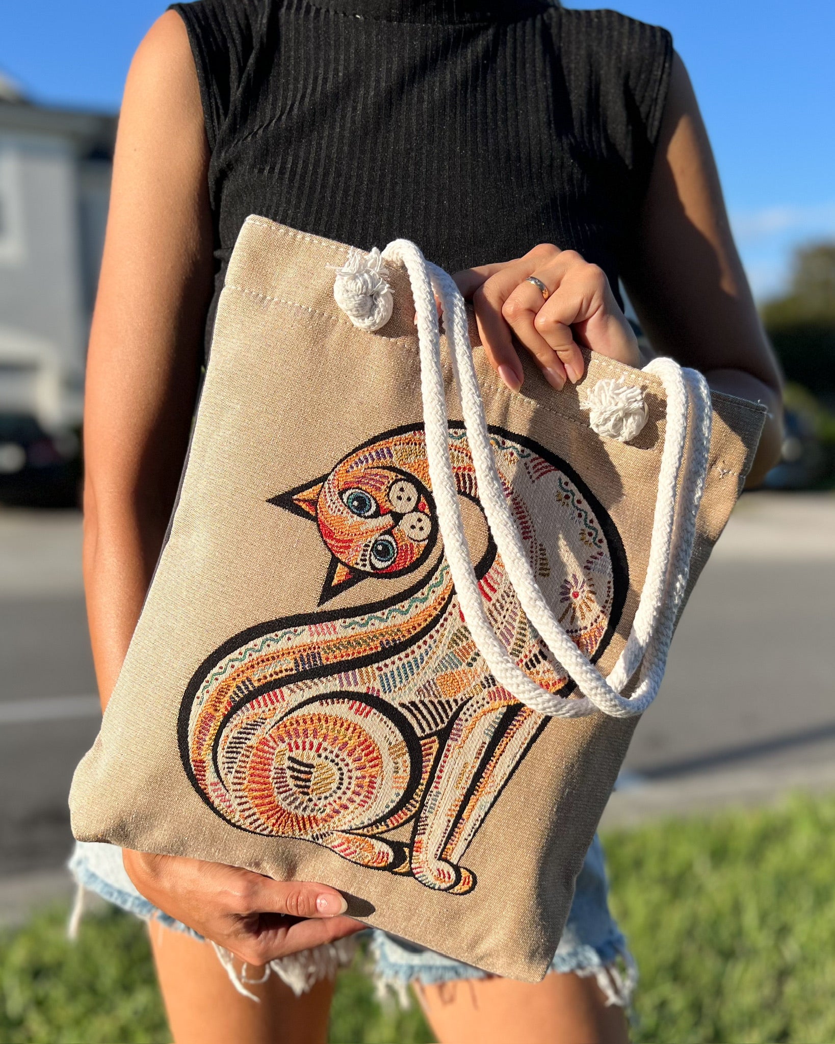 Cat Design Shoulder Bag, Woven Fabric Tote Bag
