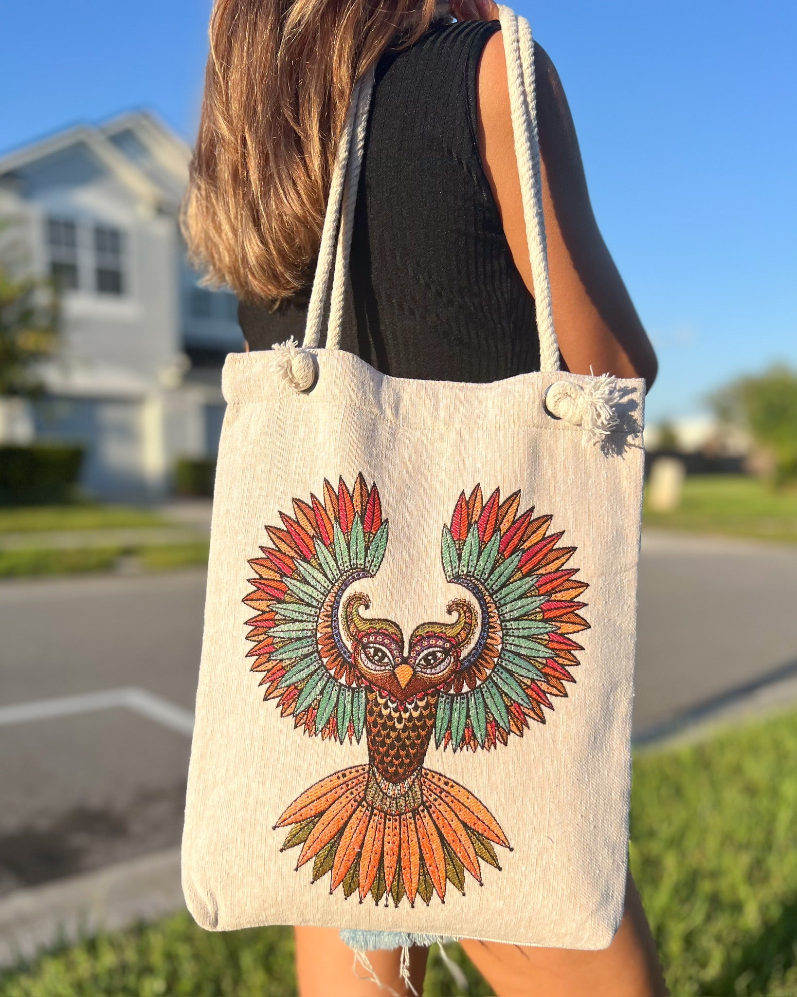 Crafted from premium woven fabric, our tote bag showcases a unique threaded design not printed. Our woven tote bag effortlessly transitions from day to night, complementing any outfit or any occasion.