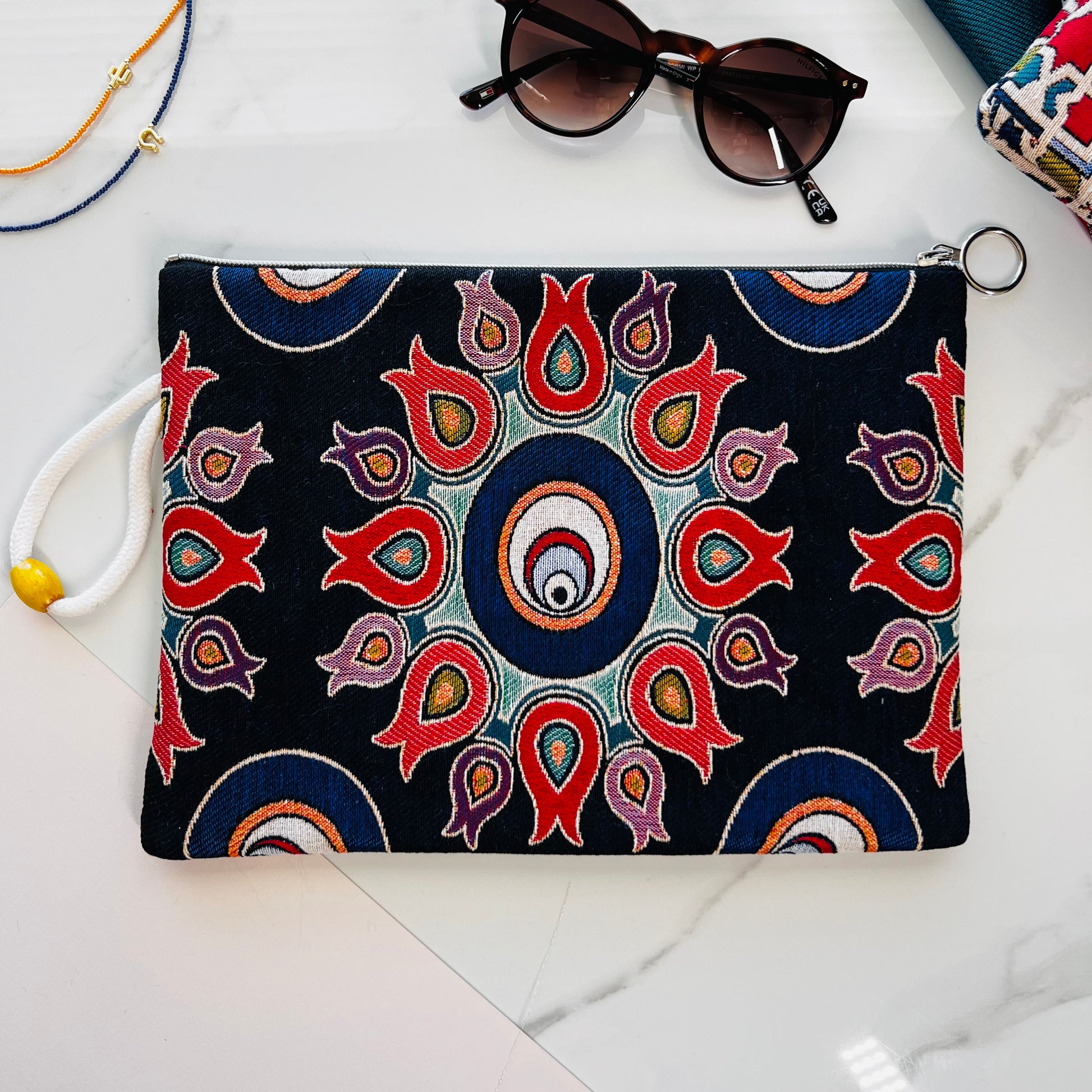 Our stylish and functional slim clutch for women, featuring captivating evil eye designs and thoughtful details. This versatile accessory is designed to complement your outfit while providing convenient storage for your essentials and even your iPad! With a sleek and slim profile, this clutch effortlessly fits into your hand or can be worn with the included wristlet for a hands-free option. The padded interior offers secure storage for your iPad and your cell phone, ensuring it stays protected from scratches and bumps while on the go.