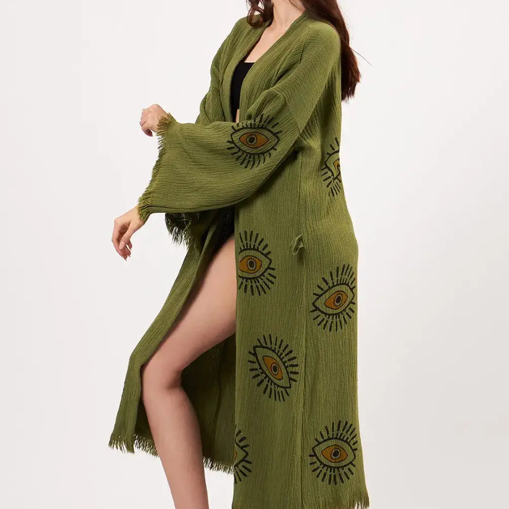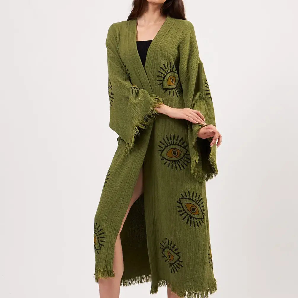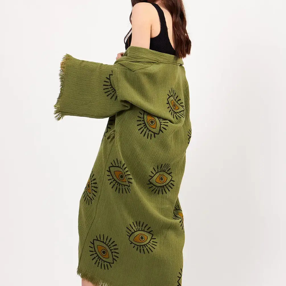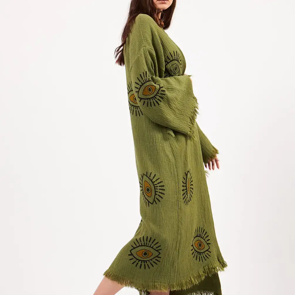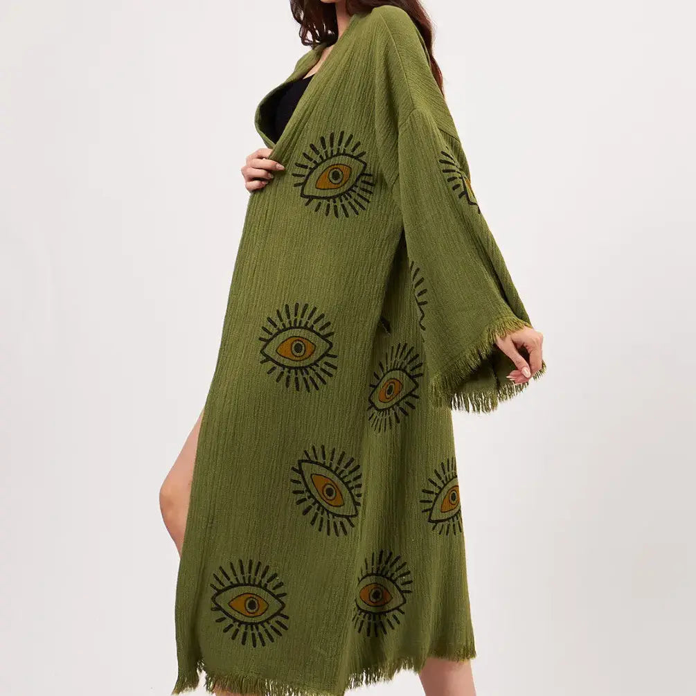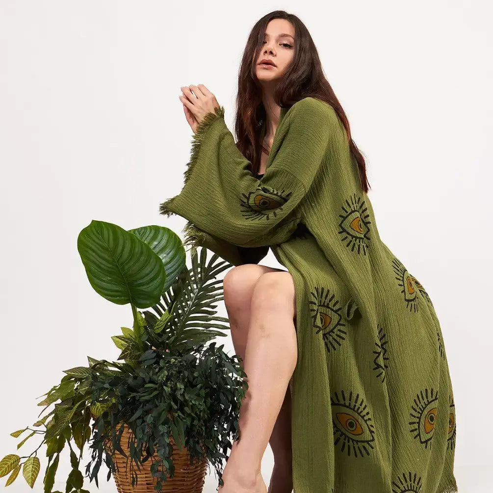 Green Evil Eye Kimono, Cotton Kaftan Kimono, Evil Eye Robes