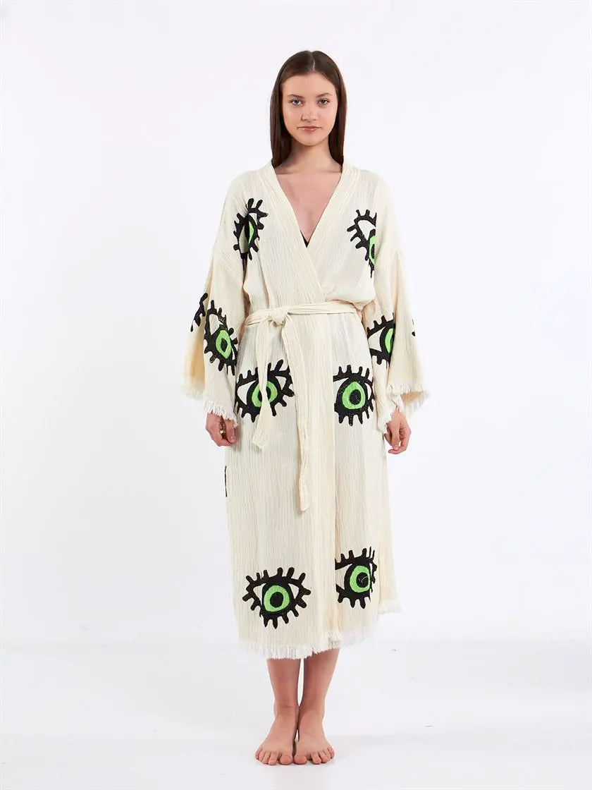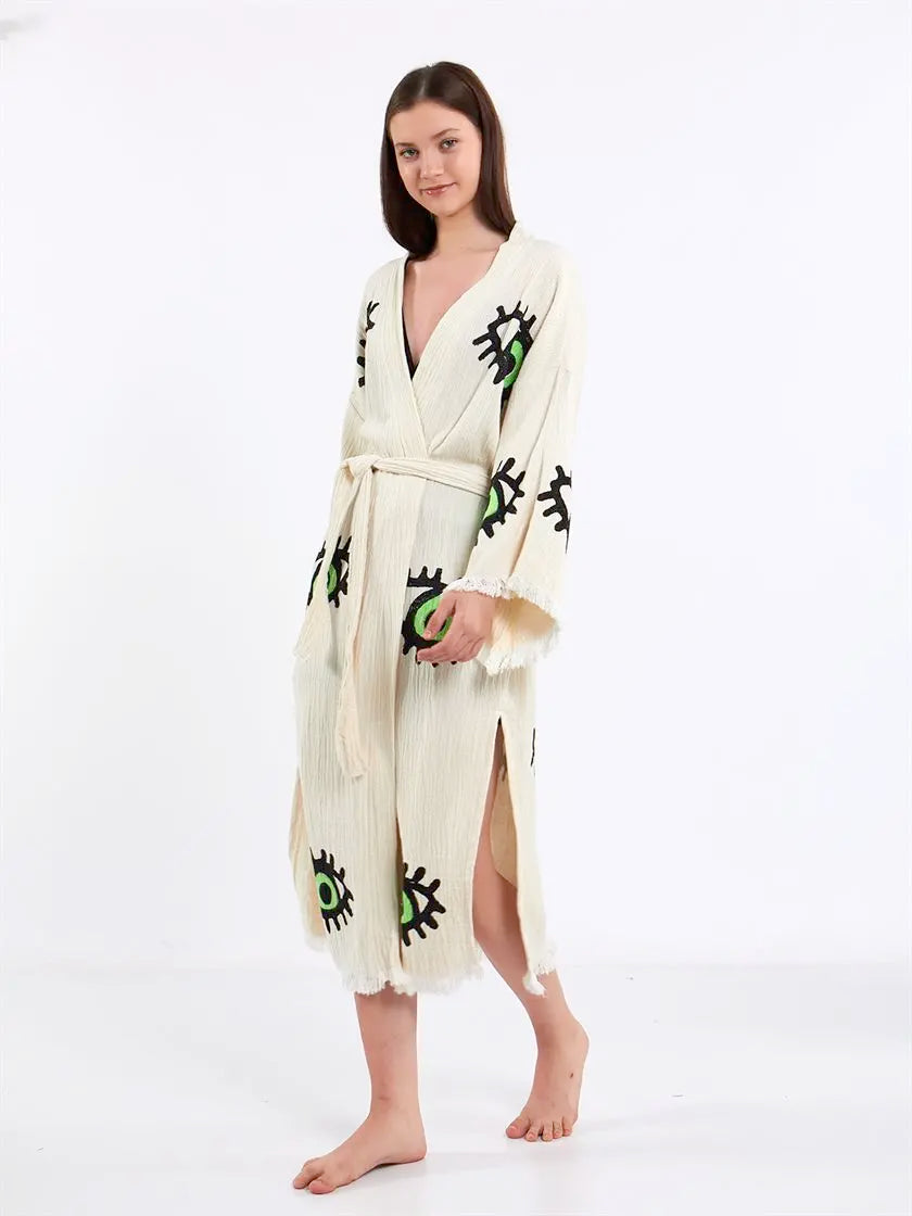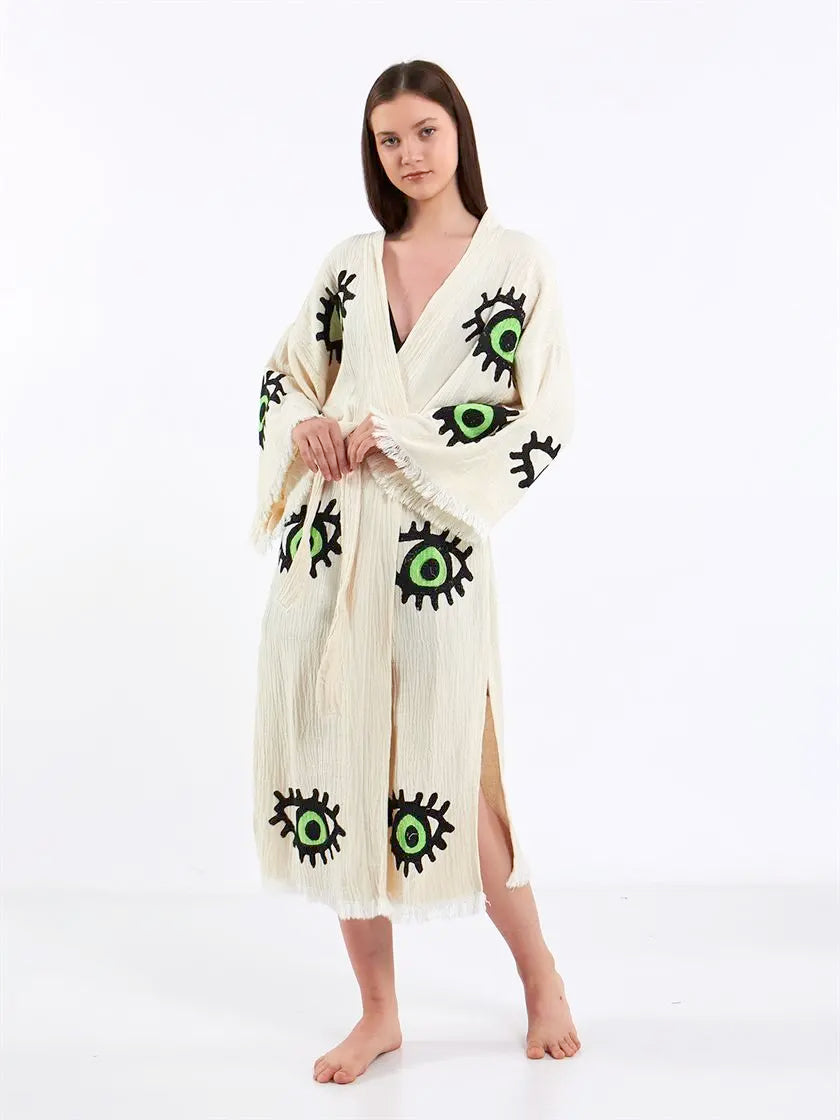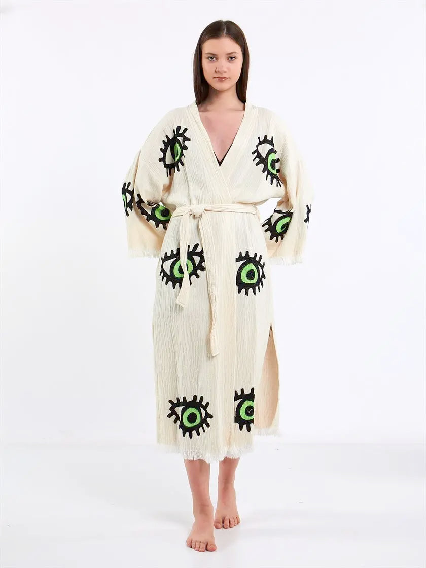 Green Eye Kimono, Turkish Cotton Robe, Long Kimono for Women