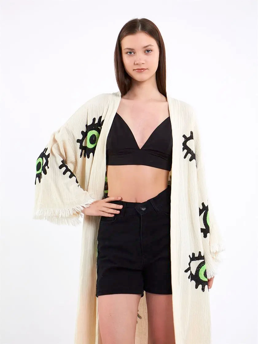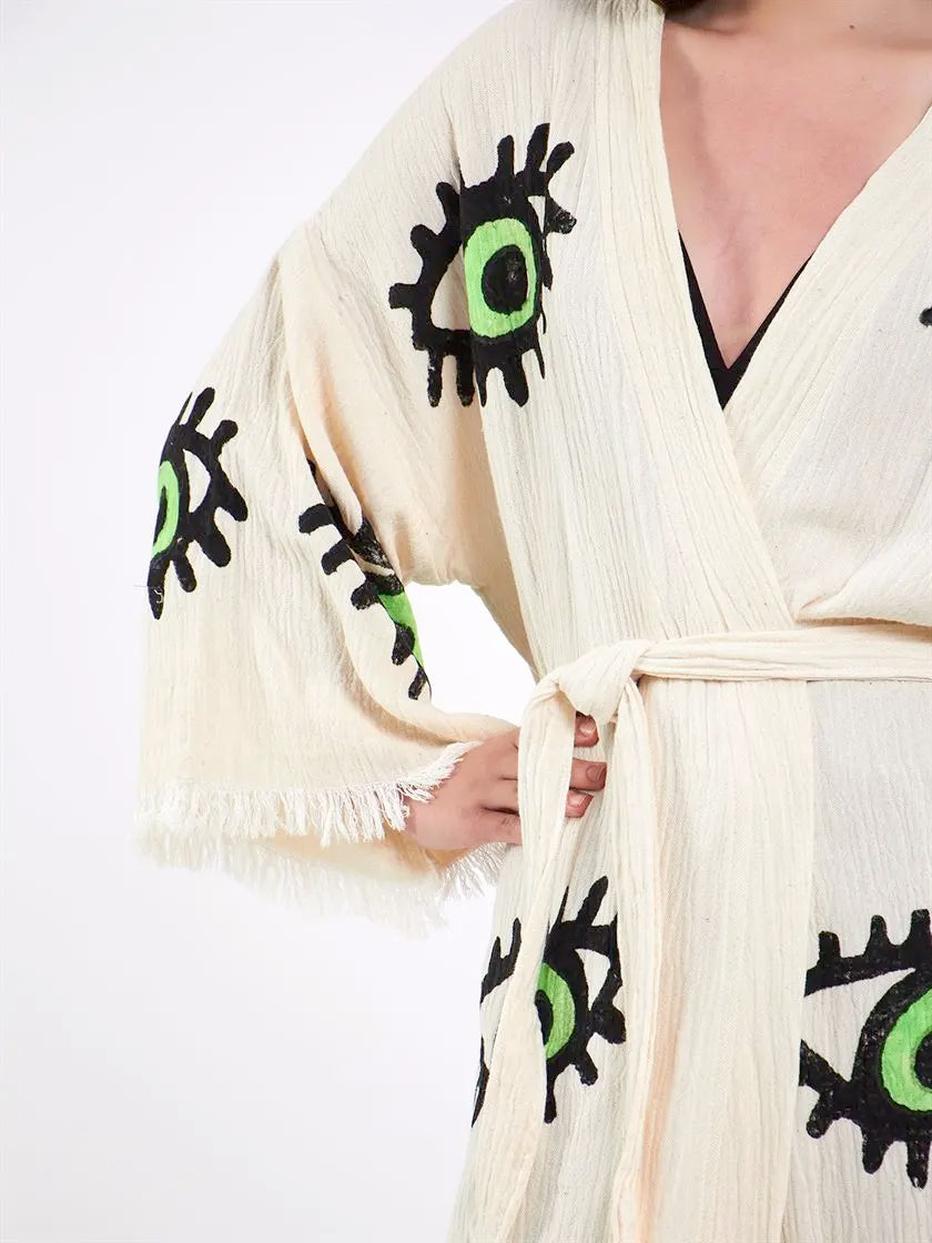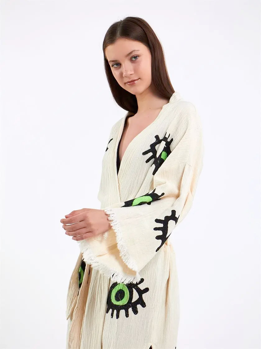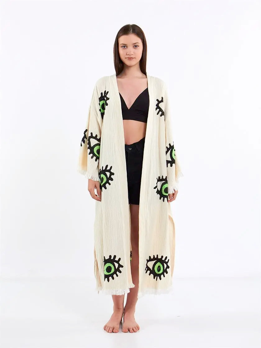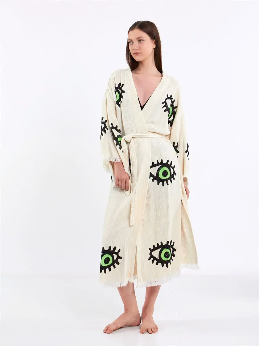 Green Eye Kimono, Turkish Cotton Robe, Long Kimono for Women