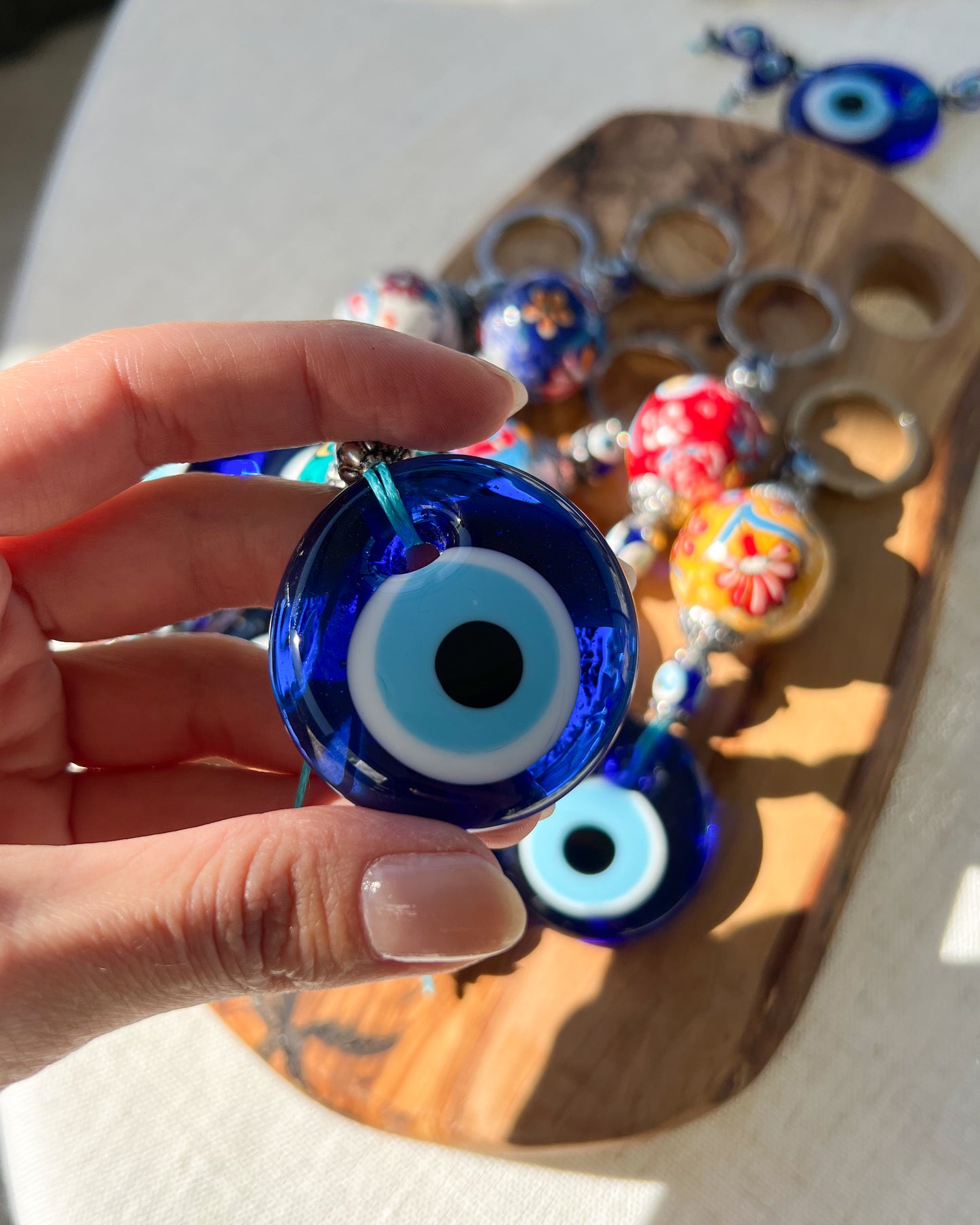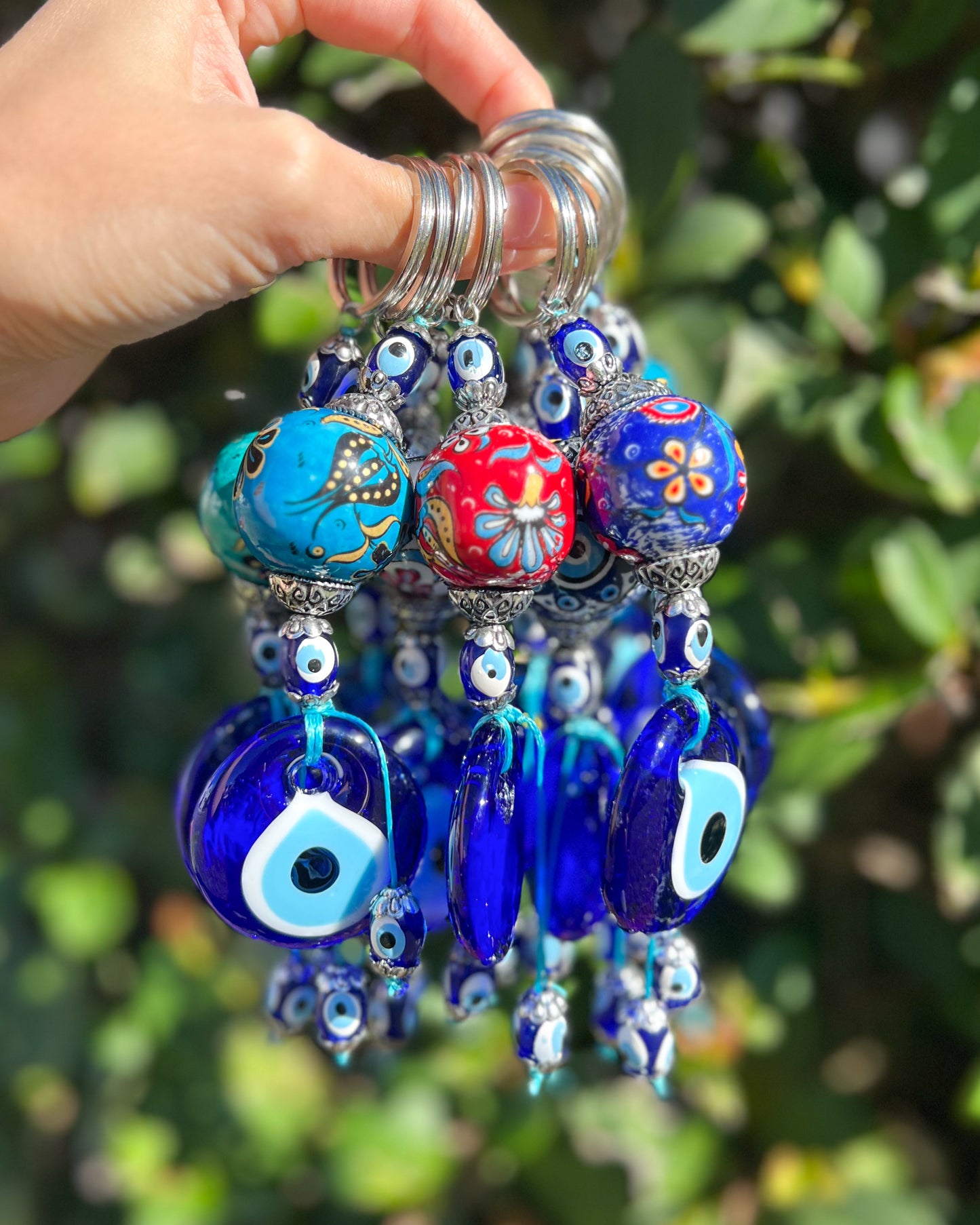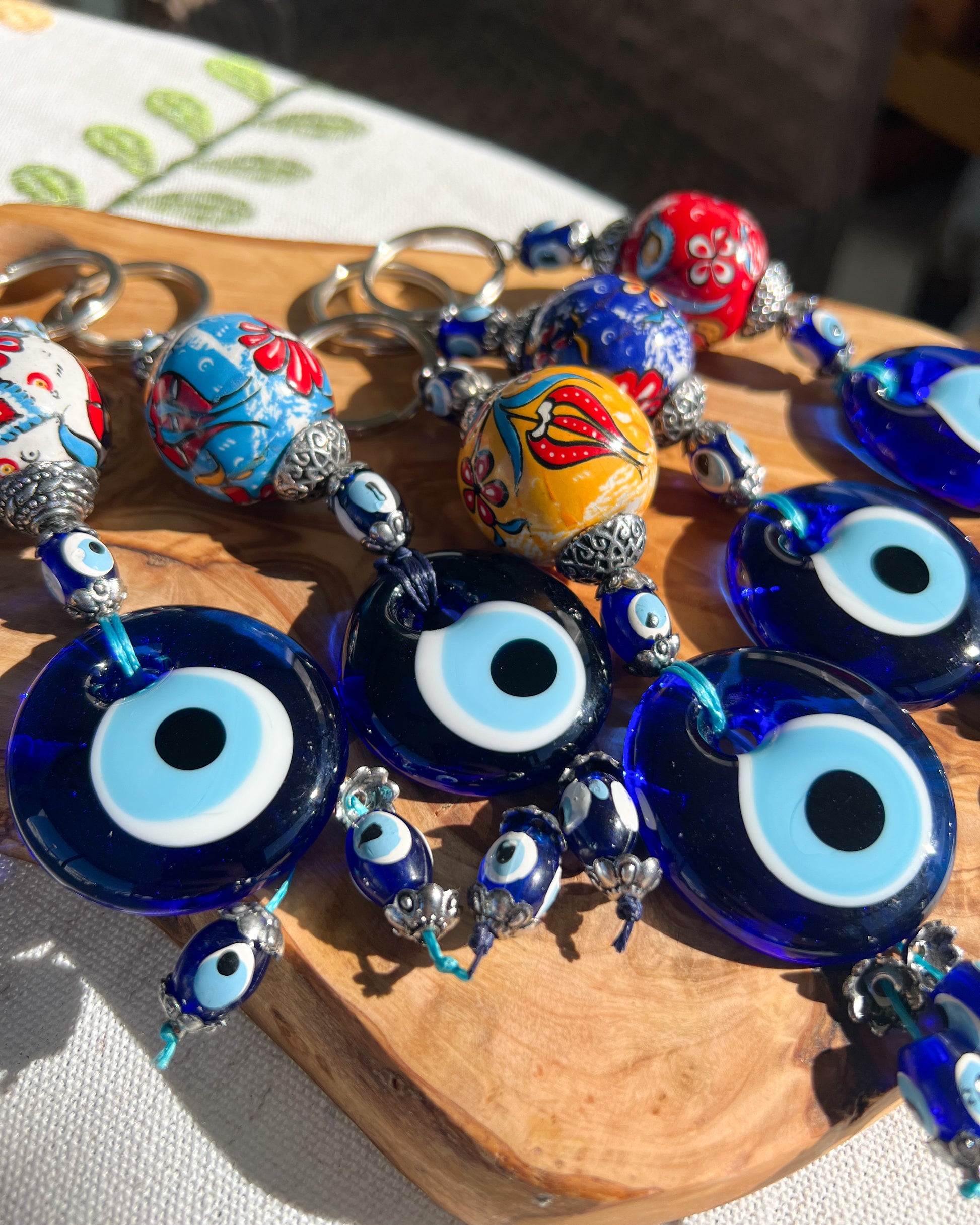 These keychains are made from glass evil eye beads, hand painted ceramic balls and waxed rope.