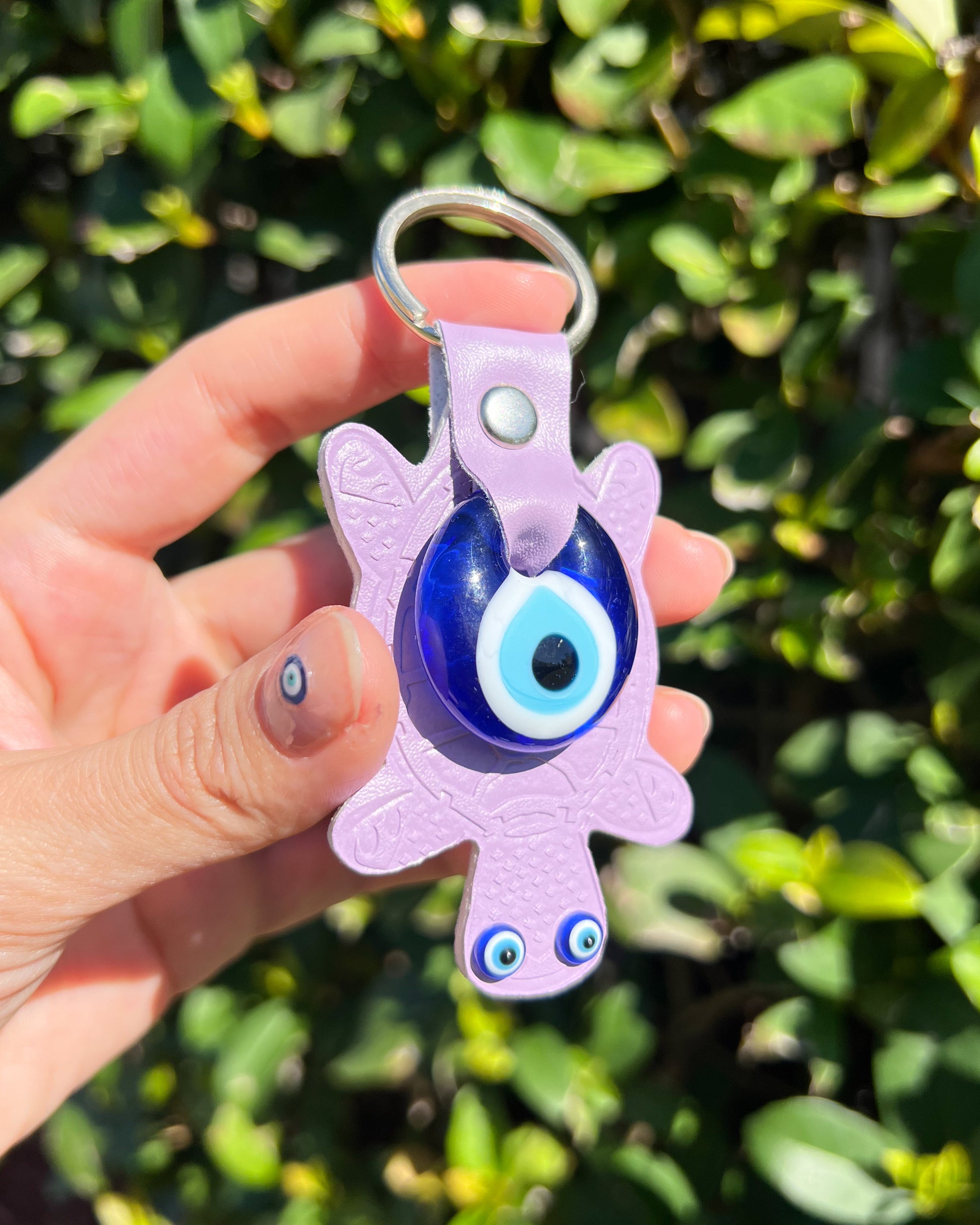 The turtle is made of faux leather and the evil eye is made of glass unlike many similar designs that has plastic beads.