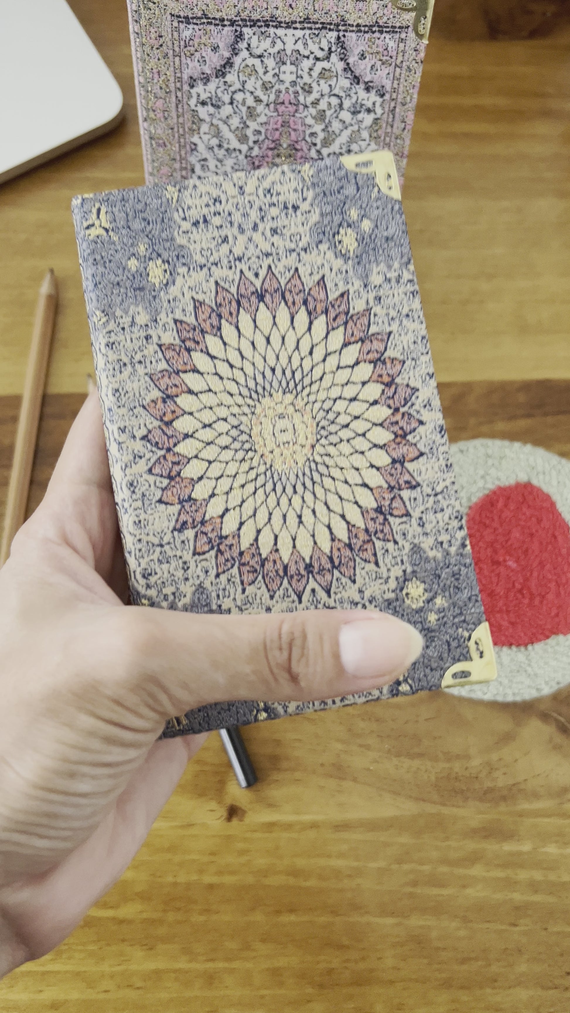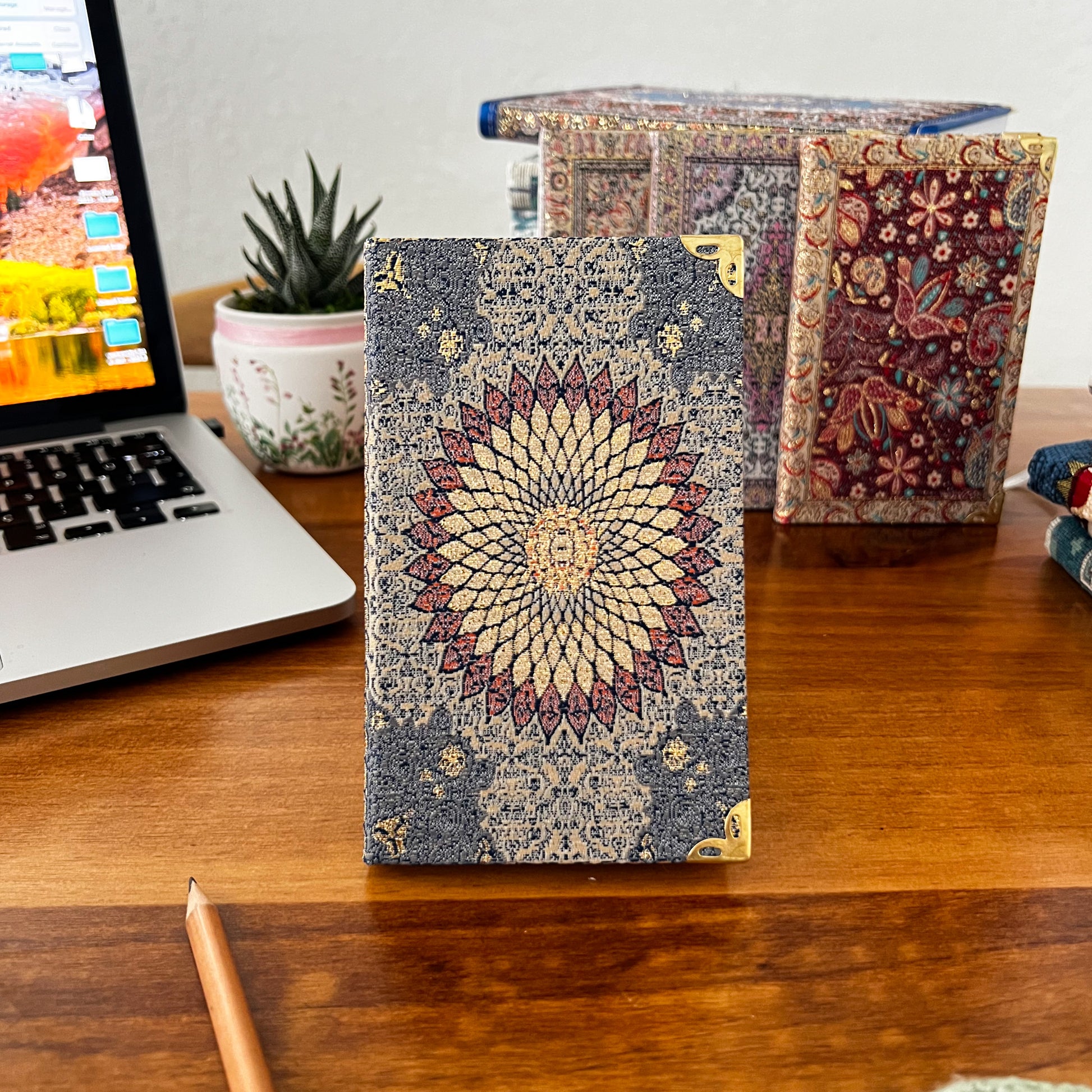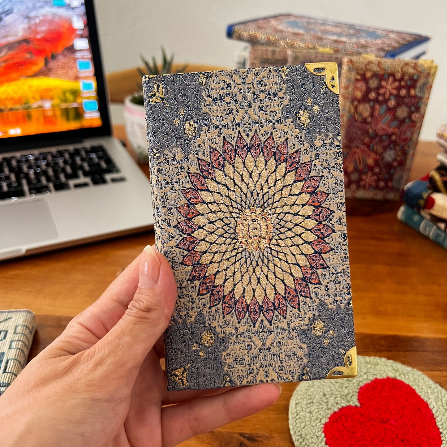 Our bohemian small fabric notebook is perfect for note-takers, travelers and as a pocket journal. You can take it with you for your work and meetings or school. Each notebook is filled with lined pages and has hardcover with Turkish carpet pattern designed brocade fabric on the top with a gold, glittery look and soft and luxurious touch.