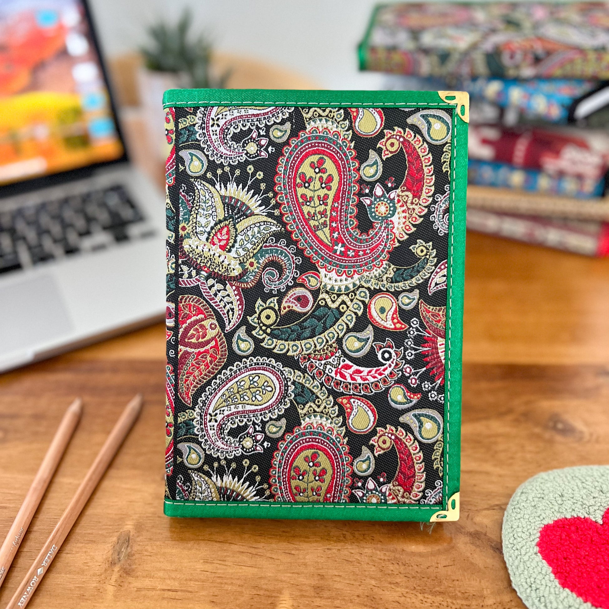 Our bohemian fabric notebooks are perfect for Diaries, Journals and a perfect companion for your work and meetings or school or even travels. Each boho notebook is filled with lined pages and has hardcover with Turkish carpet pattern designed brocade fabric on the top with a gold, glittery look and soft and luxurious touch.