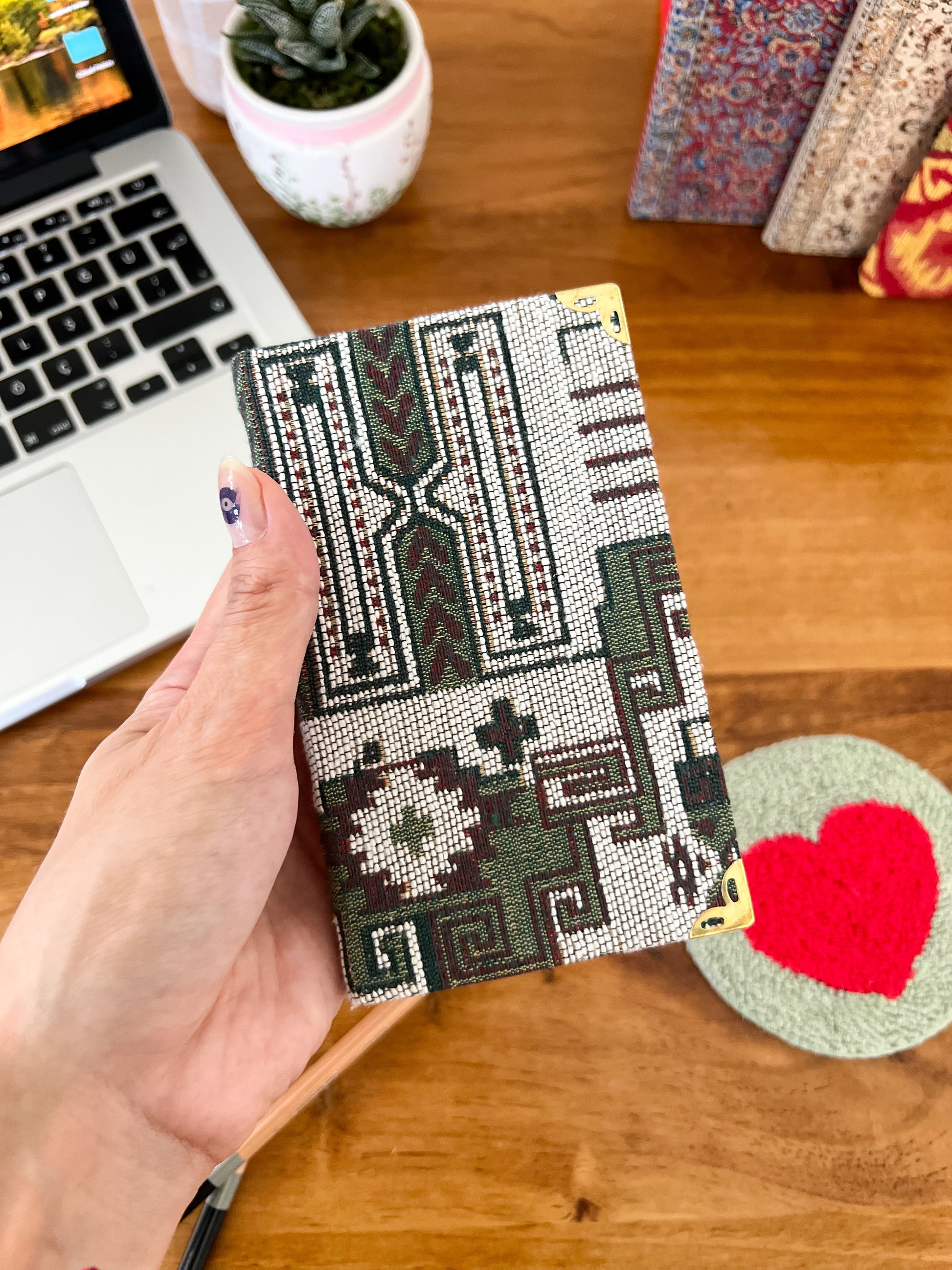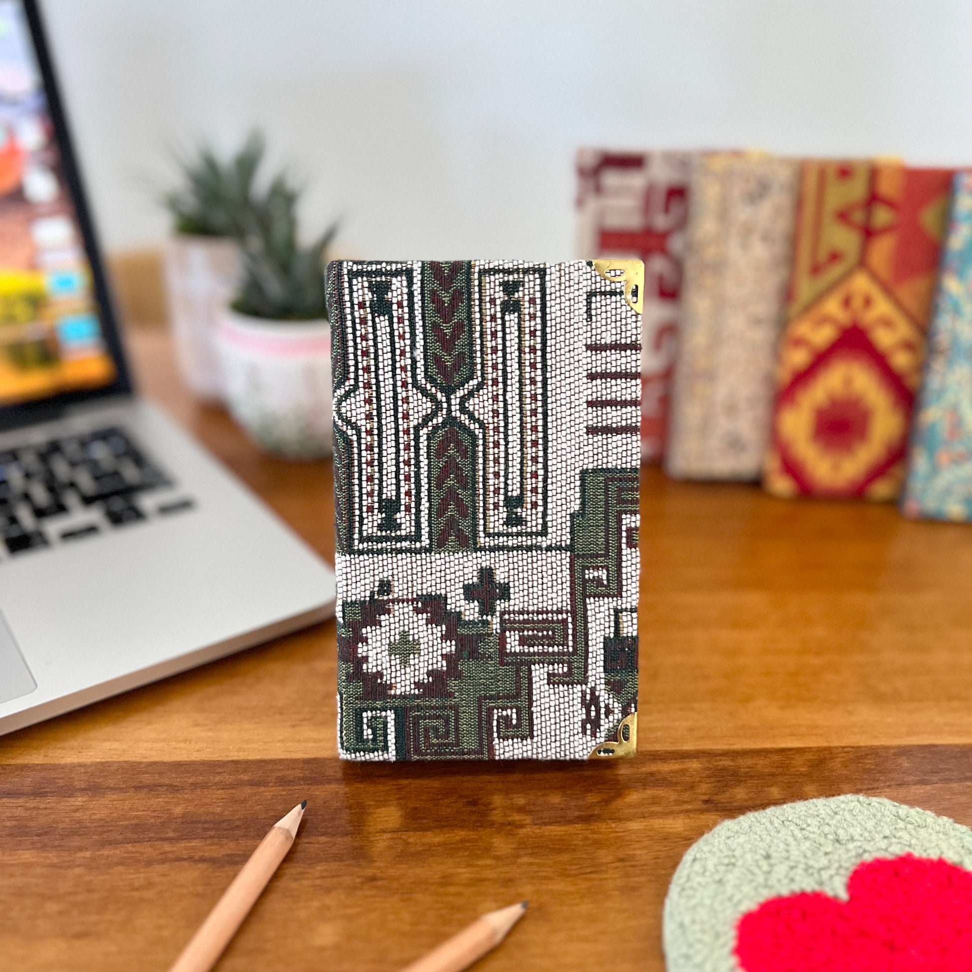 Our bohemian small fabric notebook is perfect for note-takers, travelers and as a pocket journal. You can take it with you for your work and meetings or school. Each notebook is filled with lined pages and has hardcover with Turkish carpet pattern designed brocade fabric that is soft.