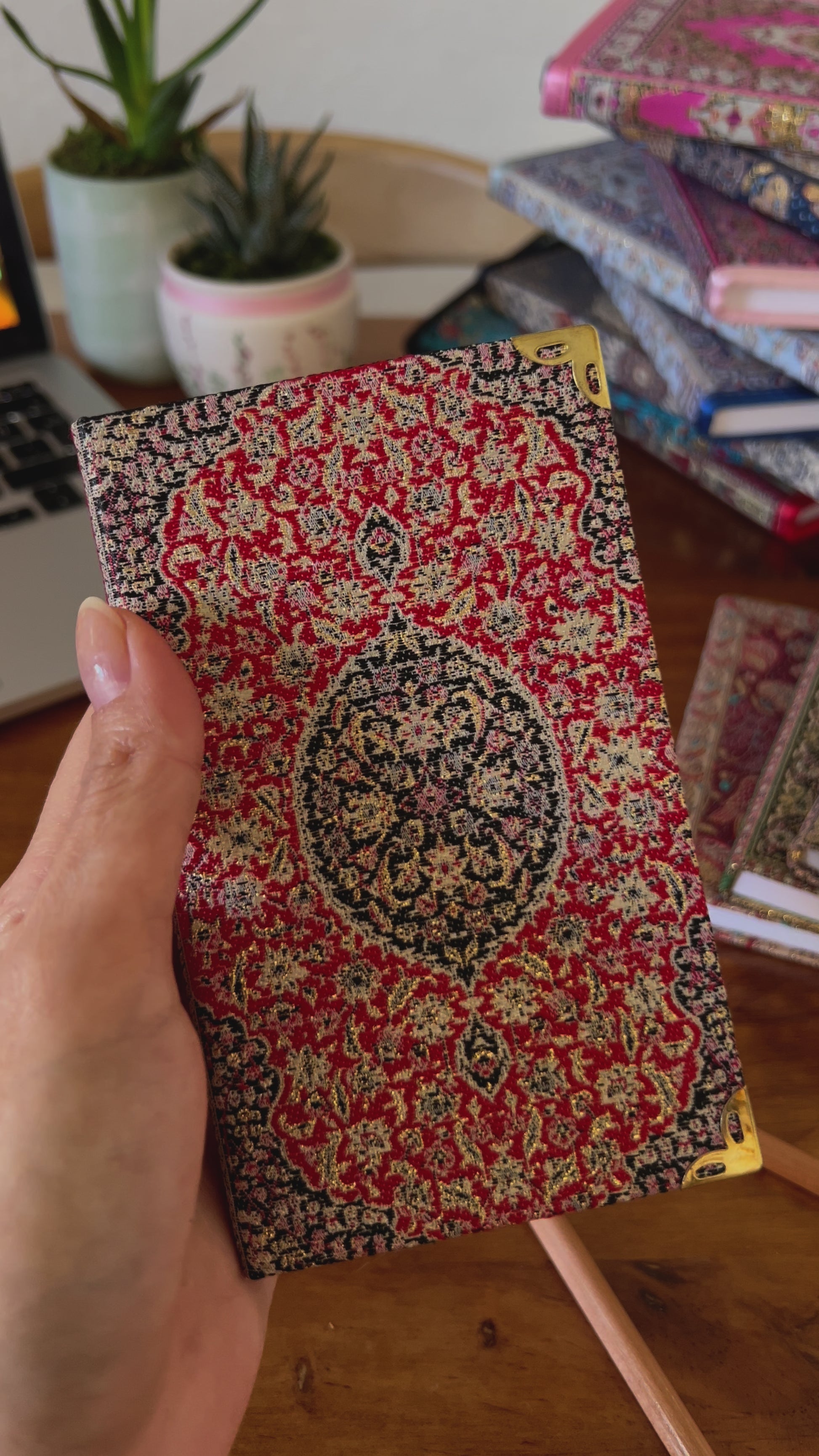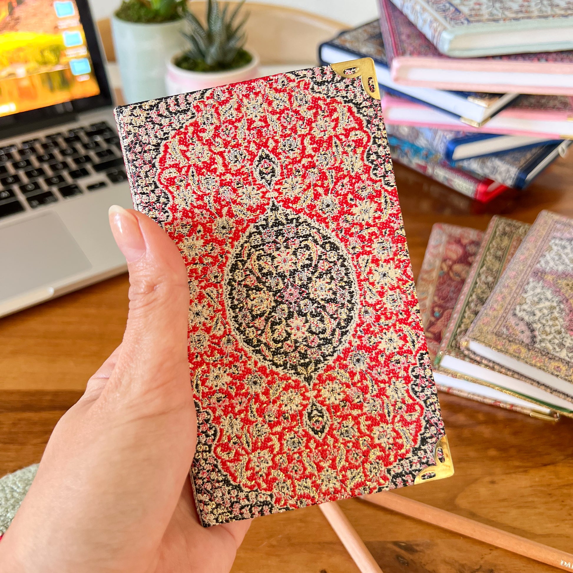 Our bohemian small fabric notebook is perfect for note-takers, travelers and as a pocket journal. You can take it with you for your work and meetings or school. Each notebook is filled with lined pages and has hardcover with Turkish carpet pattern designed brocade fabric on the top with a gold, glittery look and soft and luxurious touch.