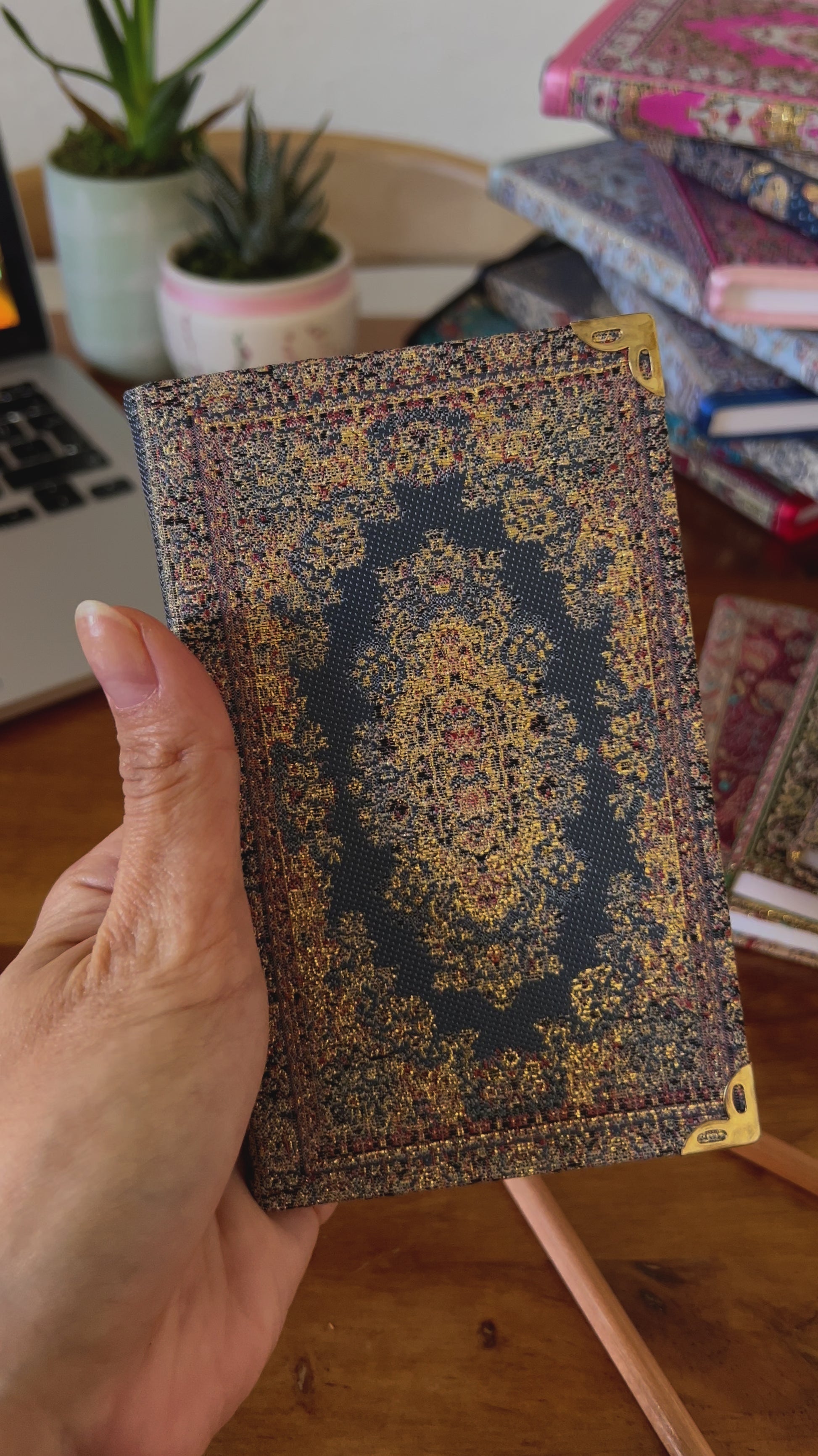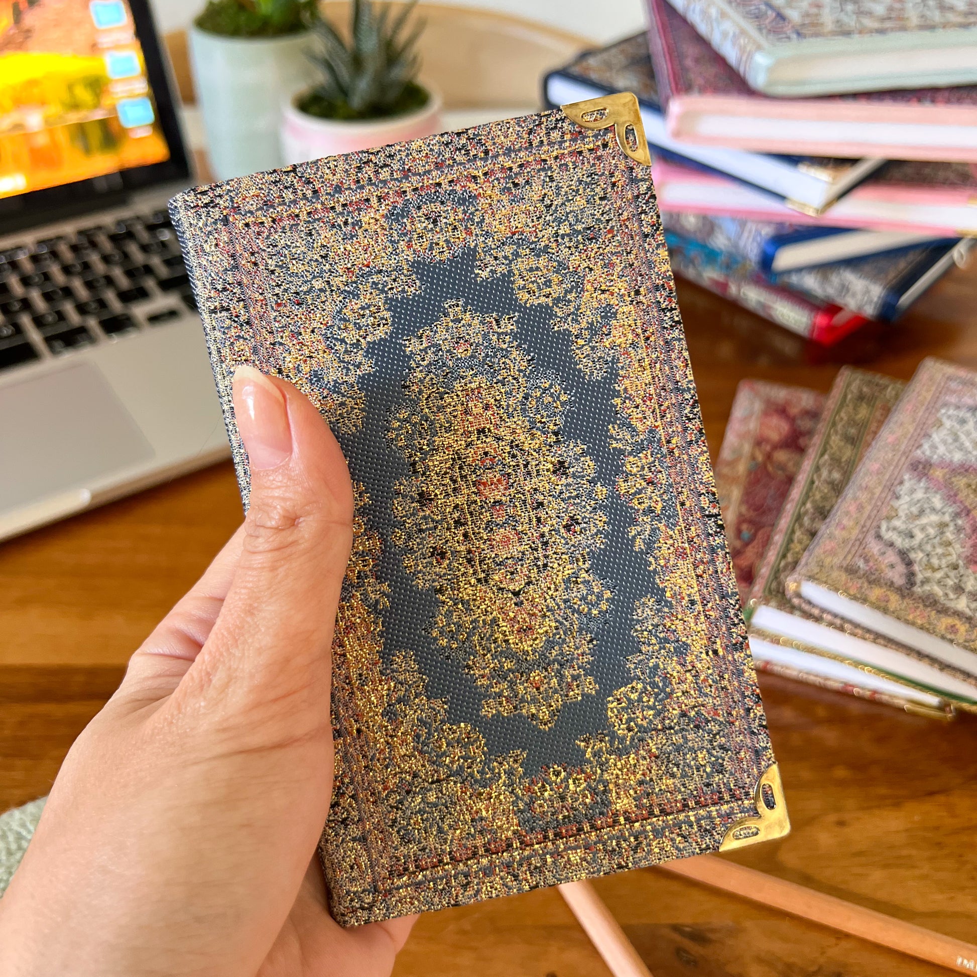 Our bohemian small fabric notebook is perfect for note-takers, travelers and as a pocket journal. You can take it with you for your work and meetings or school. Each notebook is filled with lined pages and has hardcover with Turkish carpet pattern designed brocade fabric on the top with a gold, glittery look and soft and luxurious touch.