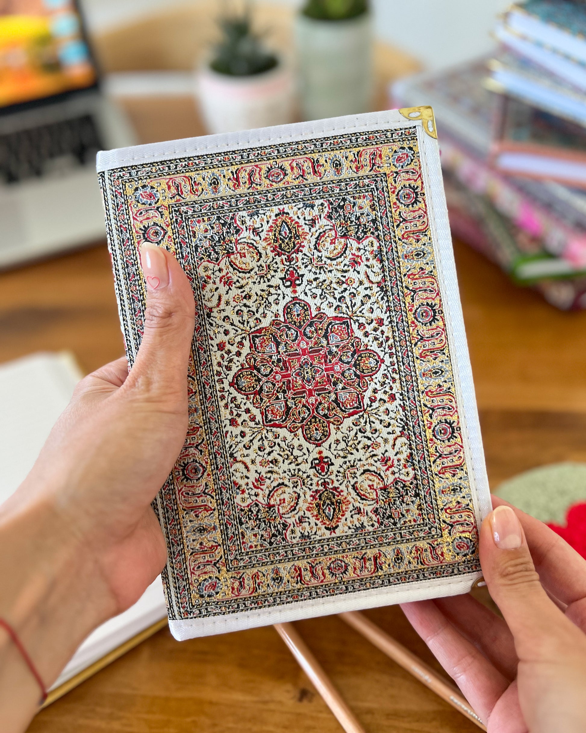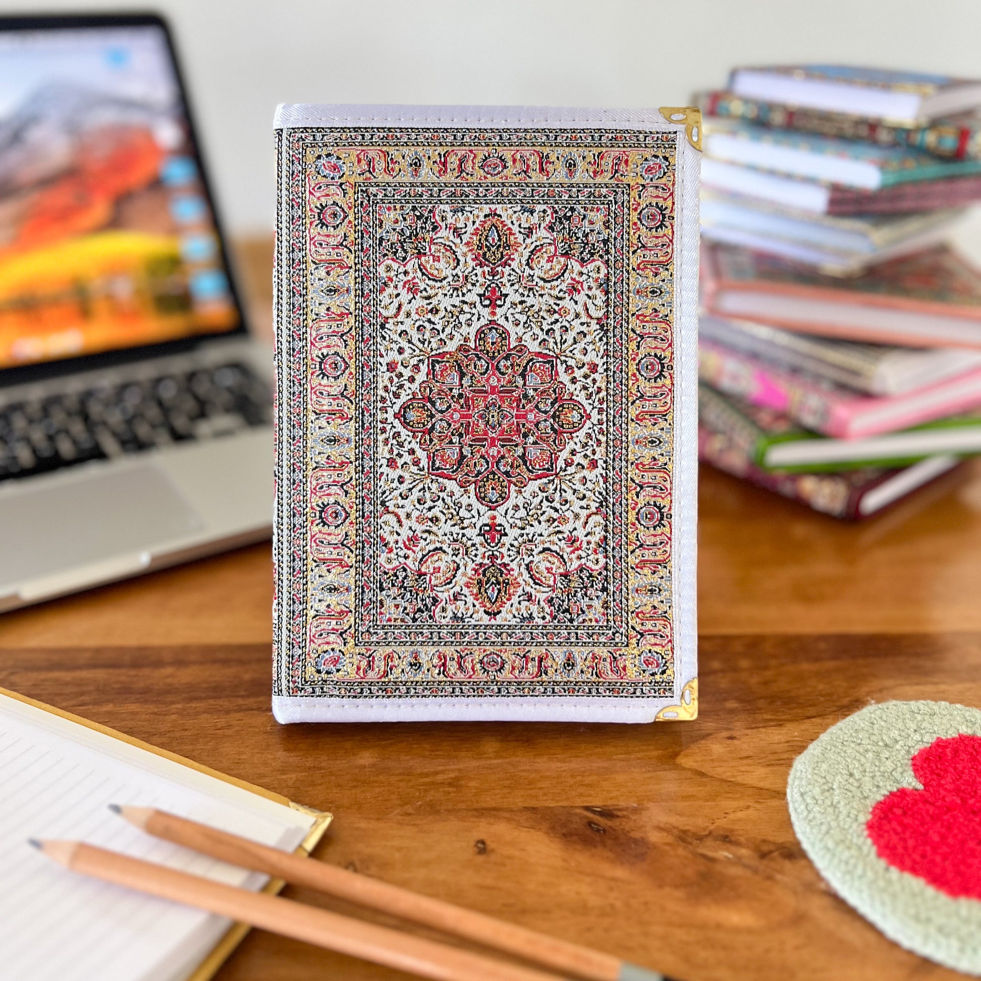 Our bohemian fabric notebooks are perfect for Diaries, Journals and a perfect companion for your work and meetings or school or even travels. Each boho notebook is filled with lined pages and has hardcover with Turkish carpet pattern designed brocade fabric on the top with a gold, glittery look and soft and luxurious touch.