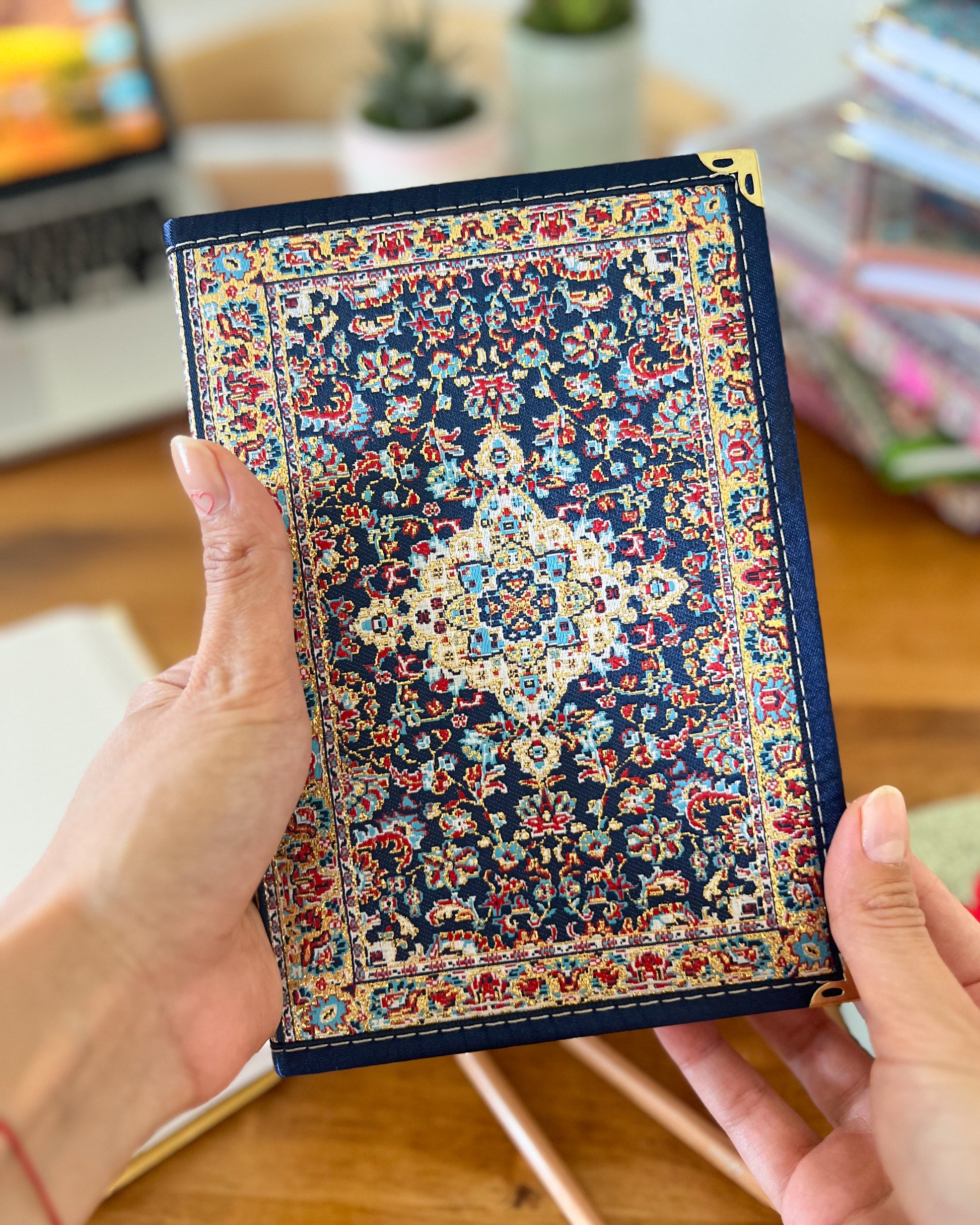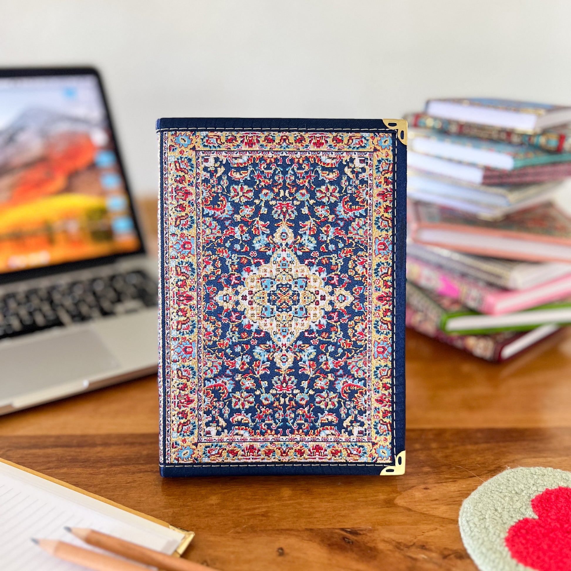 Our bohemian fabric notebooks are perfect for Diaries, Journals and a perfect companion for your work and meetings or school or even travels. Each boho notebook is filled with lined pages and has hardcover with Turkish carpet pattern designed brocade fabric on the top with a gold, glittery look and soft and luxurious touch.