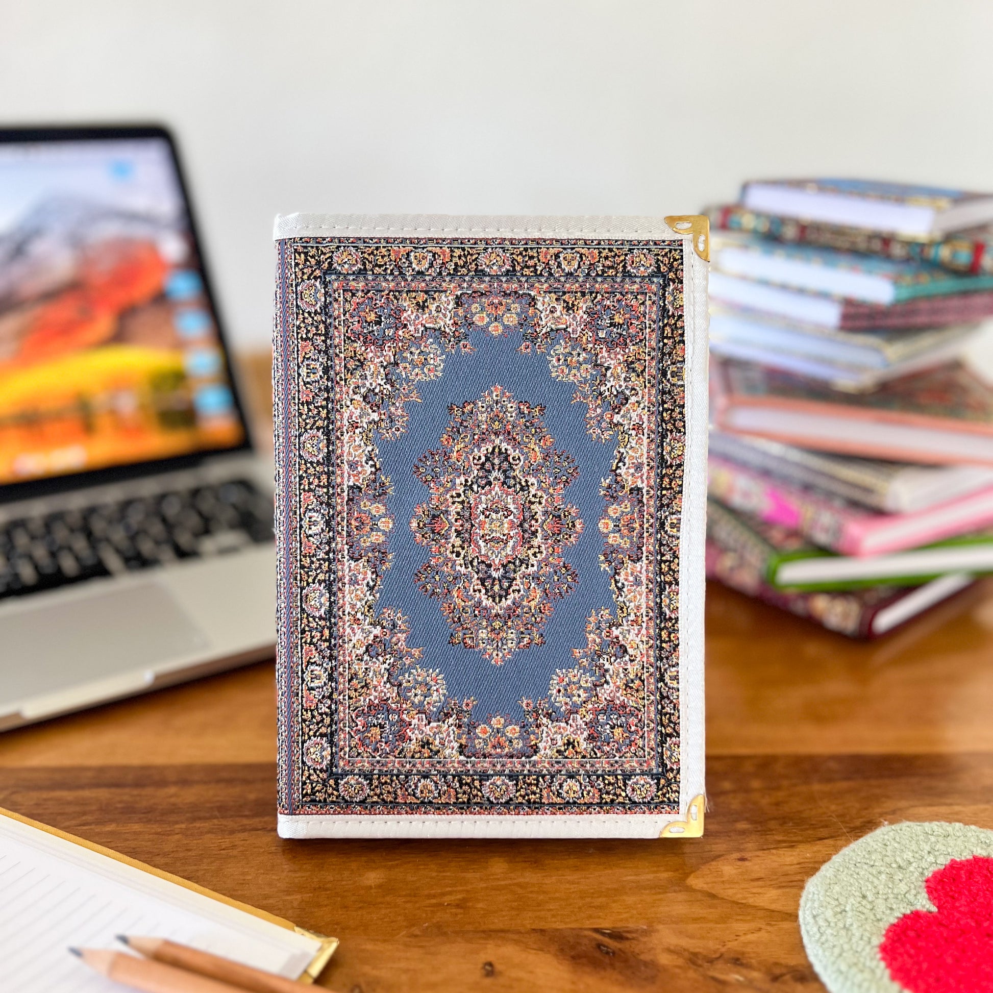 Our bohemian fabric notebooks are perfect for Diaries, Journals and a perfect companion for your work and meetings or school or even travels. Each boho notebook is filled with lined pages and has hardcover with Turkish carpet pattern designed brocade fabric on the top with a gold, glittery look and soft and luxurious touch.