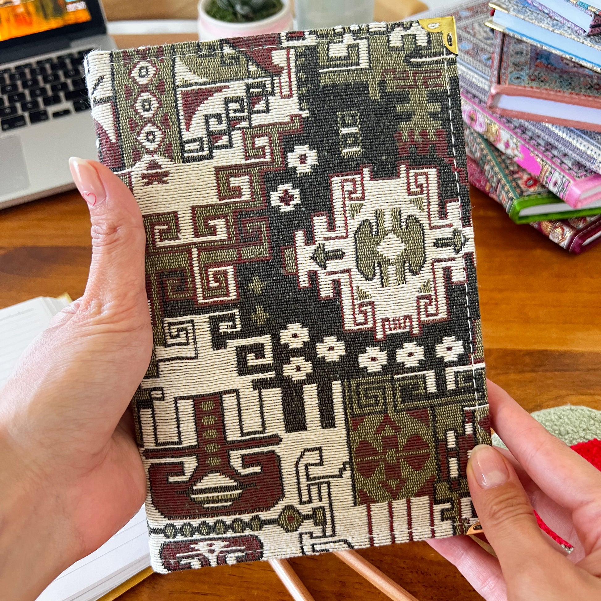 Our bohemian fabric notebooks are perfect as Diaries, Journals and a perfect companion for your work and meetings or school or even travels. Each boho notebook is filled with lined pages and has hardcover with Turkish carpet pattern designed brocade fabric on the top with a gold, glittery look and soft and luxurious touch.