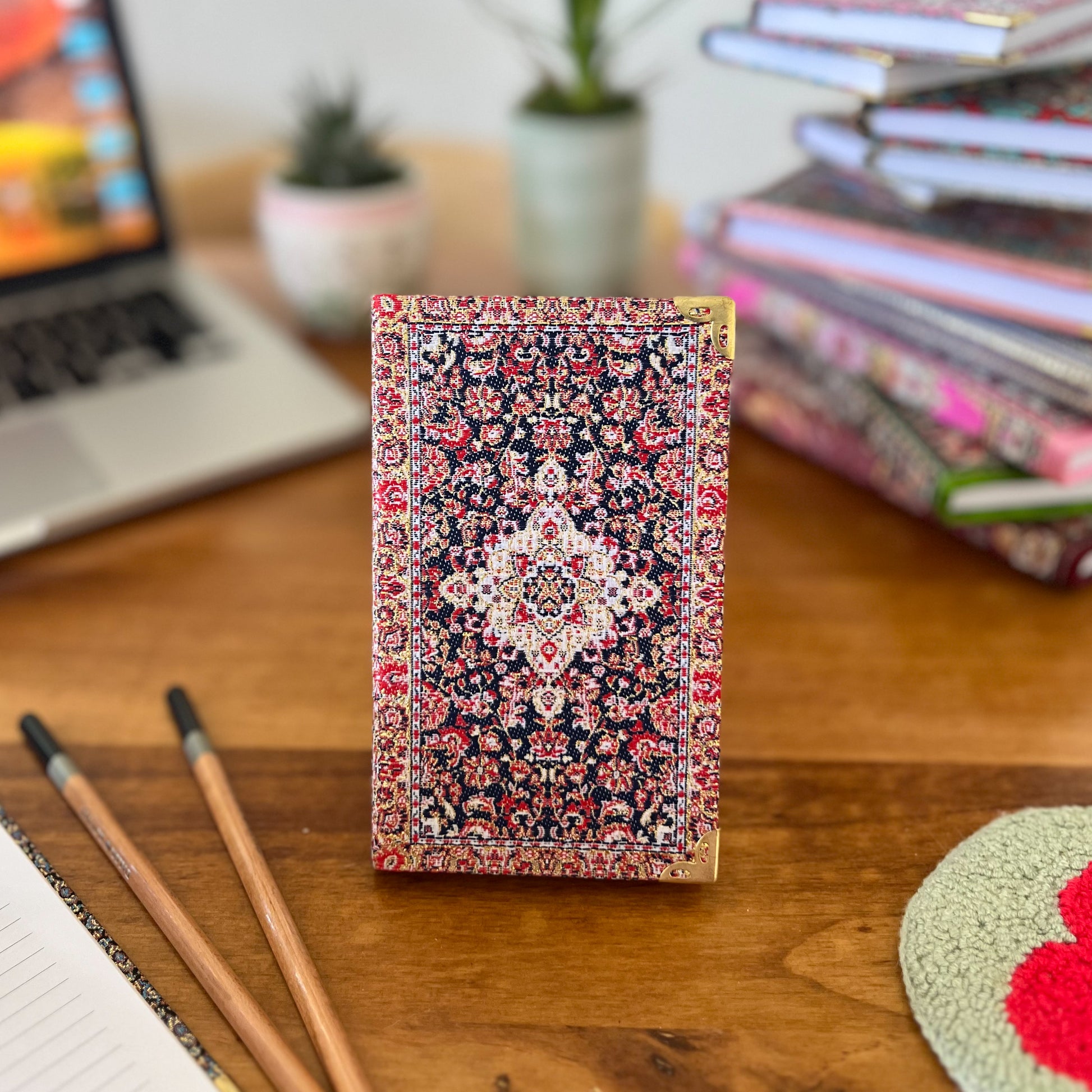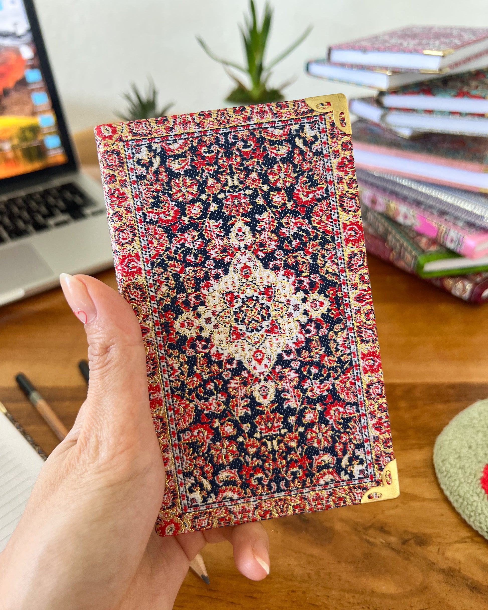 Our bohemian fabric notebooks are perfect for Diaries, Journals and a perfect companion for your work and meetings or school or even travels. Each boho notebook is filled with lined pages and has hardcover with Turkish carpet pattern designed brocade fabric on the top with a gold, glittery look and soft and luxurious touch.