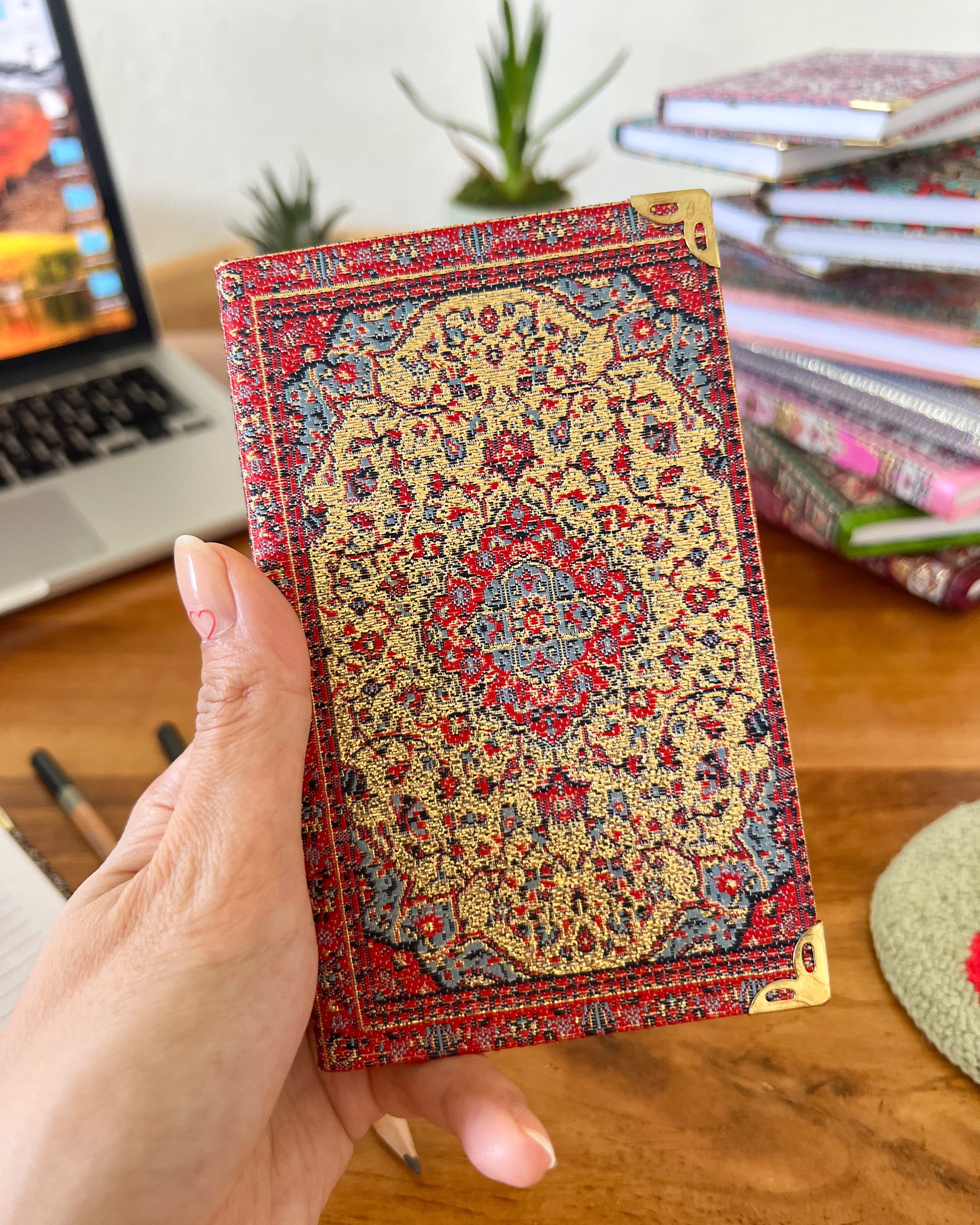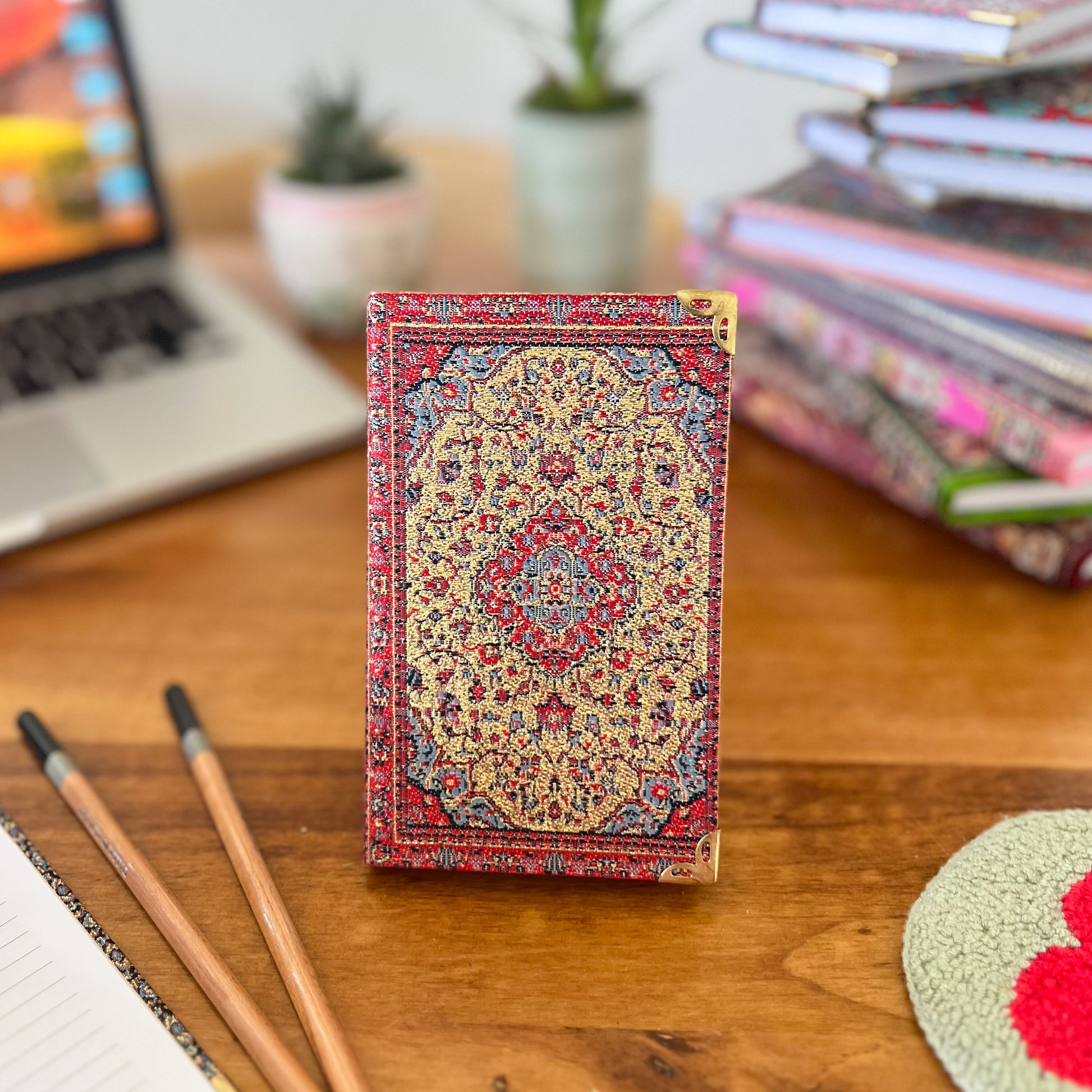 Our bohemian fabric notebooks are perfect for Diaries, Journals and a perfect companion for your work and meetings or school or even travels. Each boho notebook is filled with lined pages and has hardcover with Turkish carpet pattern designed brocade fabric on the top with a gold, glittery look and soft and luxurious touch.
