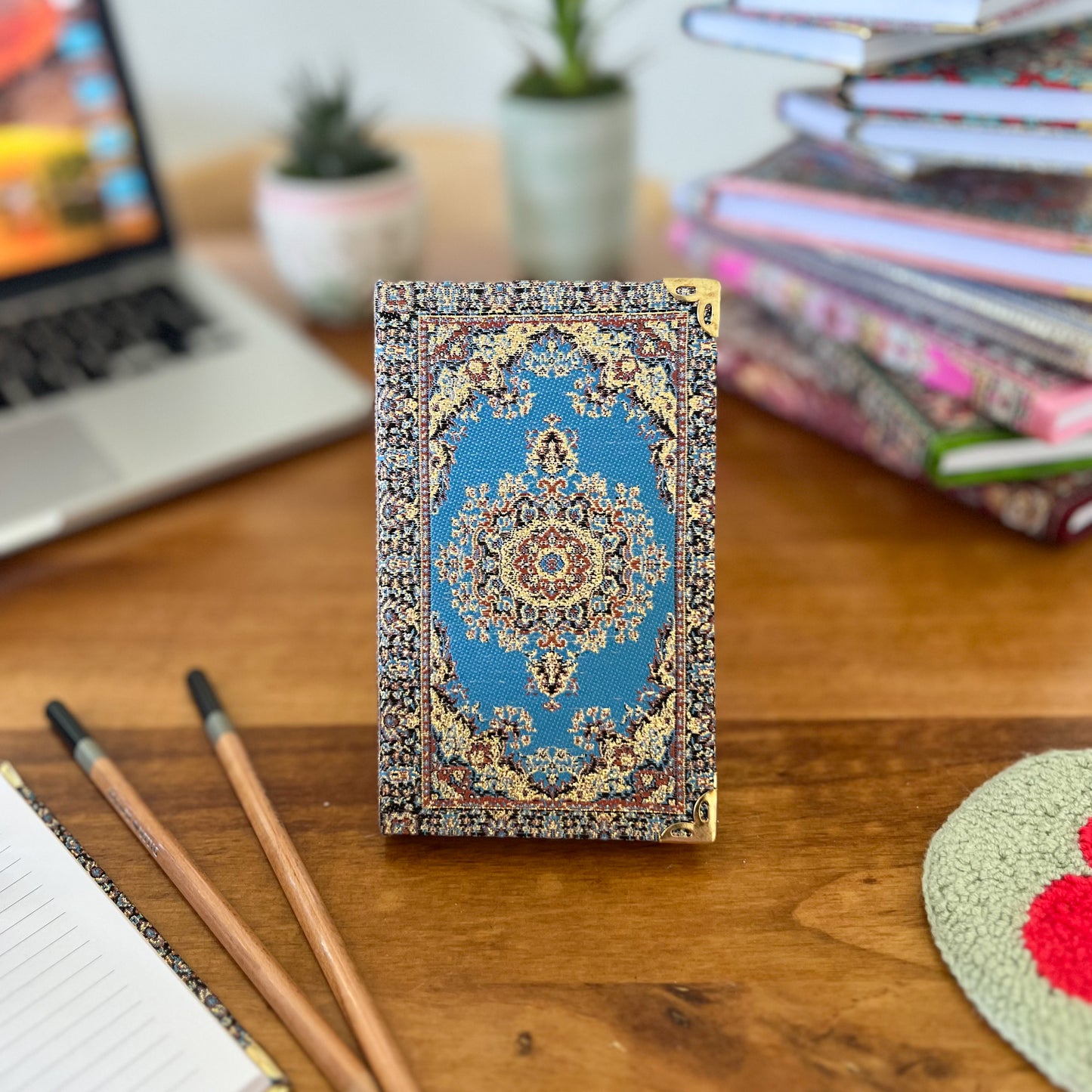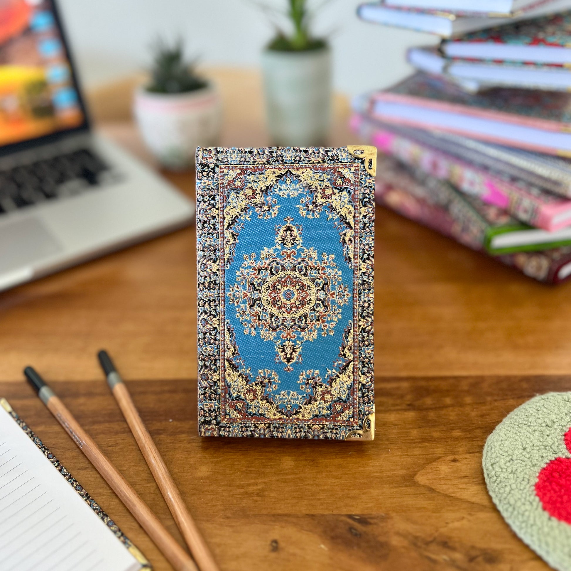 Our bohemian fabric notebooks are perfect for Diaries, Journals and a perfect companion for your work and meetings or school or even travels. Each boho notebook is filled with lined pages and has hardcover with Turkish carpet pattern designed brocade fabric on the top with a gold, glittery look and soft and luxurious touch.