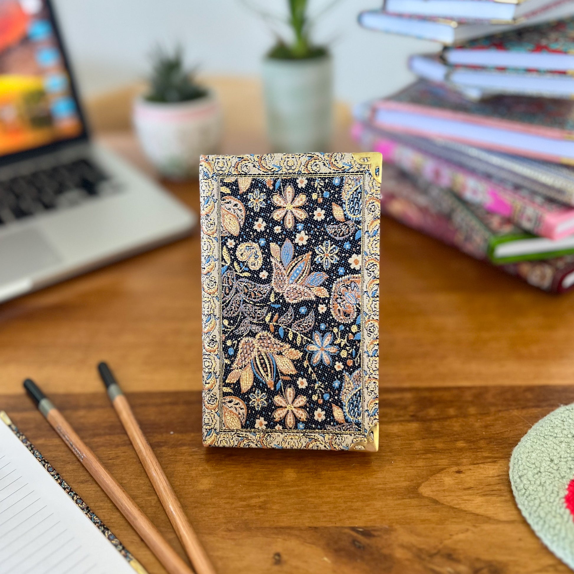 Our bohemian fabric notebooks are perfect for Diaries, Journals and a perfect companion for your work and meetings or school or even travels. Each boho notebook is filled with lined pages and has hardcover with Turkish carpet pattern designed brocade fabric on the top with a gold, glittery look and soft and luxurious touch.