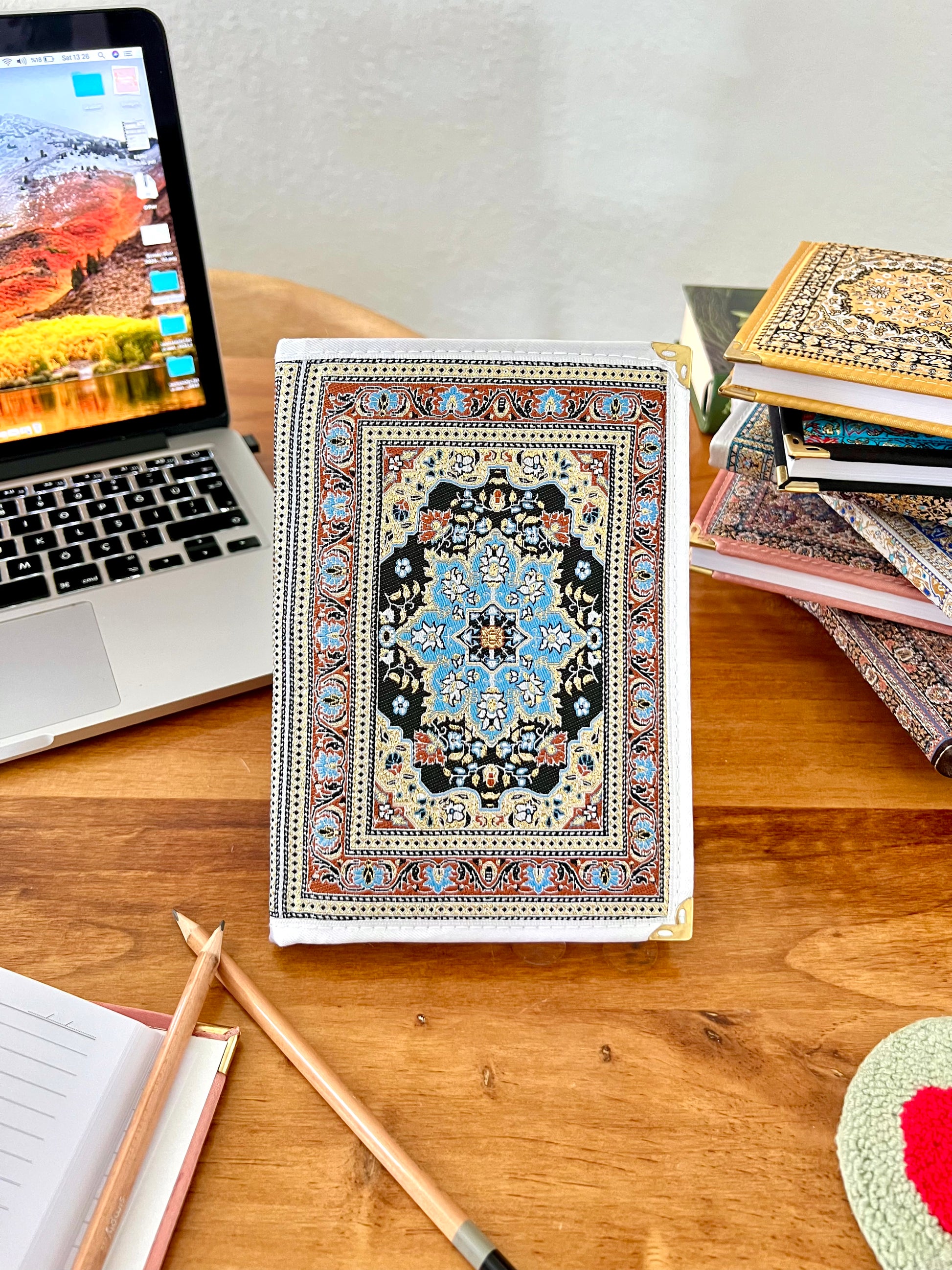 Our bohemian fabric notebooks are perfect for Diaries, Journals and a perfect companion for your work and meetings or school or even travels. Each boho notebook is filled with lined pages and has hardcover with Turkish carpet pattern designed brocade fabric on the top with a gold, glittery look and soft and luxurious touch.