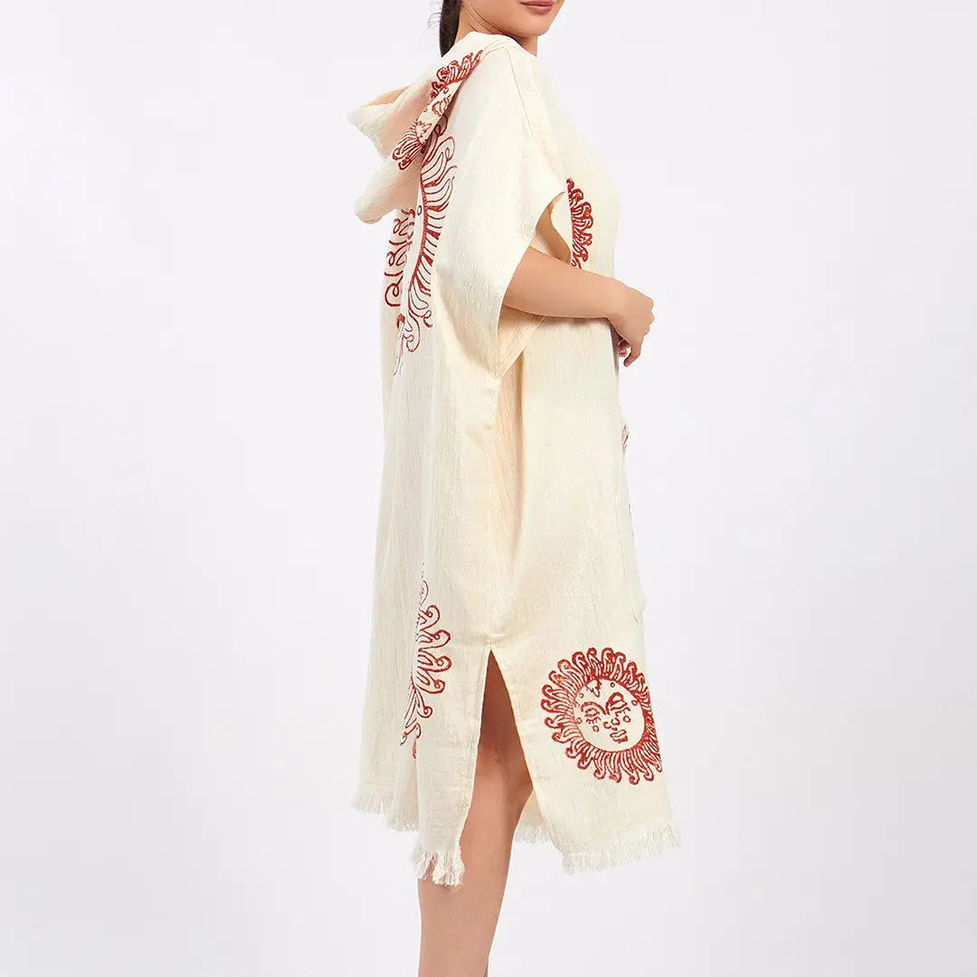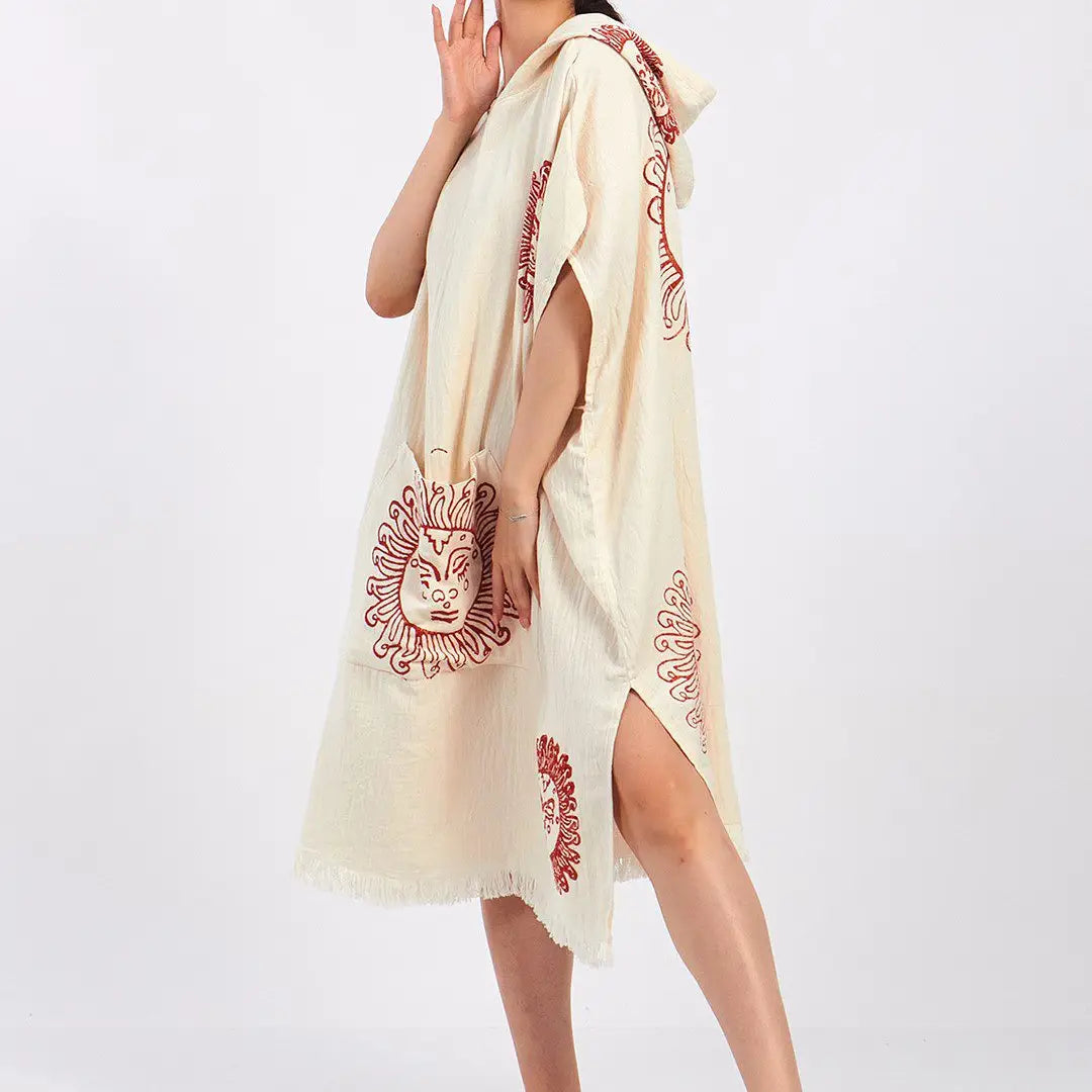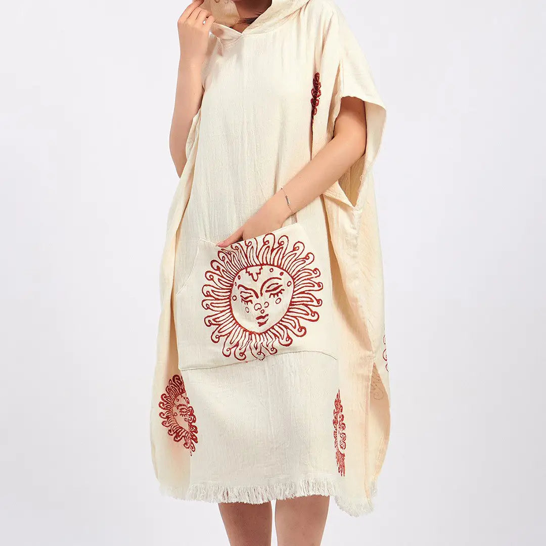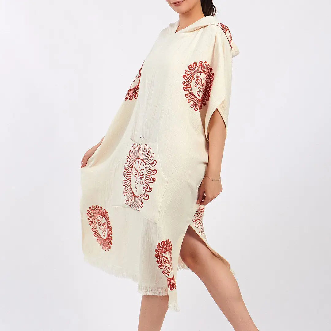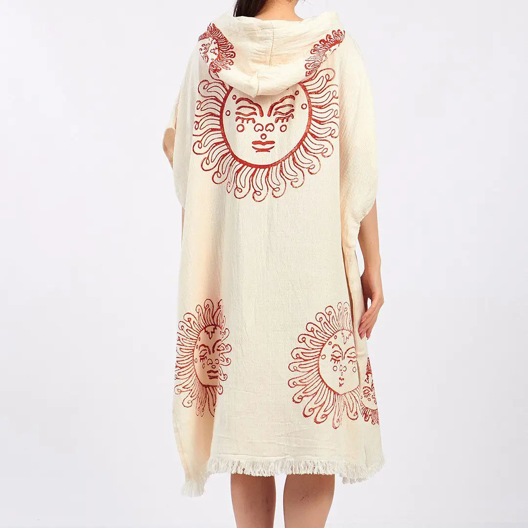 These ponchos are handcrafted in Turkey. The design on them is made with wood blocks by using plant-based dye. All the small details on the designs are handprinted one by one.