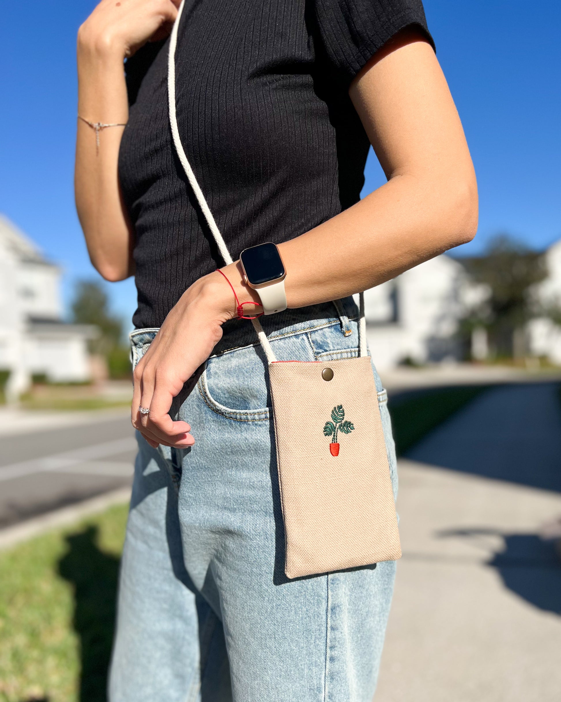 These cute phone purses are totally handmade from cotton fabric. The succulents on the purses are embroidered on to the cotton fabric. You can fit any sized phone to our cute phone purses.