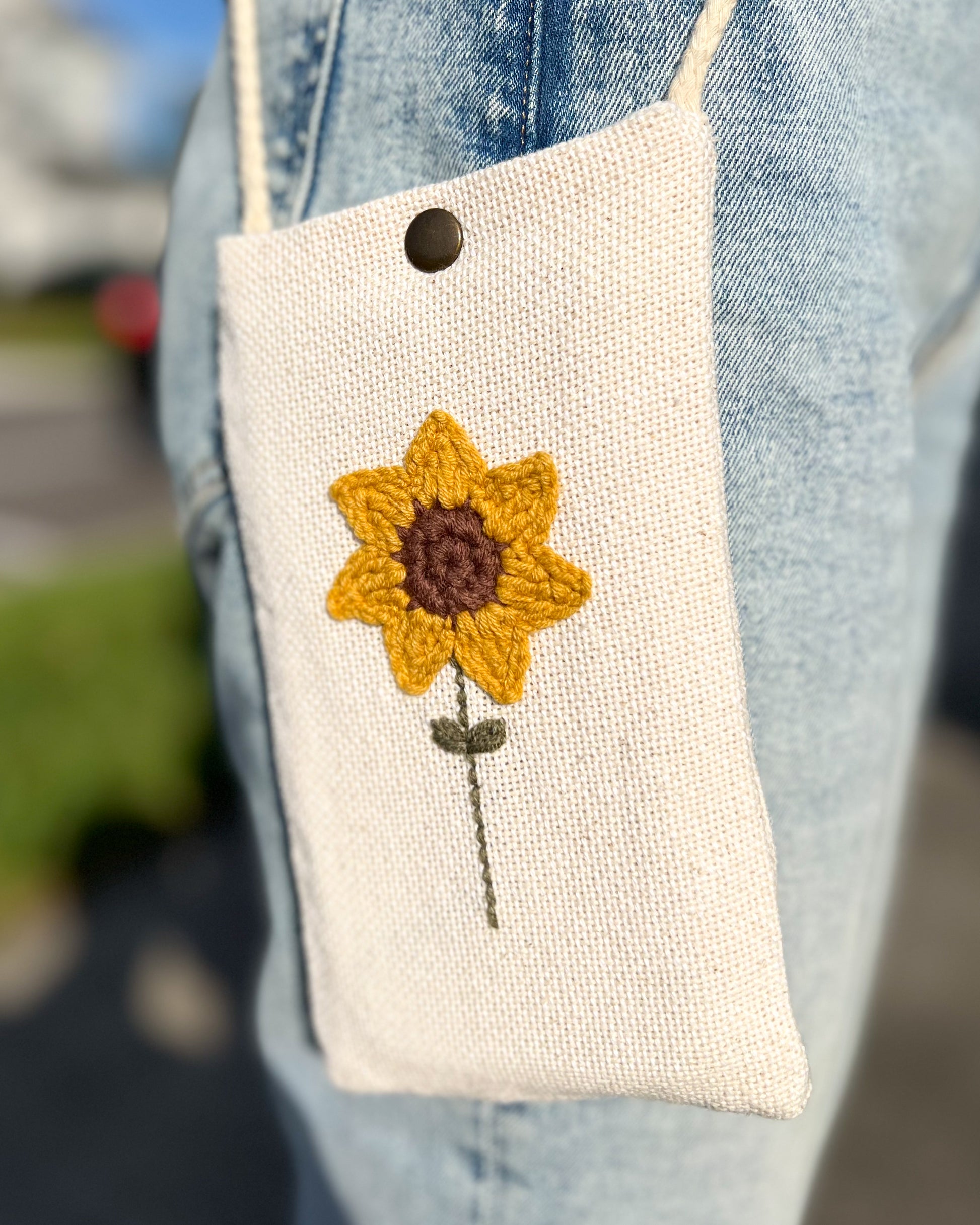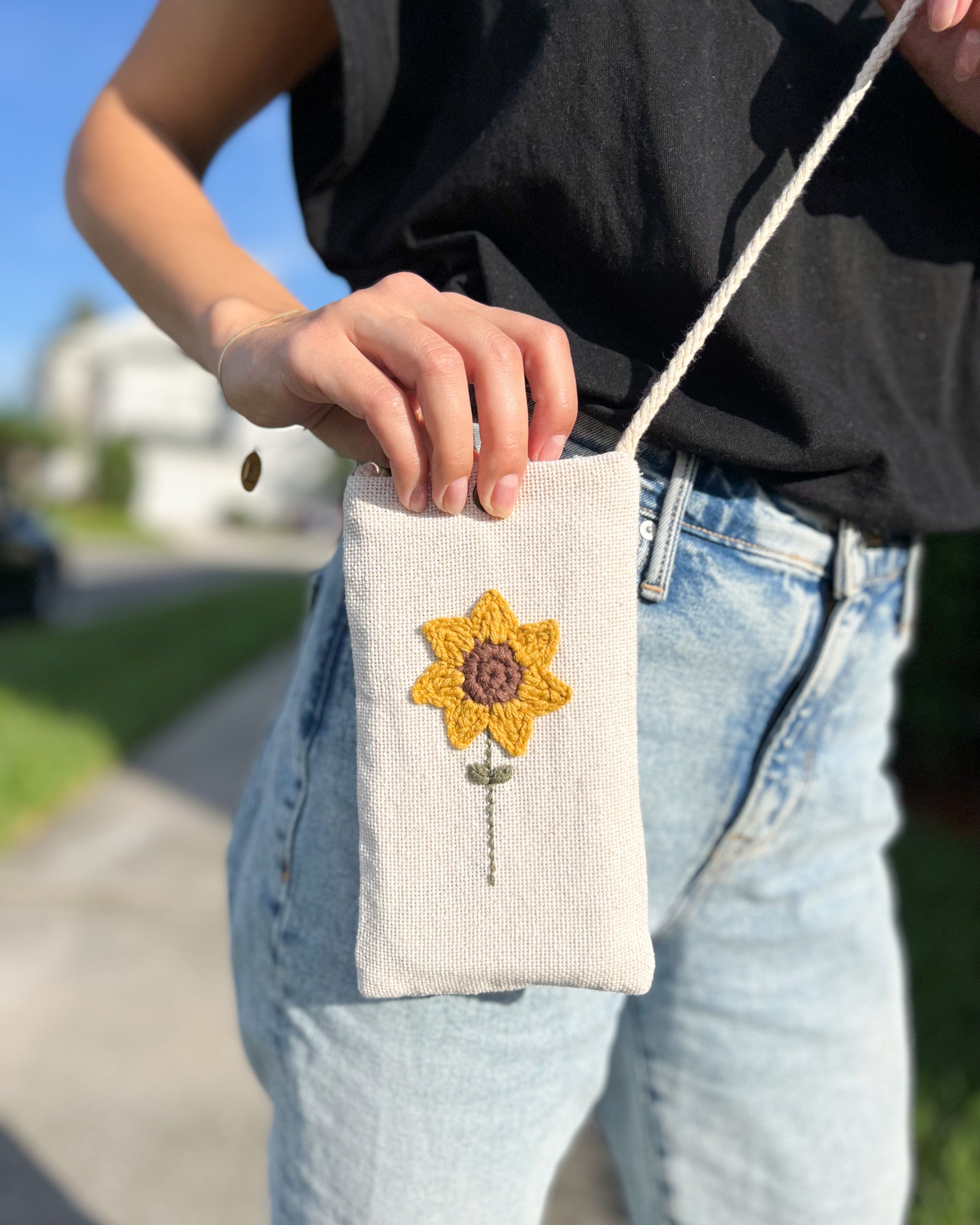 These cute phone purses are totally handmade from cotton fabric. The sunflowers on the purses are hand embroidered on to the cotton fabric. You can fit any sized phone to our cute phone purses.