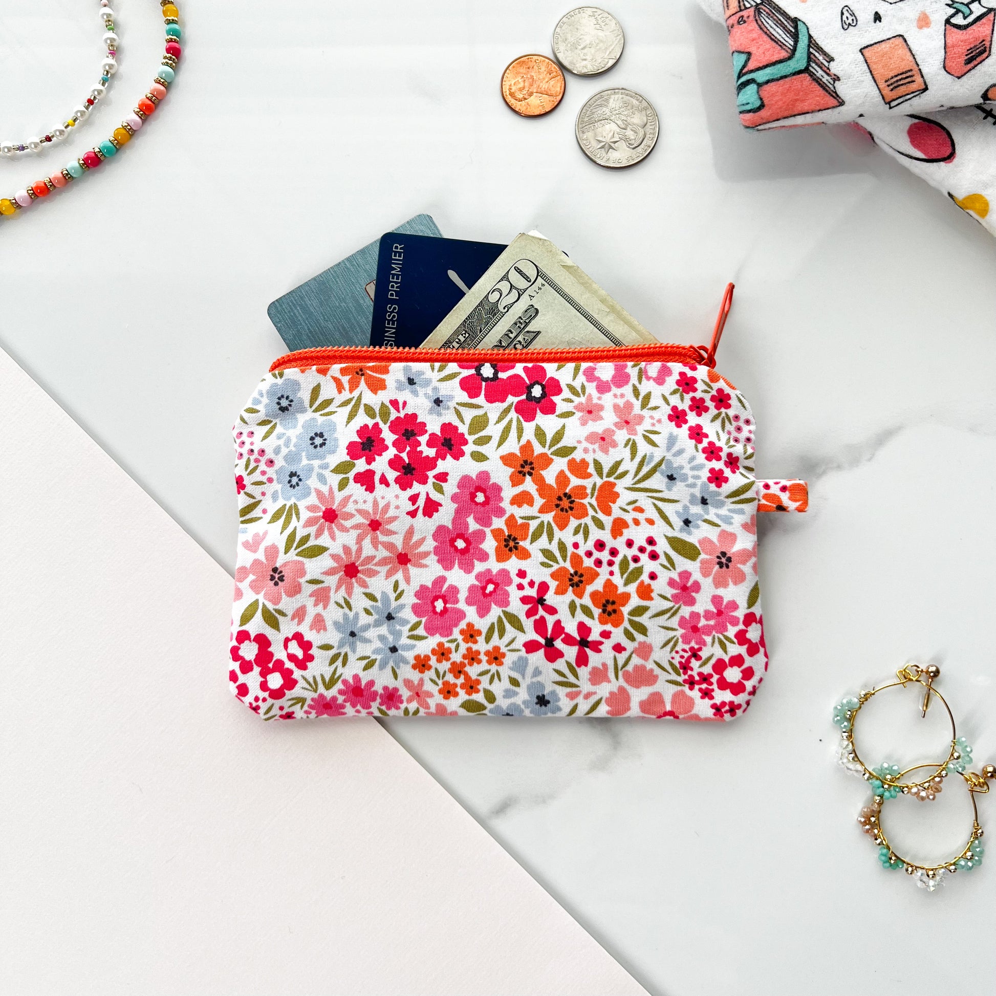 Pink Floral Zipper Purse, Cute Coin Purse, Handmade Purse