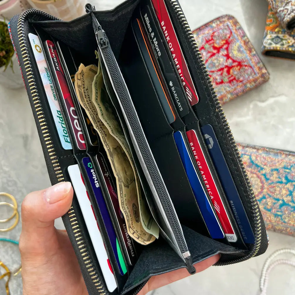 This slim wallet is made of Turkish carpet patterned brocade fabric and vegan leather. This cute wallet can keep 12 cards. It has a zipper pocket for coins and It can also fit a cell phone.