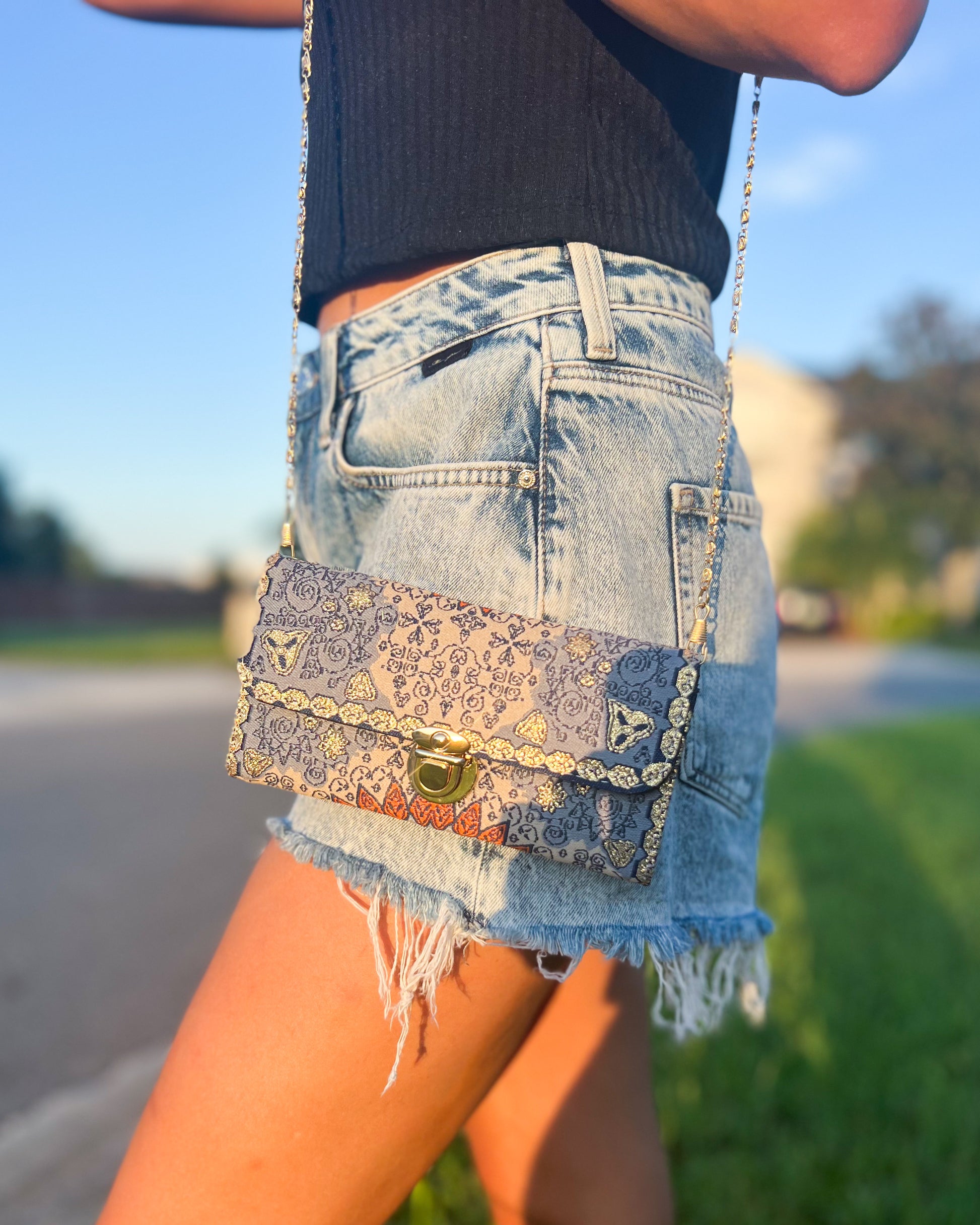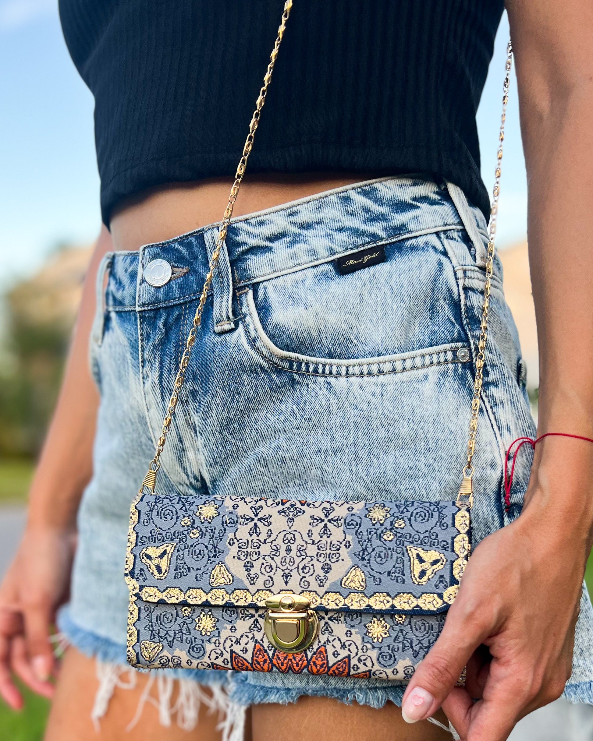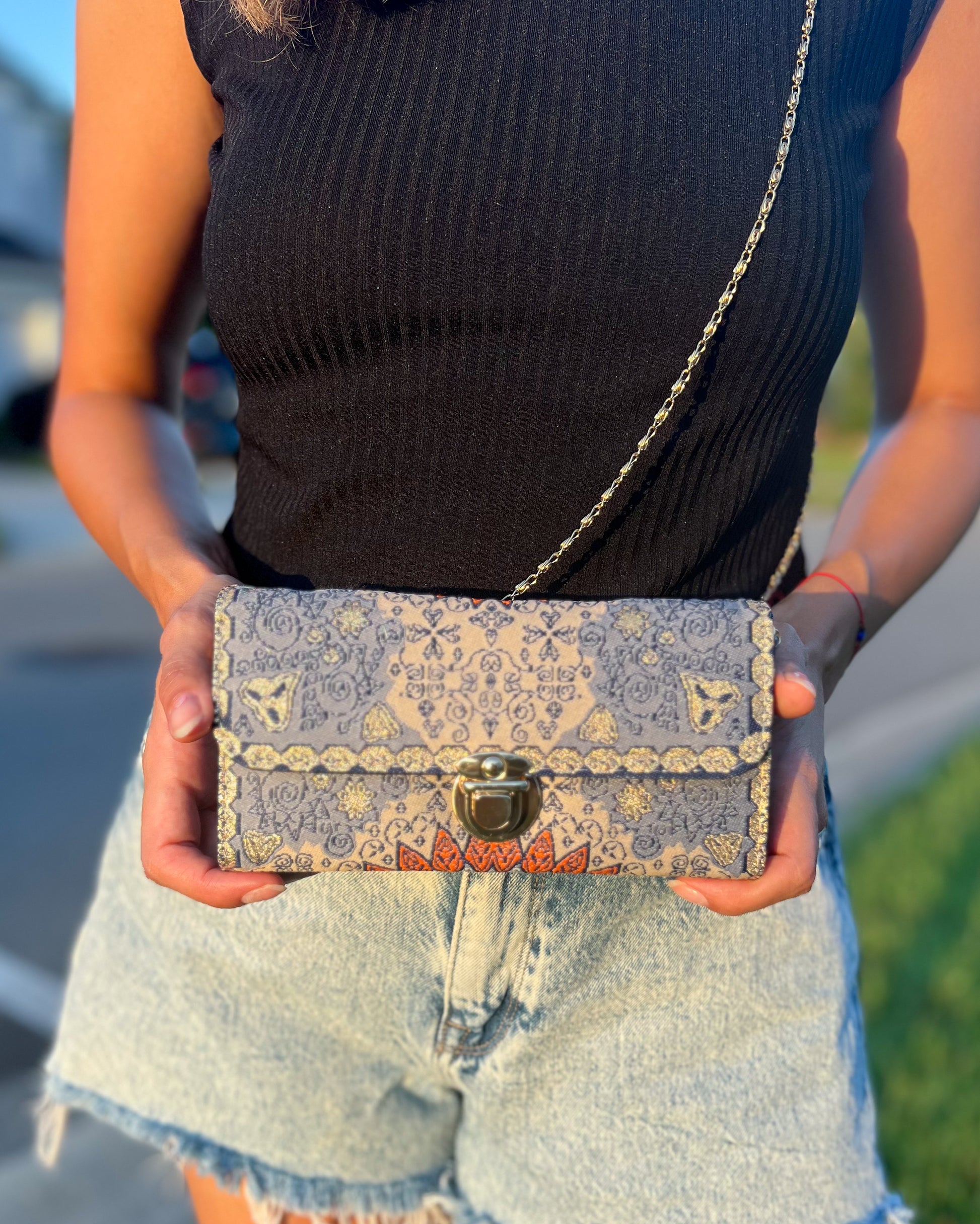 This Boho crossbody bag is made of Turkish carpet patterned brocade fabric and vegan leather. It has a metal clasp and metal chain. It can be used as a trifold wallet when you take the chain out.