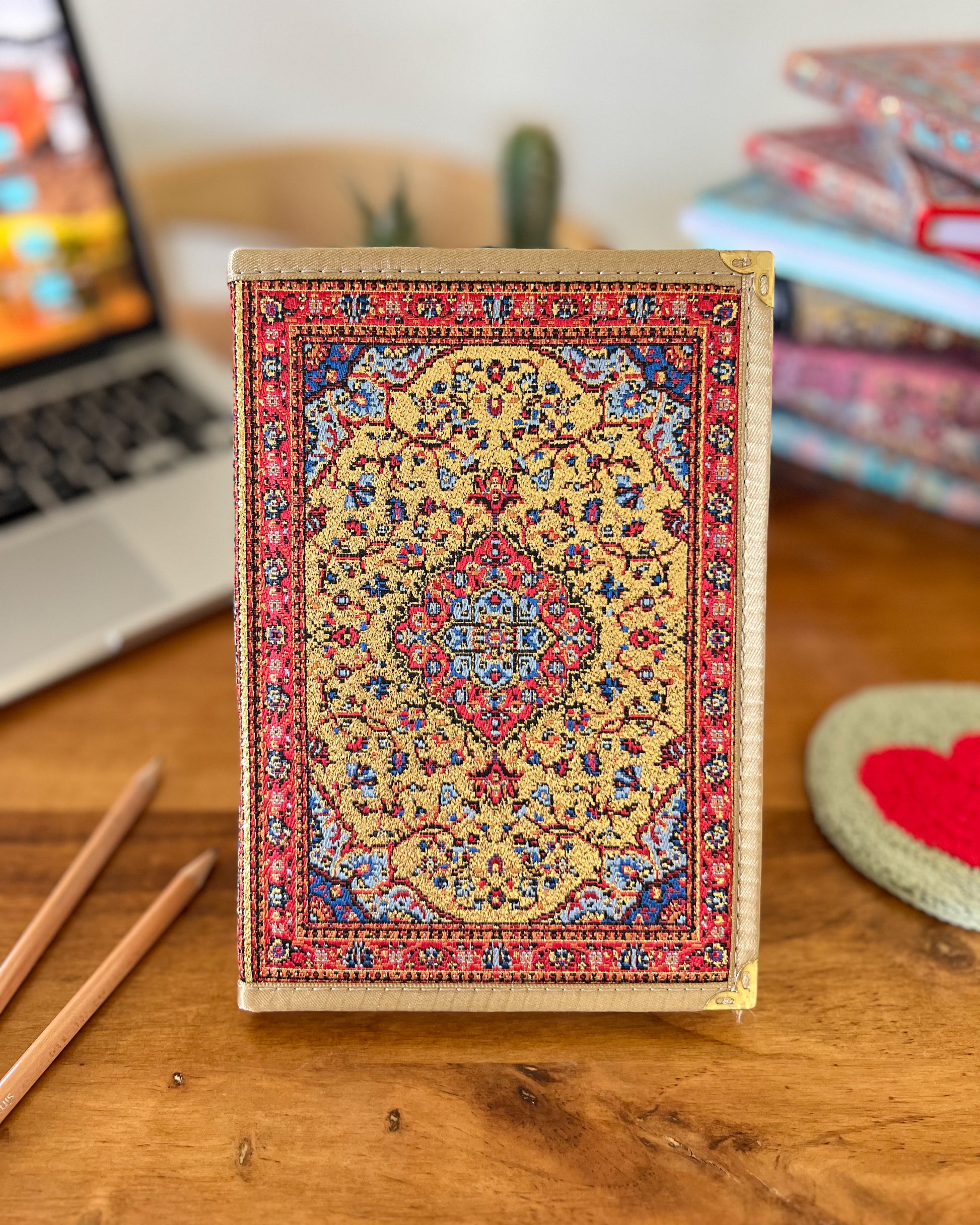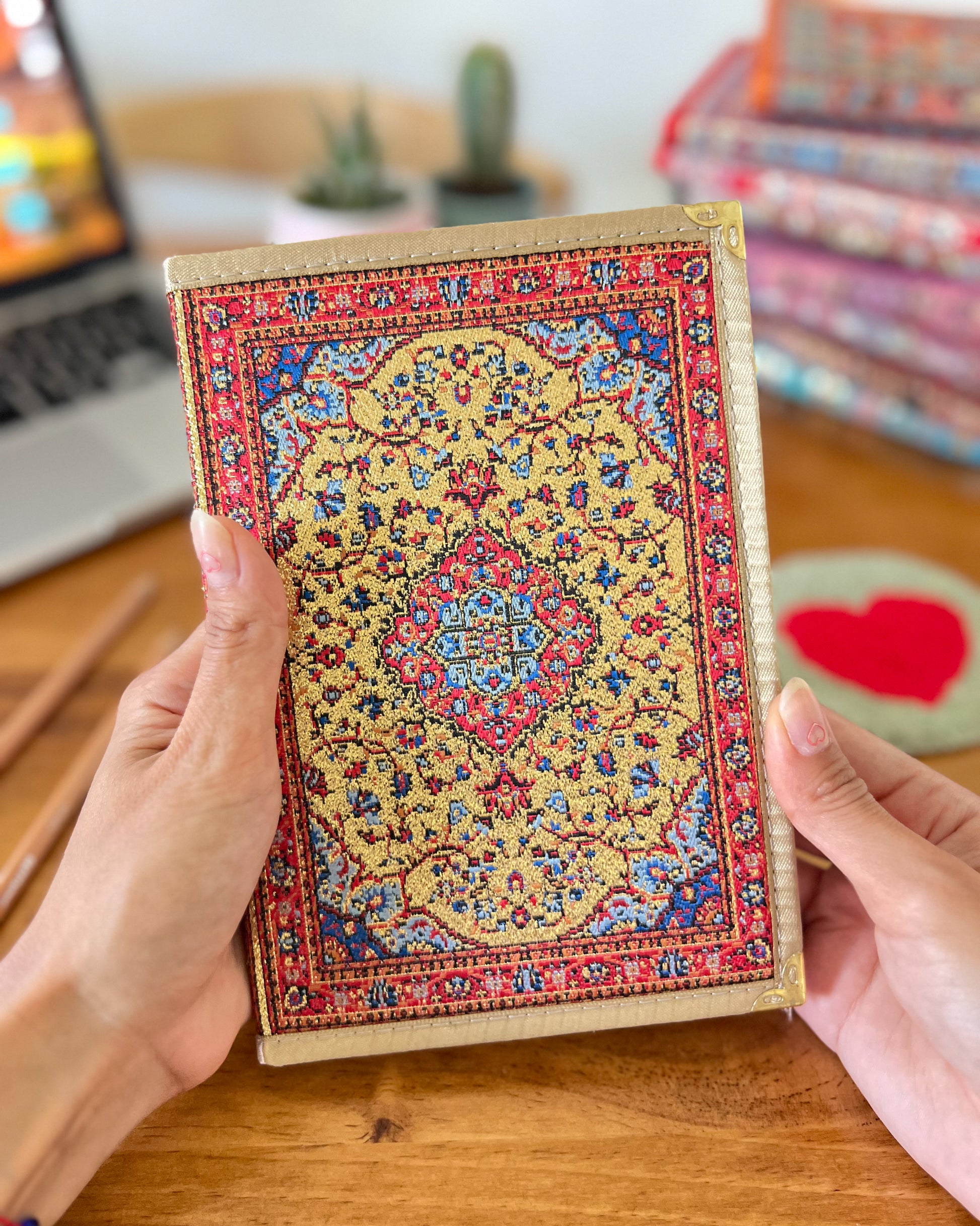 Our bohemian fabric notebooks are perfect for Diaries, Journals and a perfect companion for your work and meetings or school or even travels. Each boho notebook is filled with lined pages and has hardcover with Turkish carpet pattern designed brocade fabric on the top with a gold, glittery look and soft and luxurious touch.