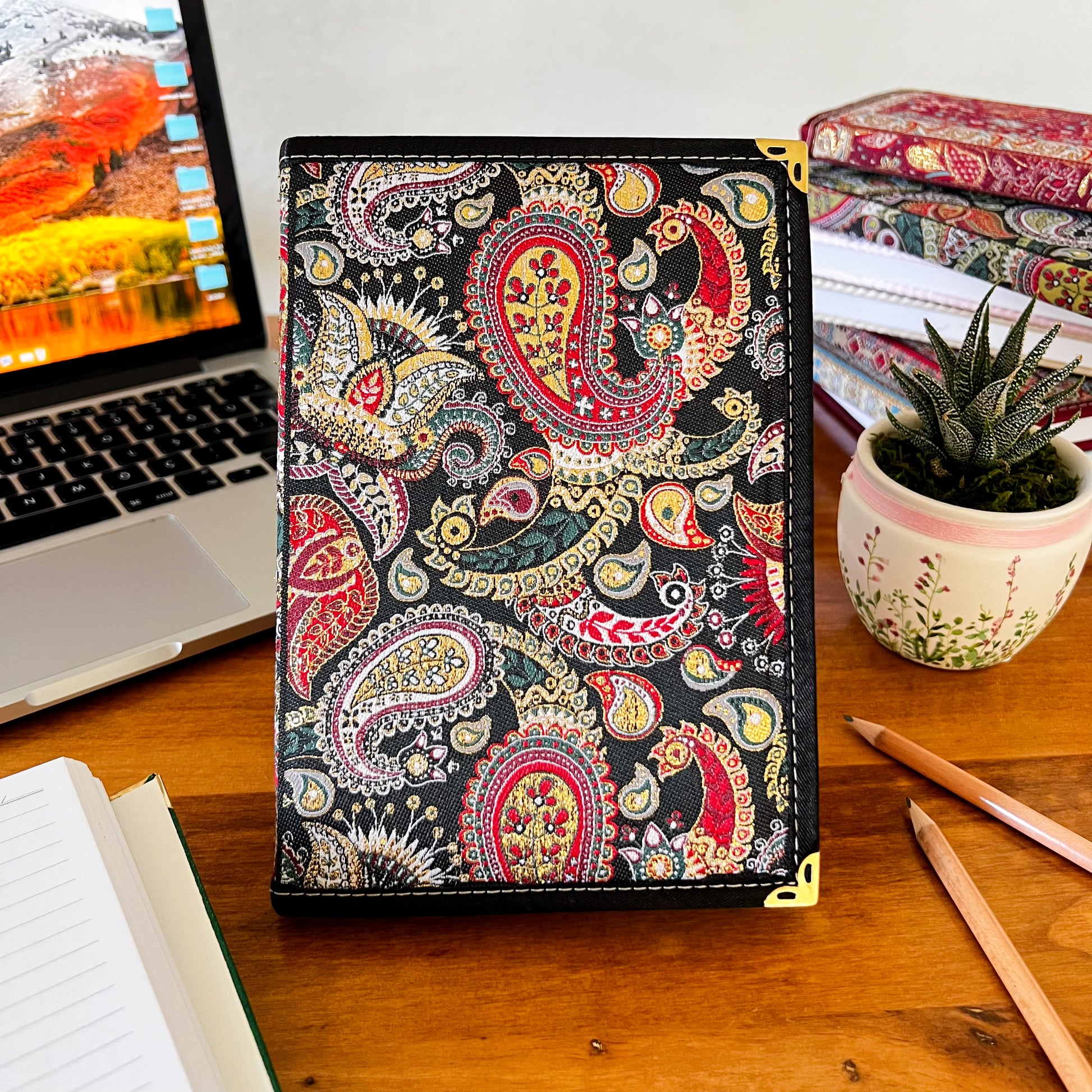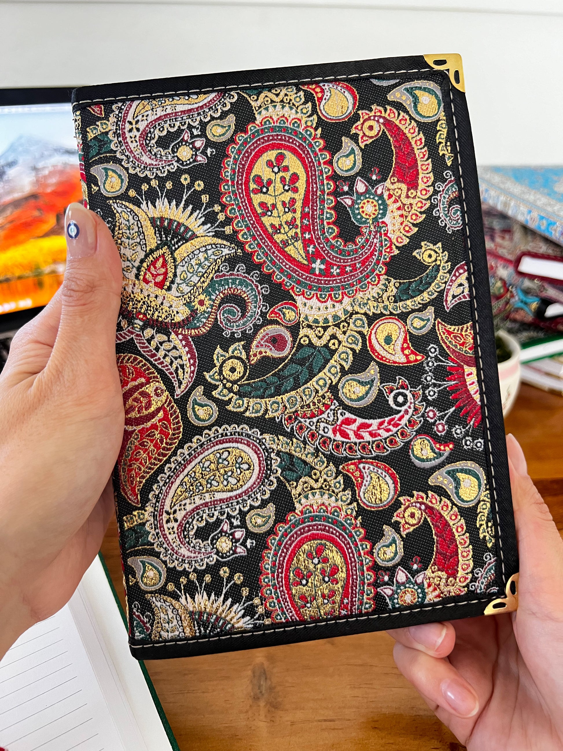 Our bohemian fabric notebooks are perfect as Diaries, Journals and a perfect companion for your work and meetings or school or even travels. Each boho notebook is filled with lined pages and has hardcover with Turkish carpet pattern designed brocade fabric on the top with a gold, glittery look and soft and luxurious touch.