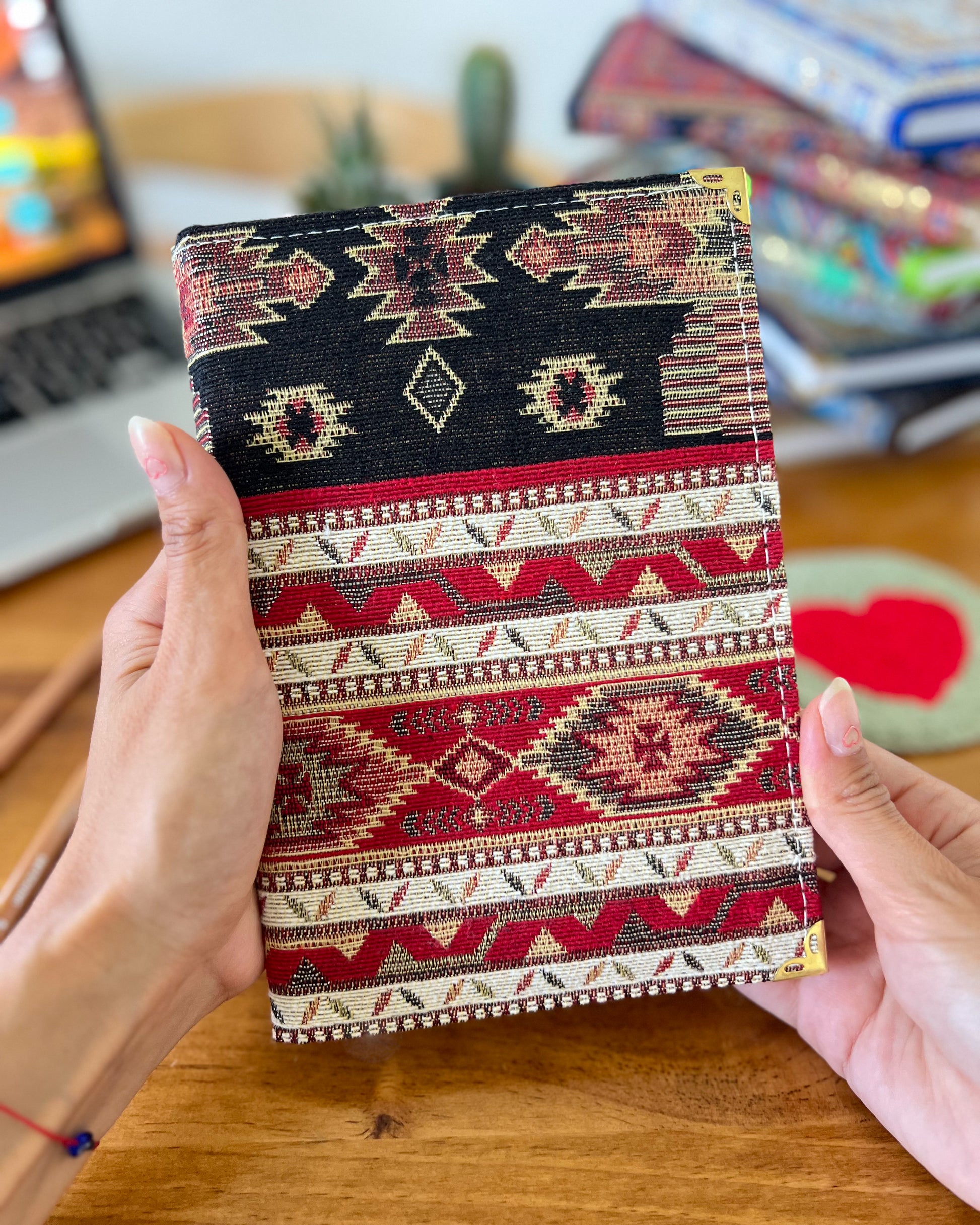 Our bohemian fabric notebooks are perfect for Diaries, Journals and a perfect companion for your work and meetings or school or even travels. Each boho notebook is filled with lined pages and has hardcover with Turkish carpet pattern designed brocade fabric on the top with a gold, glittery look and soft and luxurious touch.