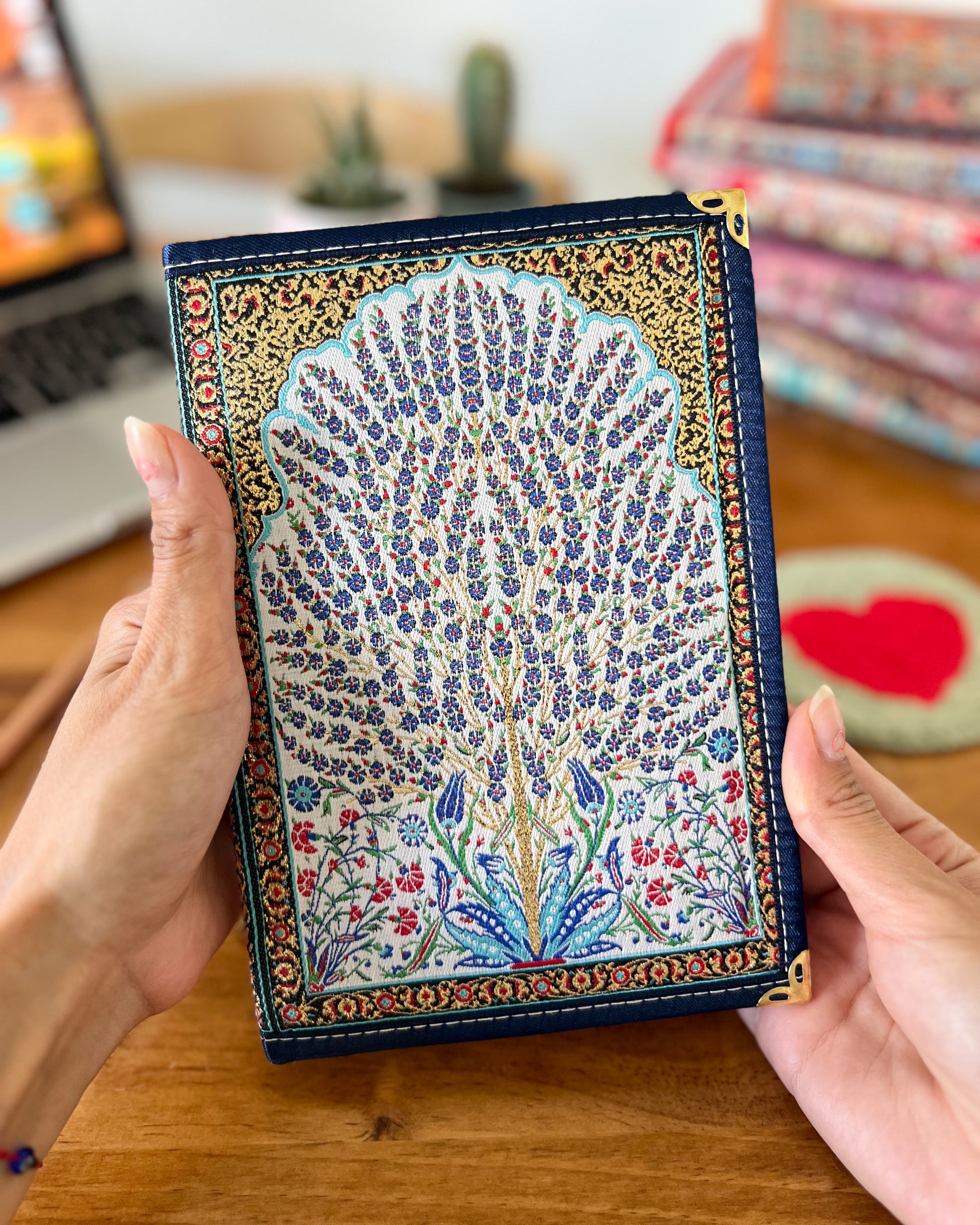 Our bohemian fabric notebooks are perfect for Diaries, Journals and a perfect companion for your work and meetings or school or even travels. Each boho notebook is filled with lined pages and has hardcover with Turkish carpet pattern designed brocade fabric on the top with a gold, glittery look and soft and luxurious touch.