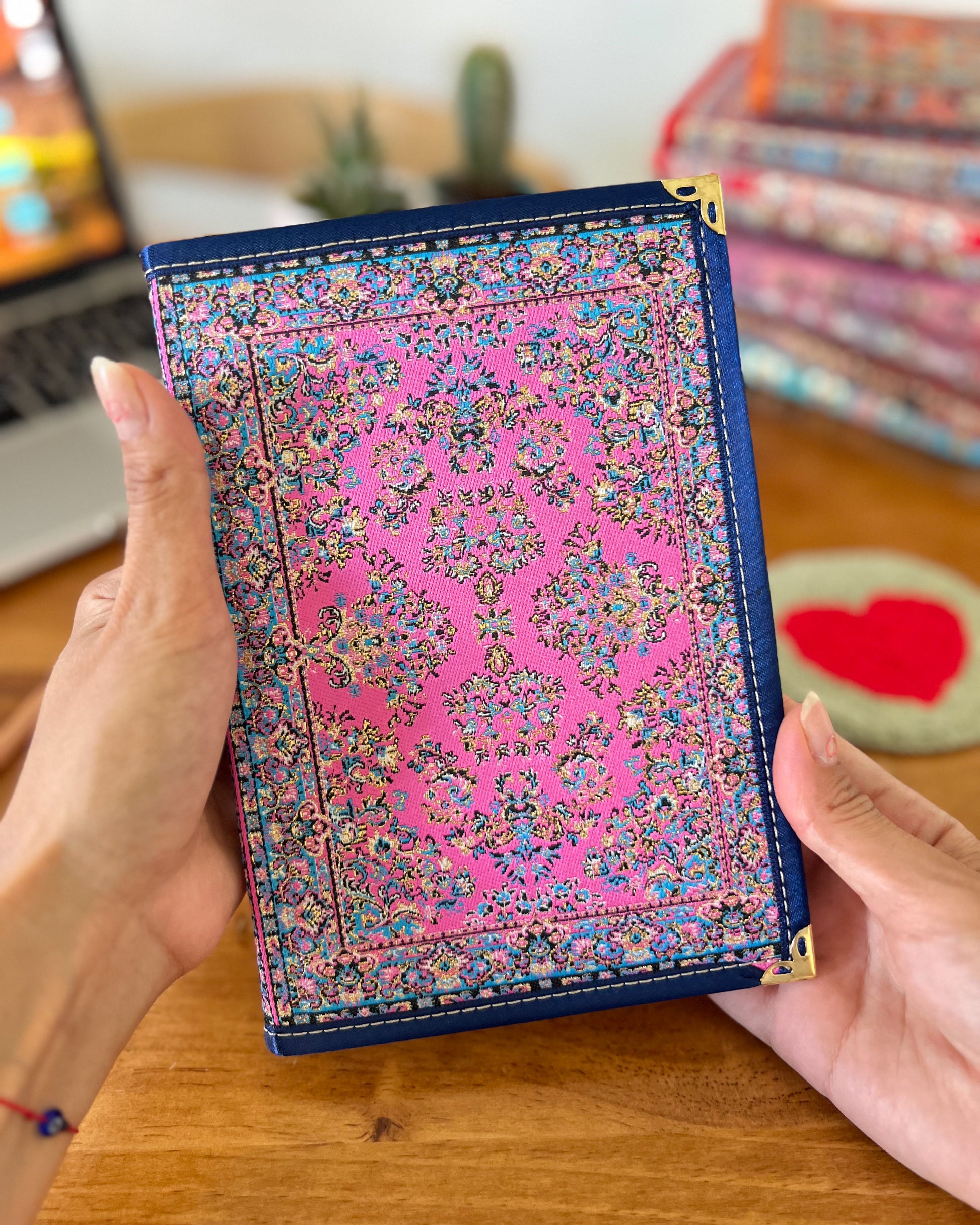 Our bohemian fabric notebooks are perfect for Diaries, Journals and a perfect companion for your work and meetings or school or even travels. Each boho notebook is filled with lined pages and has hardcover with Turkish carpet pattern designed brocade fabric on the top with a gold, glittery look and soft and luxurious touch.