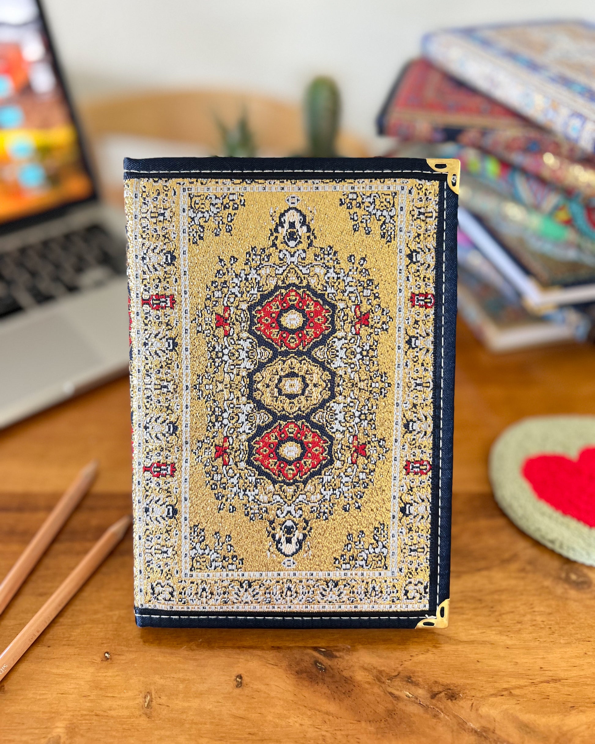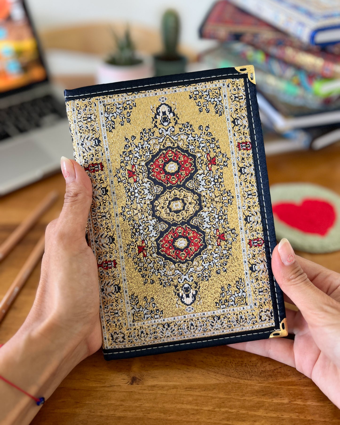 Our bohemian fabric notebooks are perfect for Diaries, Journals and a perfect companion for your work and meetings or school or even travels. Each boho notebook is filled with lined pages and has hardcover with Turkish carpet pattern designed brocade fabric on the top with a gold, glittery look and soft and luxurious touch.