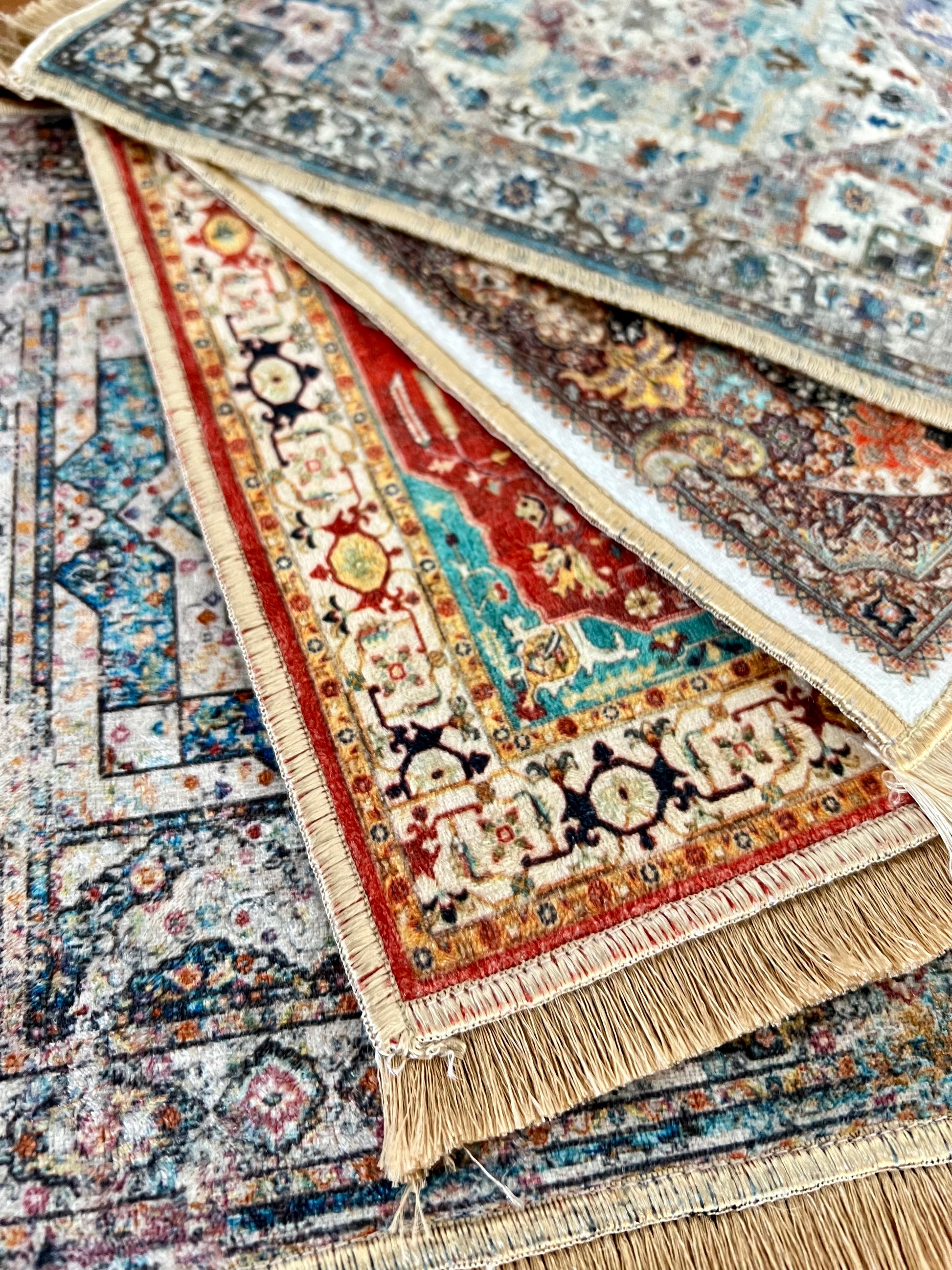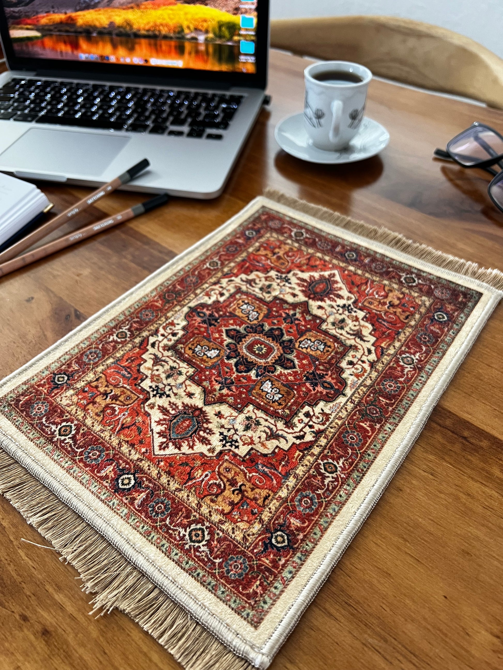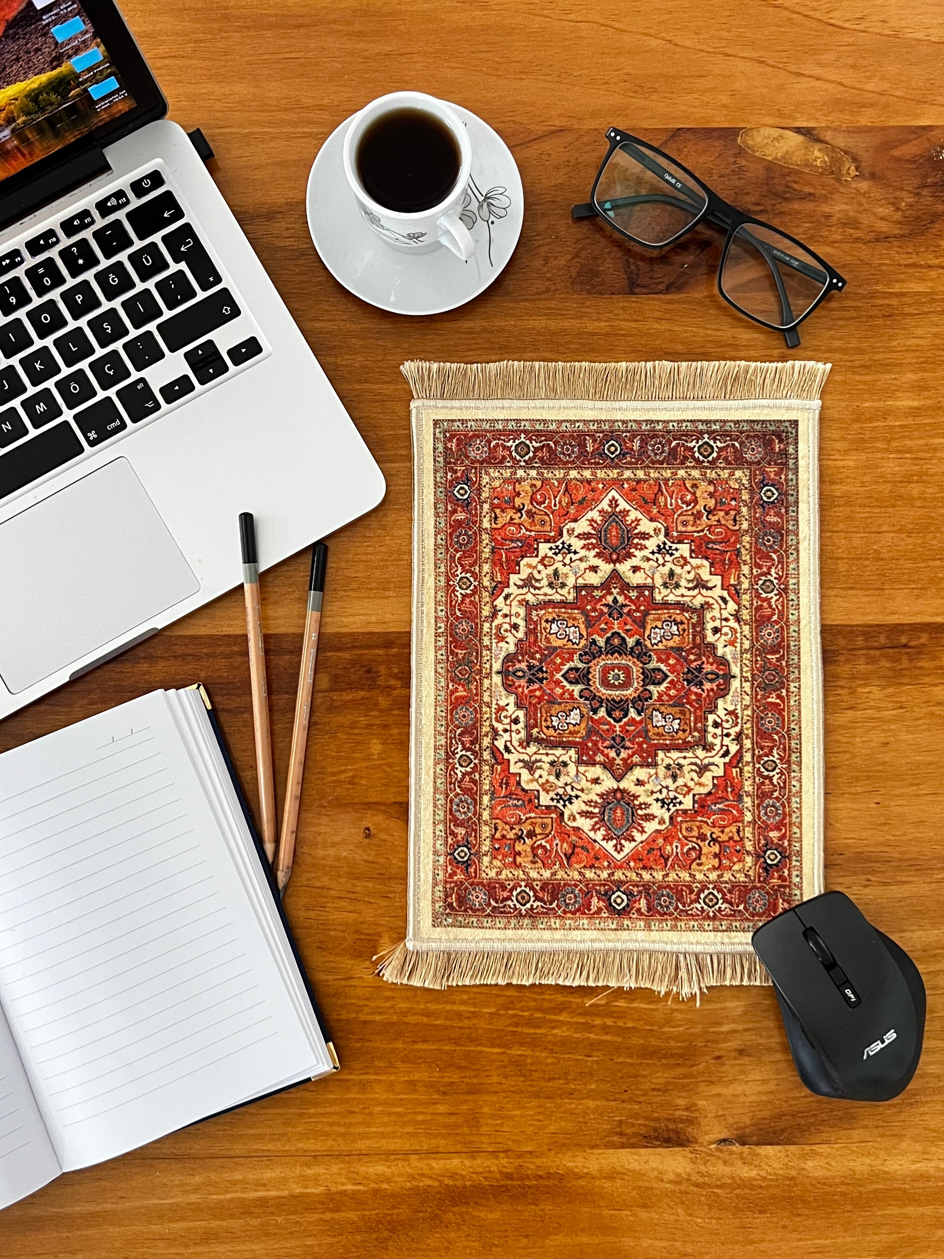 Turkish rug design mouse pads give your offices and home offices vintage and stylish look. You can use them as mouse pads, doll house rugs, coffee table mats and miniature rugs. It is a great gift for coworkers, teachers and home office workers. Also, it is a unique desk accessory for whom likes to be different.