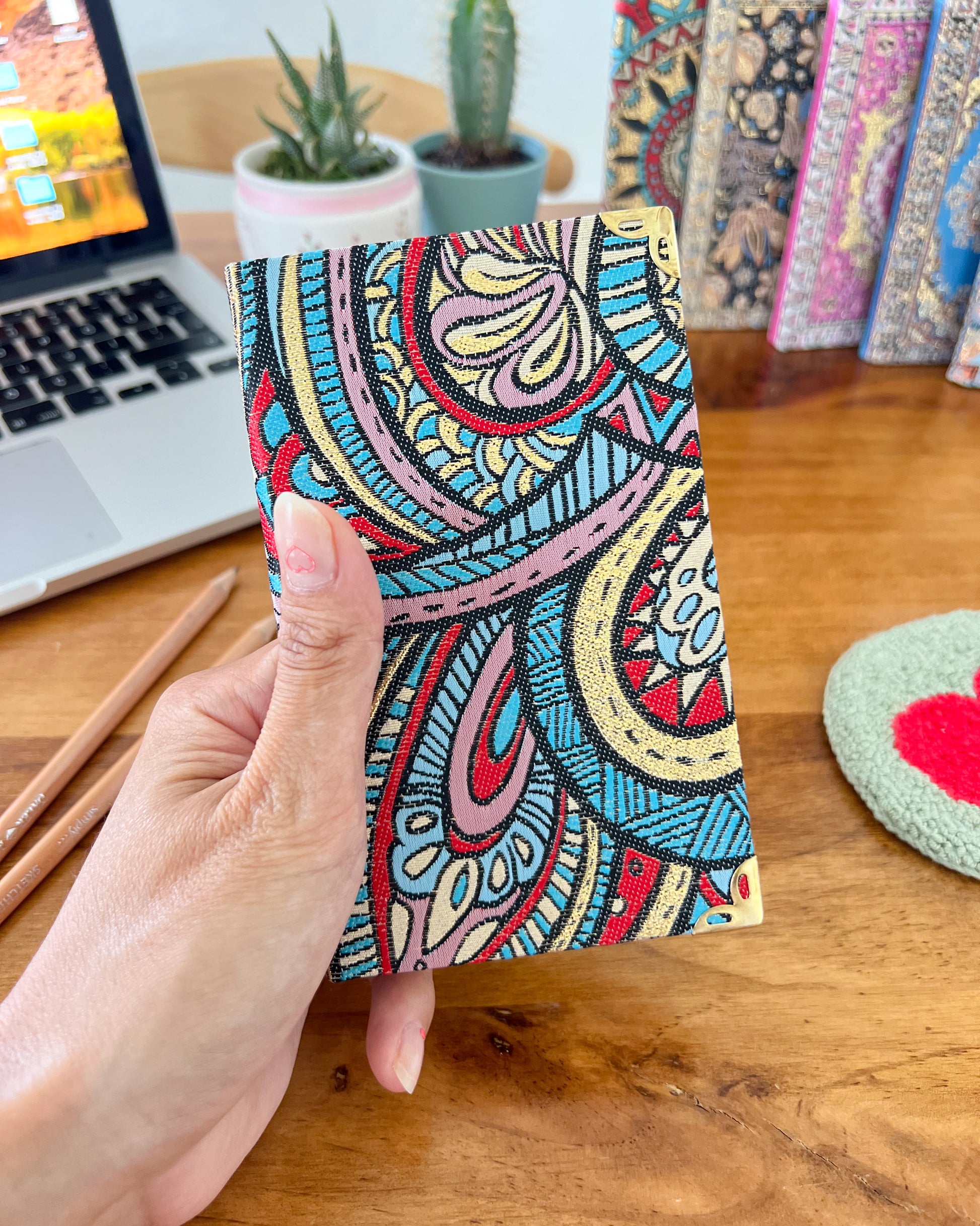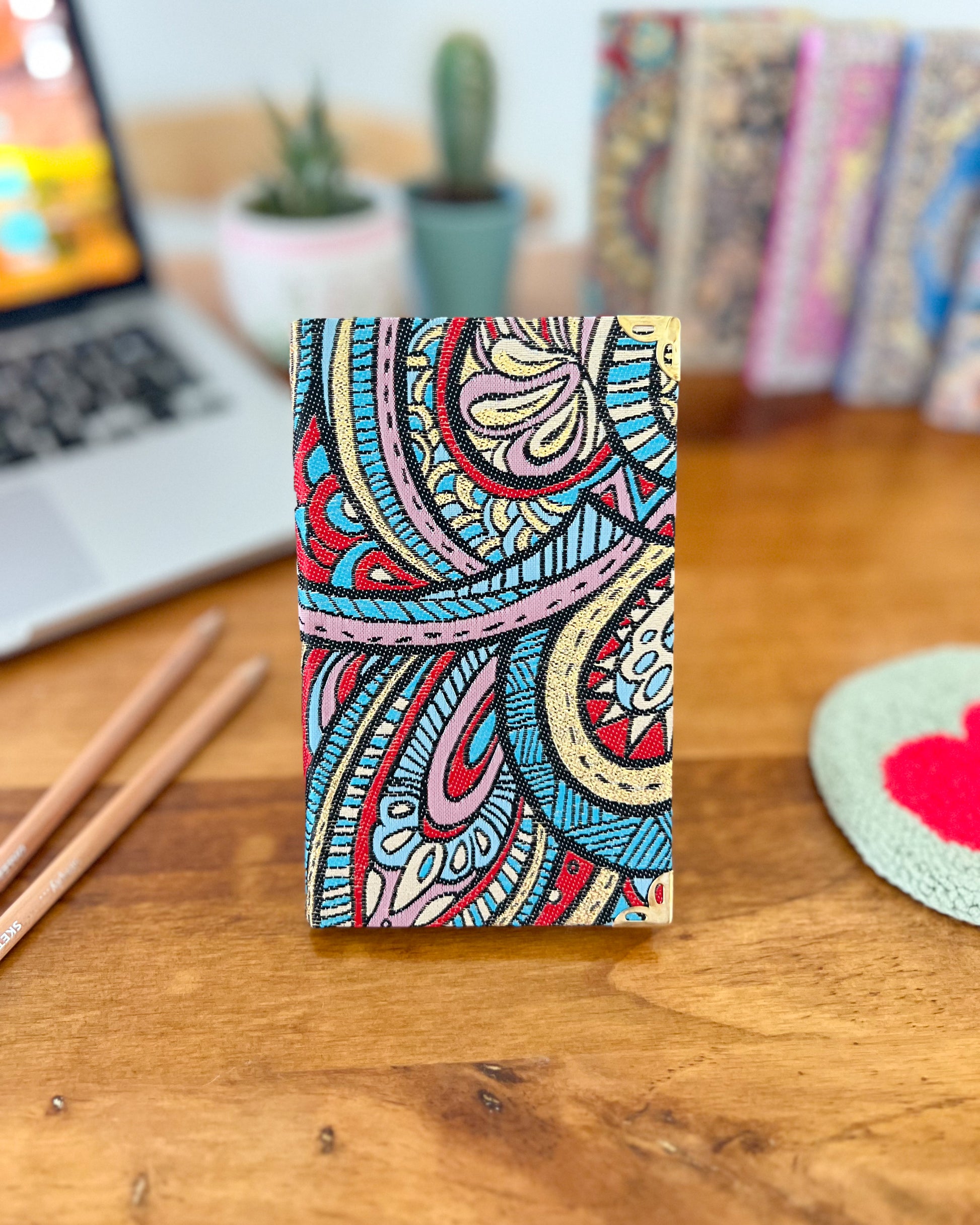 Our bohemian small fabric notebook is perfect for note-takers, travelers and as a pocket journal. You can take it with you for your work and meetings or school. Each notebook is filled with lined pages and has hardcover with Turkish carpet pattern designed brocade fabric on the top with a gold, glittery look and soft and luxurious touch.